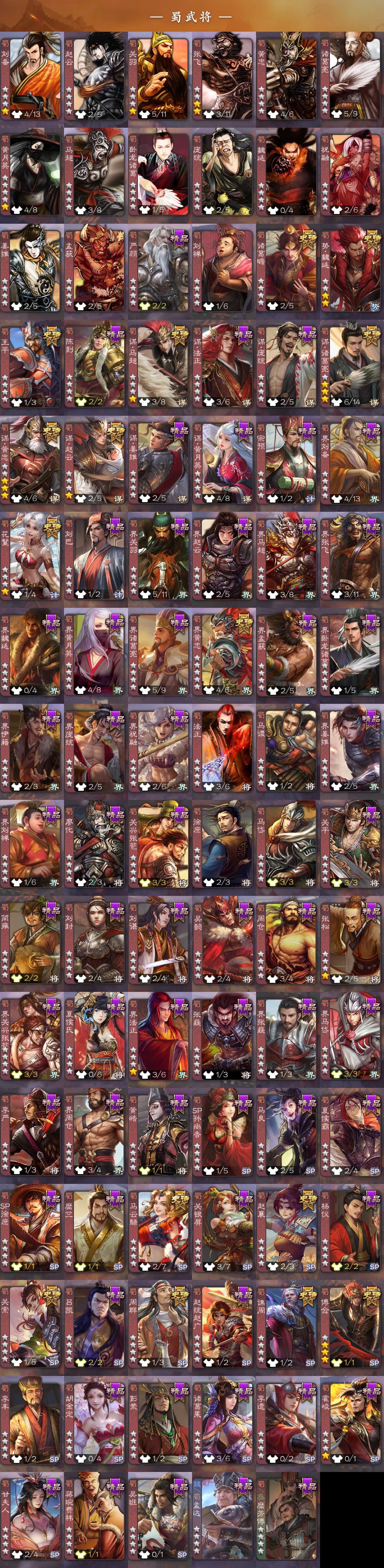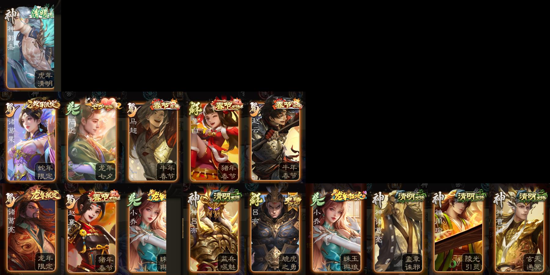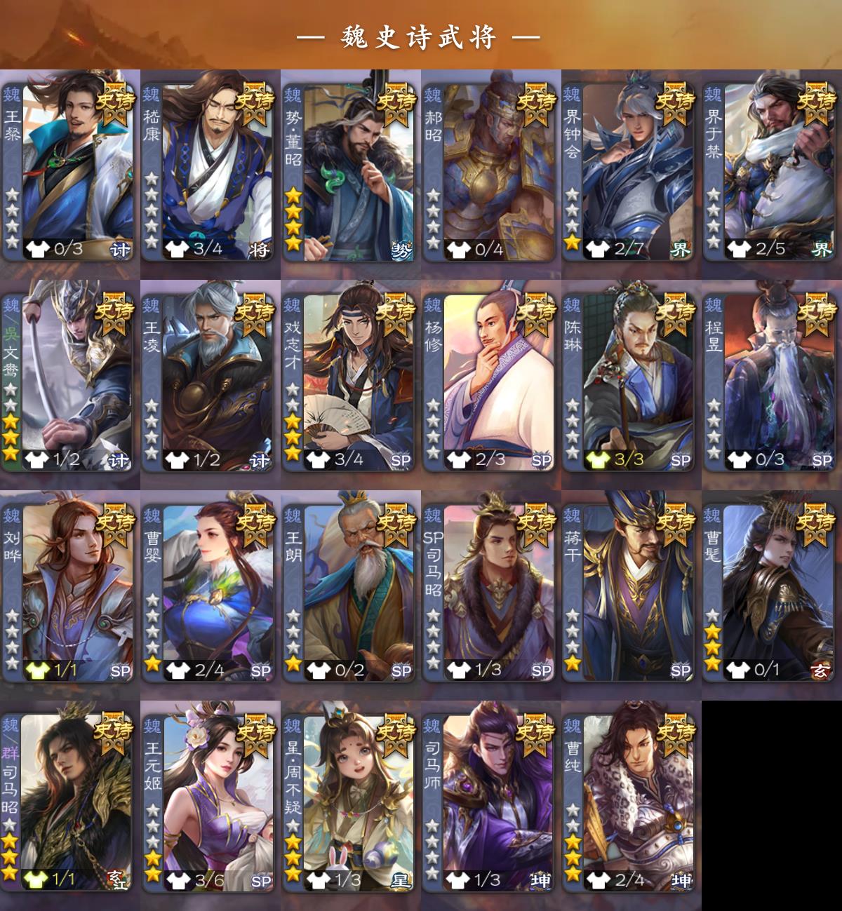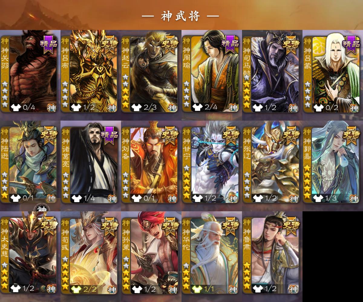 神吕布,神赵云,神司马懿,神陆逊,神刘备,神甘宁,神张辽,神郭嘉,神太史慈,神孙策,神荀彧,神华佗,神诸葛亮,神鲁肃,SP司马昭,曹髦,星周不疑,王粲,杨修,王凌,王朗,司马