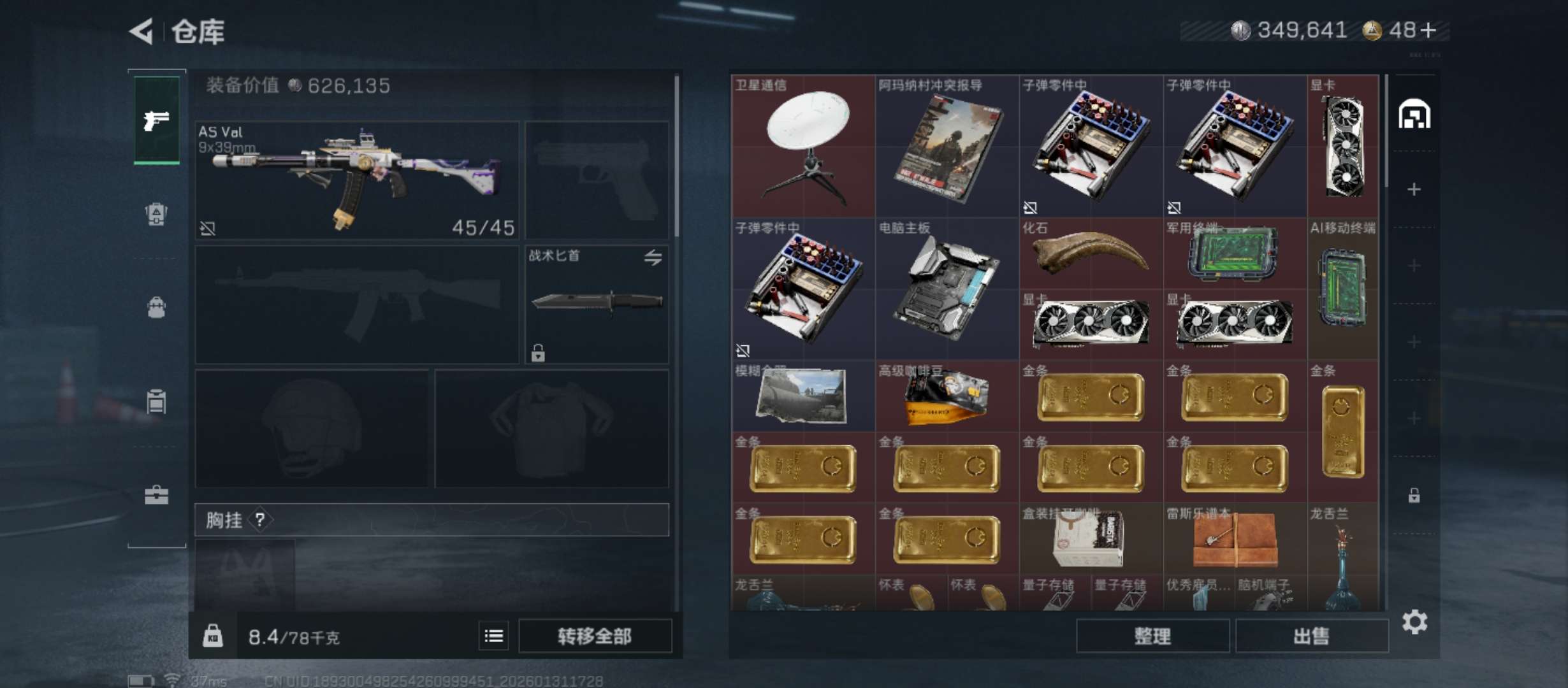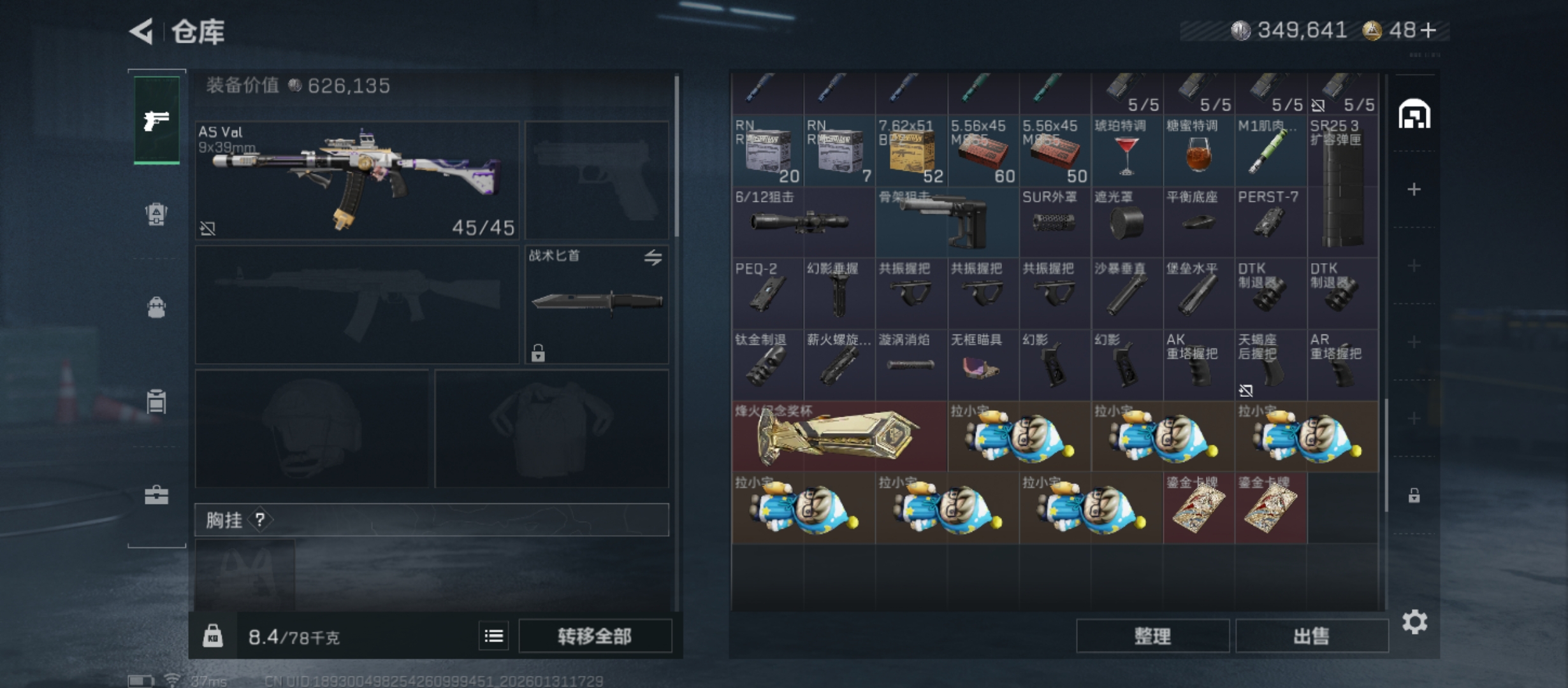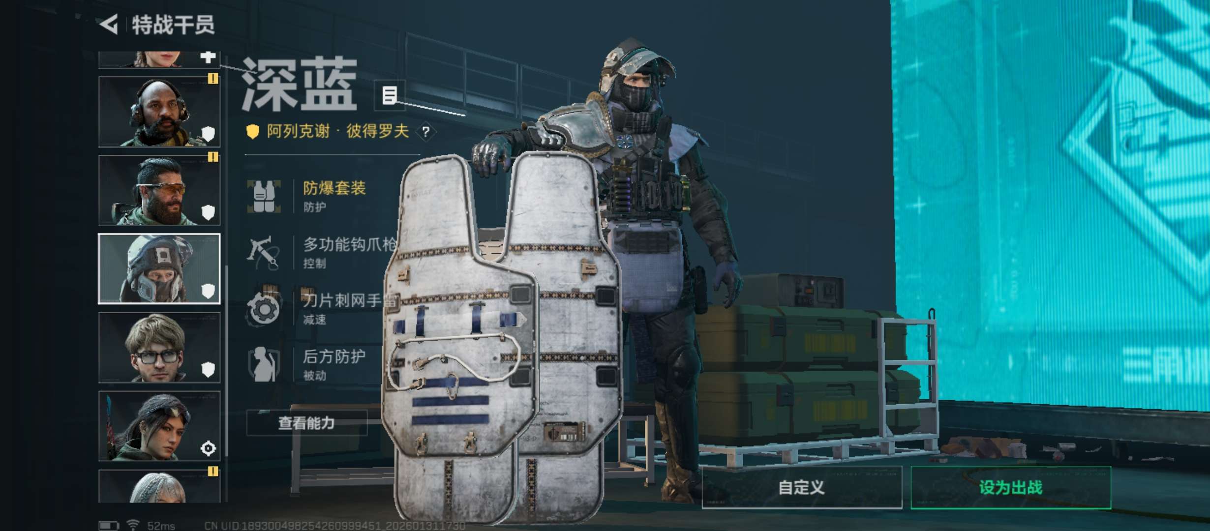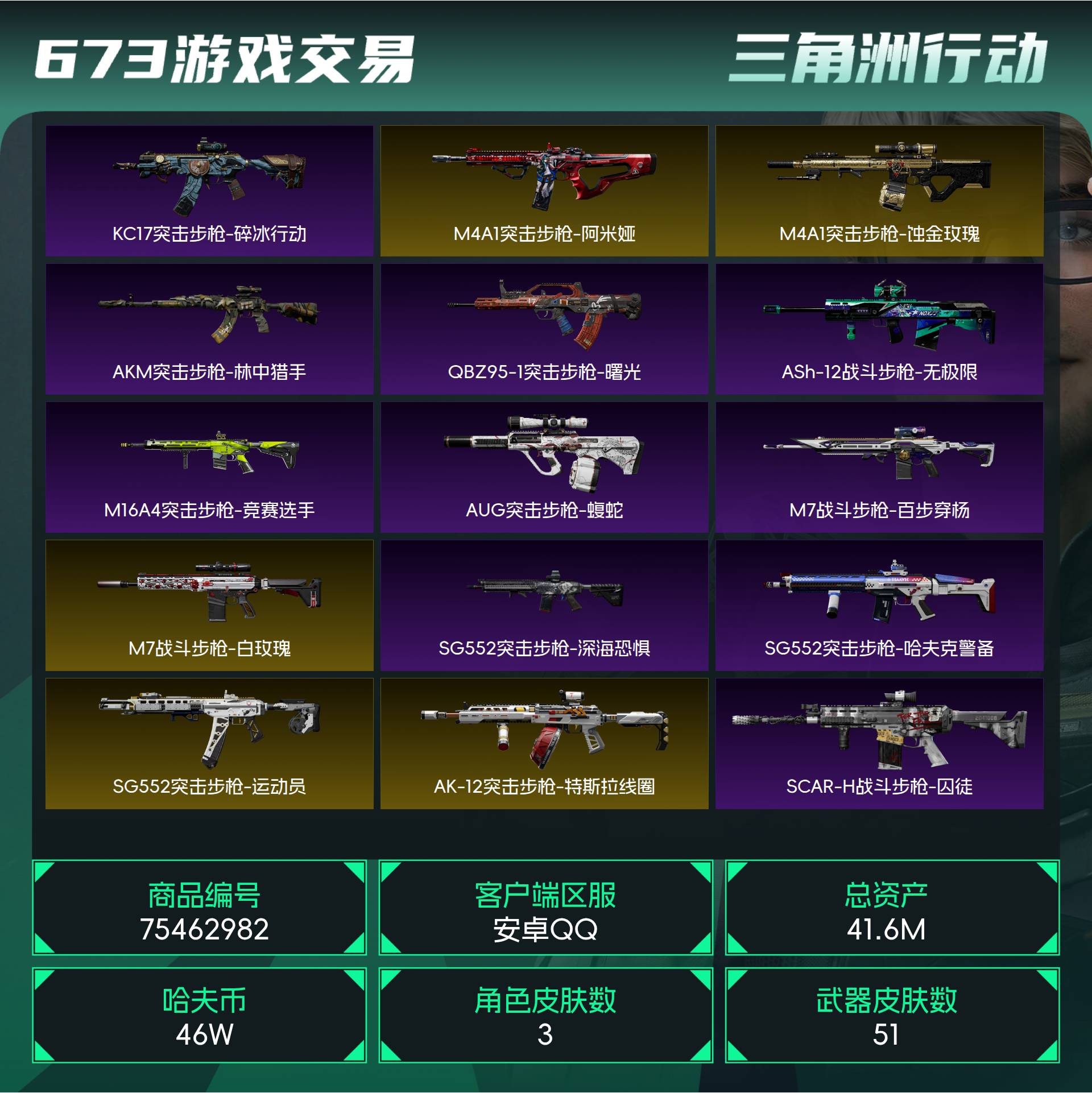 烽火段位钻石4 战场段位上等兵1 总资产41.6M 哈夫币46W 干员3 挂饰16 近战1 枪械51 载具11