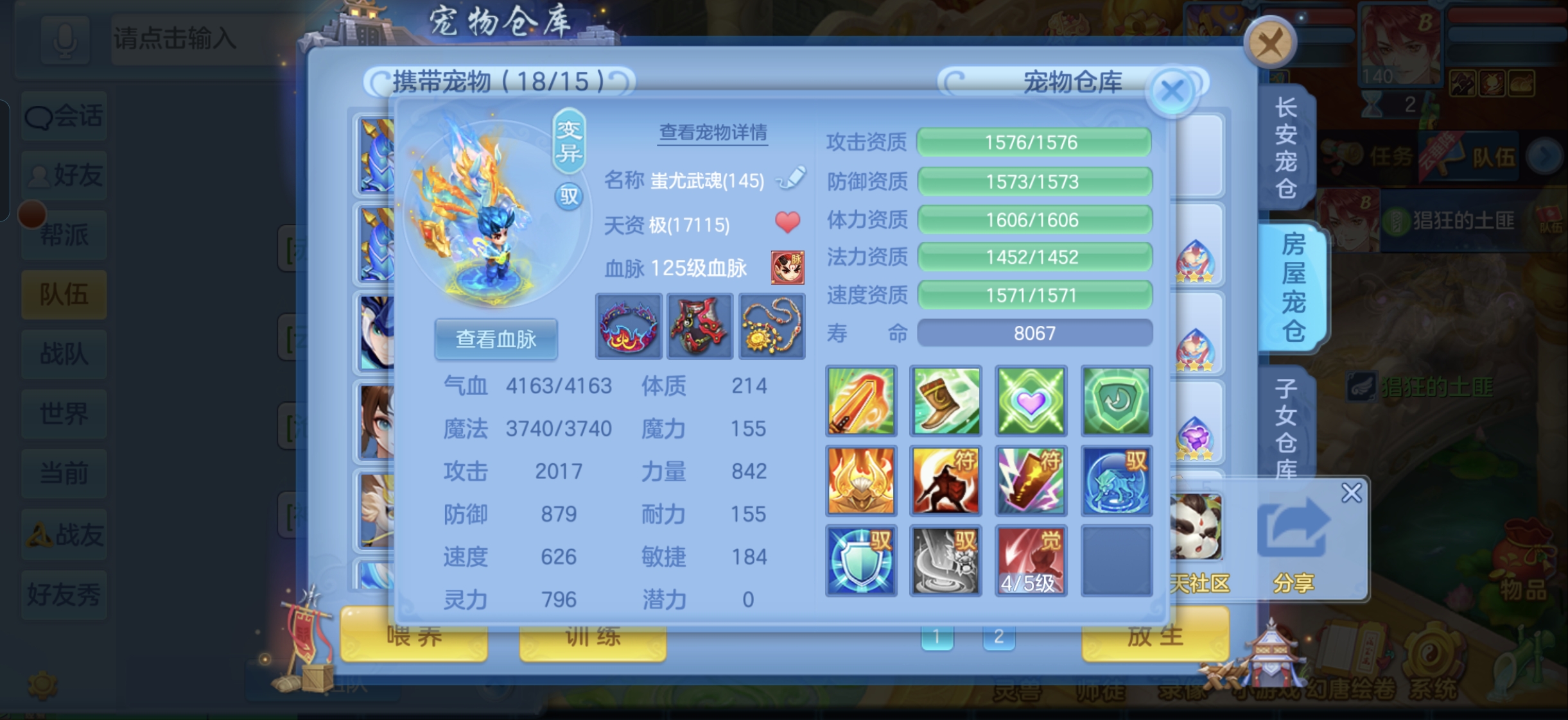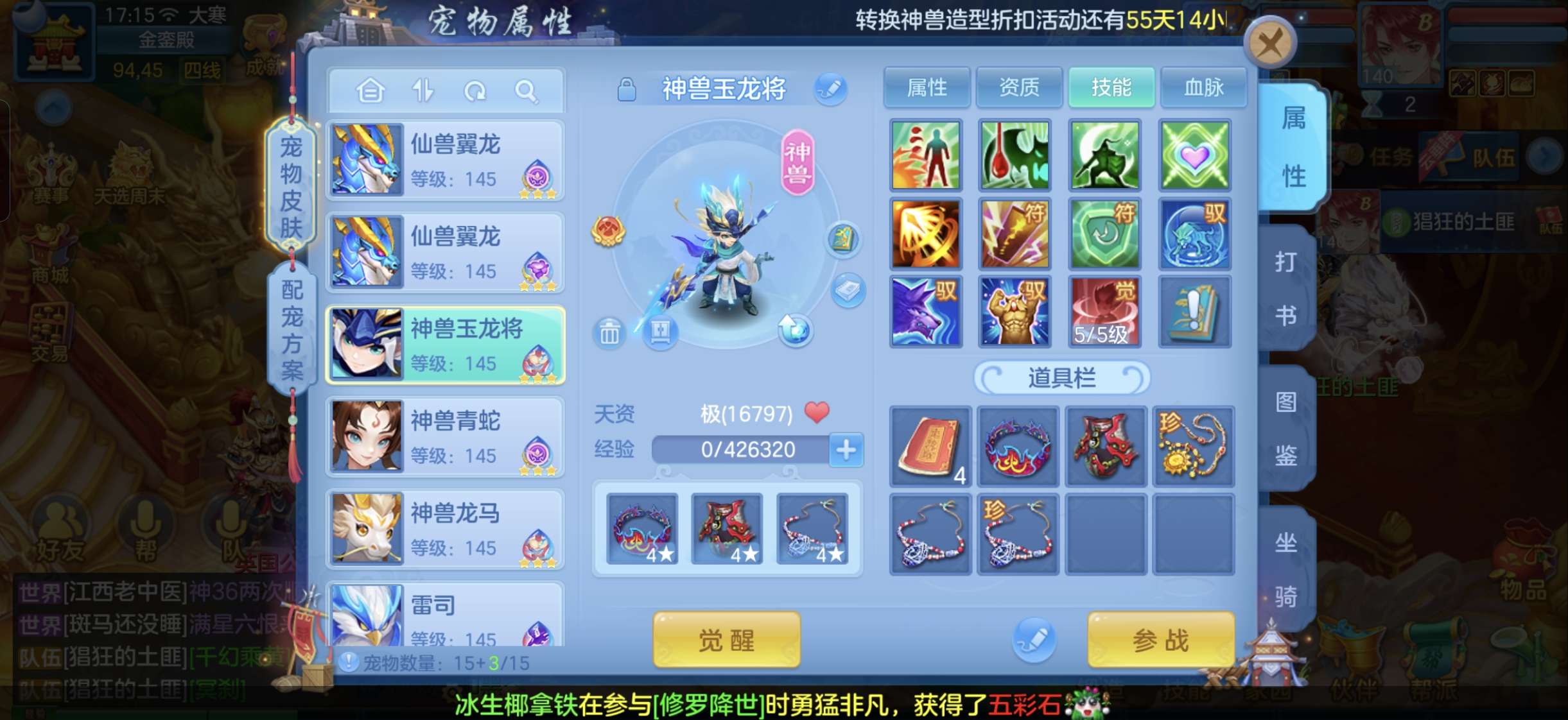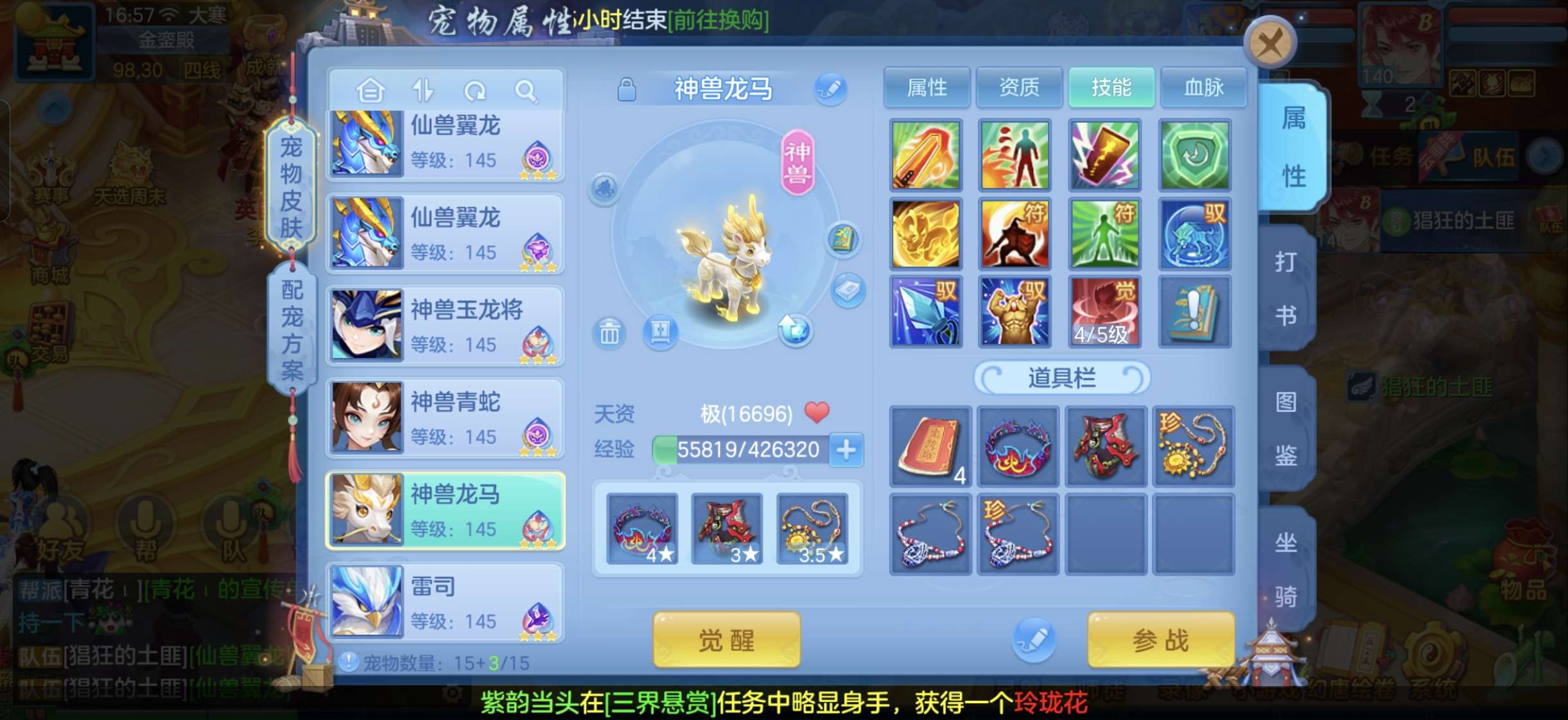 全身14段,双仙(一满强化),三神蛇,玉龙,小马。各种极品宝宝齐全,天赋专属齐全超多,宝宝全部满兽魂