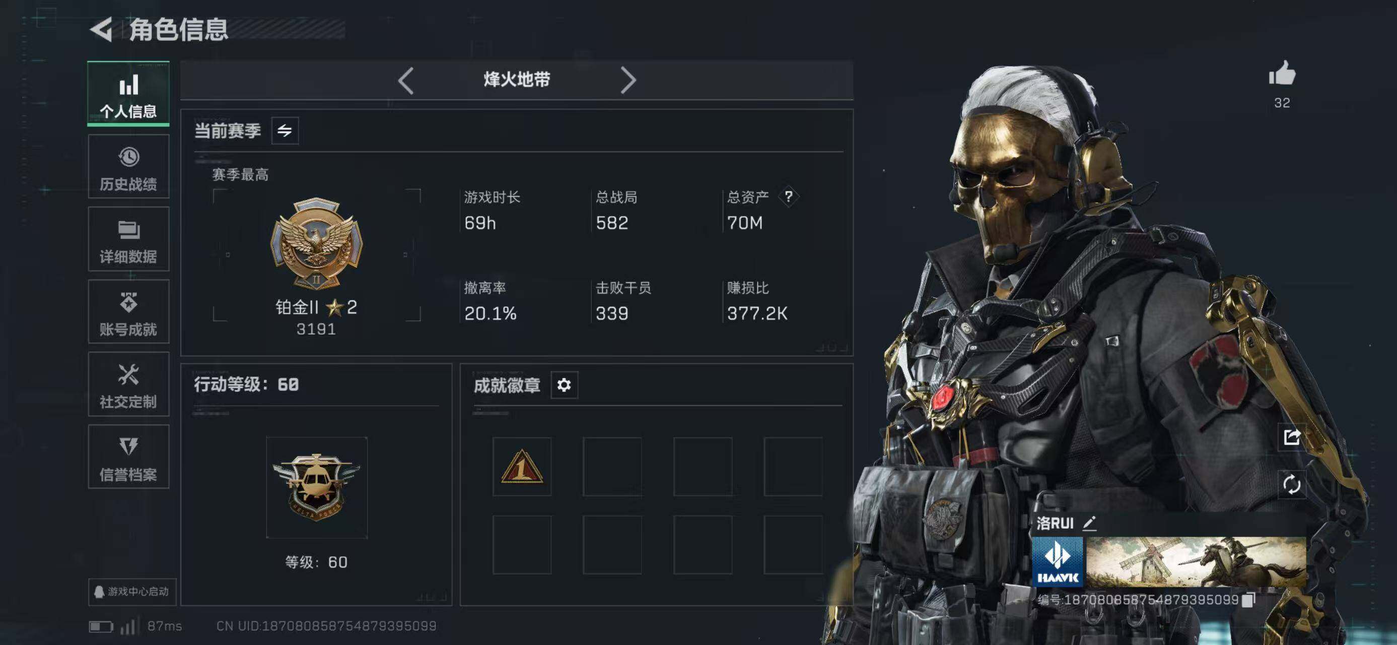 LJ3587总资产70M哈弗币22962K近战武器-黑鹰红狼蚀金玫瑰,蛊能天使午夜邮差无无AW子弹0发三角币仓库LV.6S7顶级安全箱靶场LV.4训练中心LV.4无,红狼-蚀金玫瑰,蛊-能天使午夜邮差,近战-黑鹰