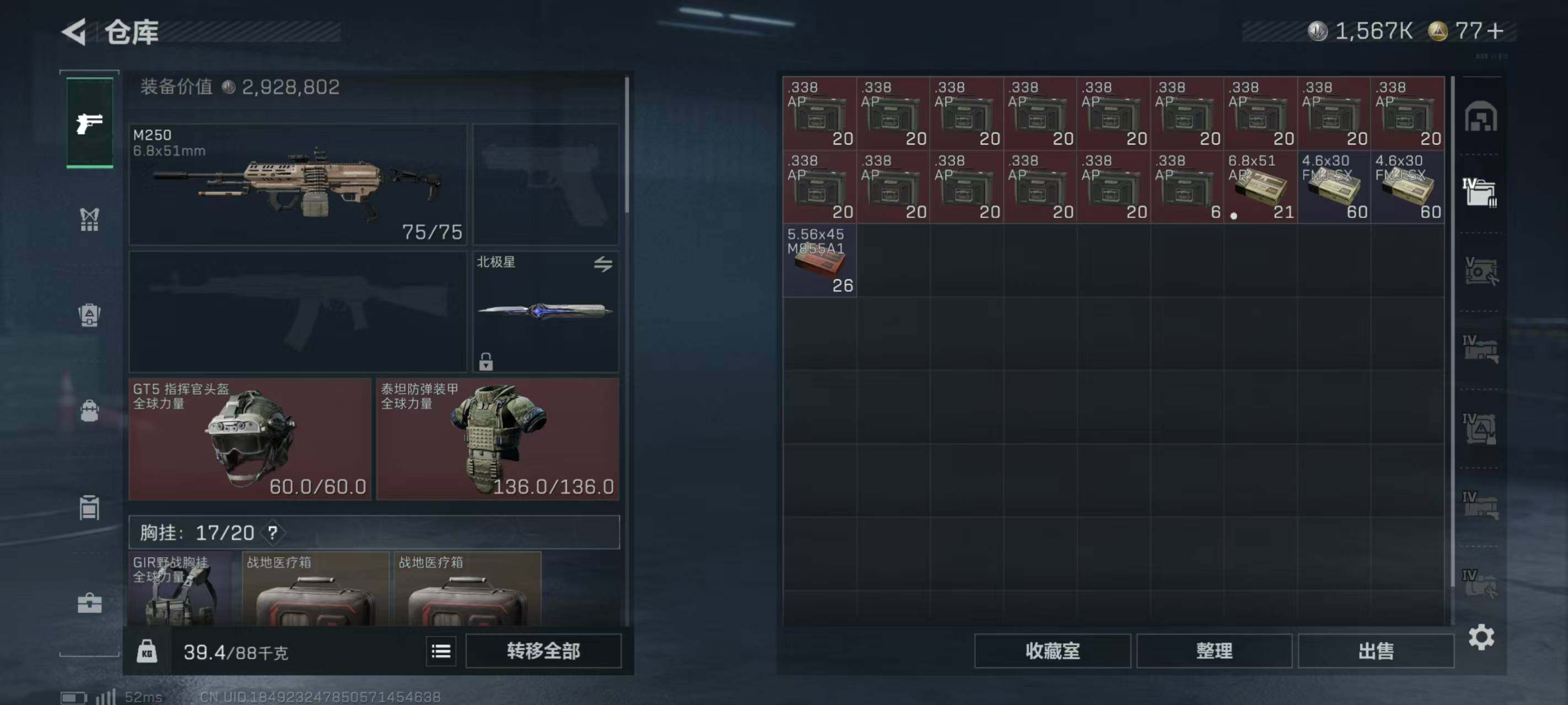 LJ3684总资产295.8M哈弗币1567K近战武器-北极星,近战武器-电锯惊魂红狼电锯惊魂无无AW子弹286发三角币77仓库LV.8基础安全箱靶场LV.7训练中心LV.7无,红狼-电锯惊魂,近战-北极星,近战-电锯惊魂