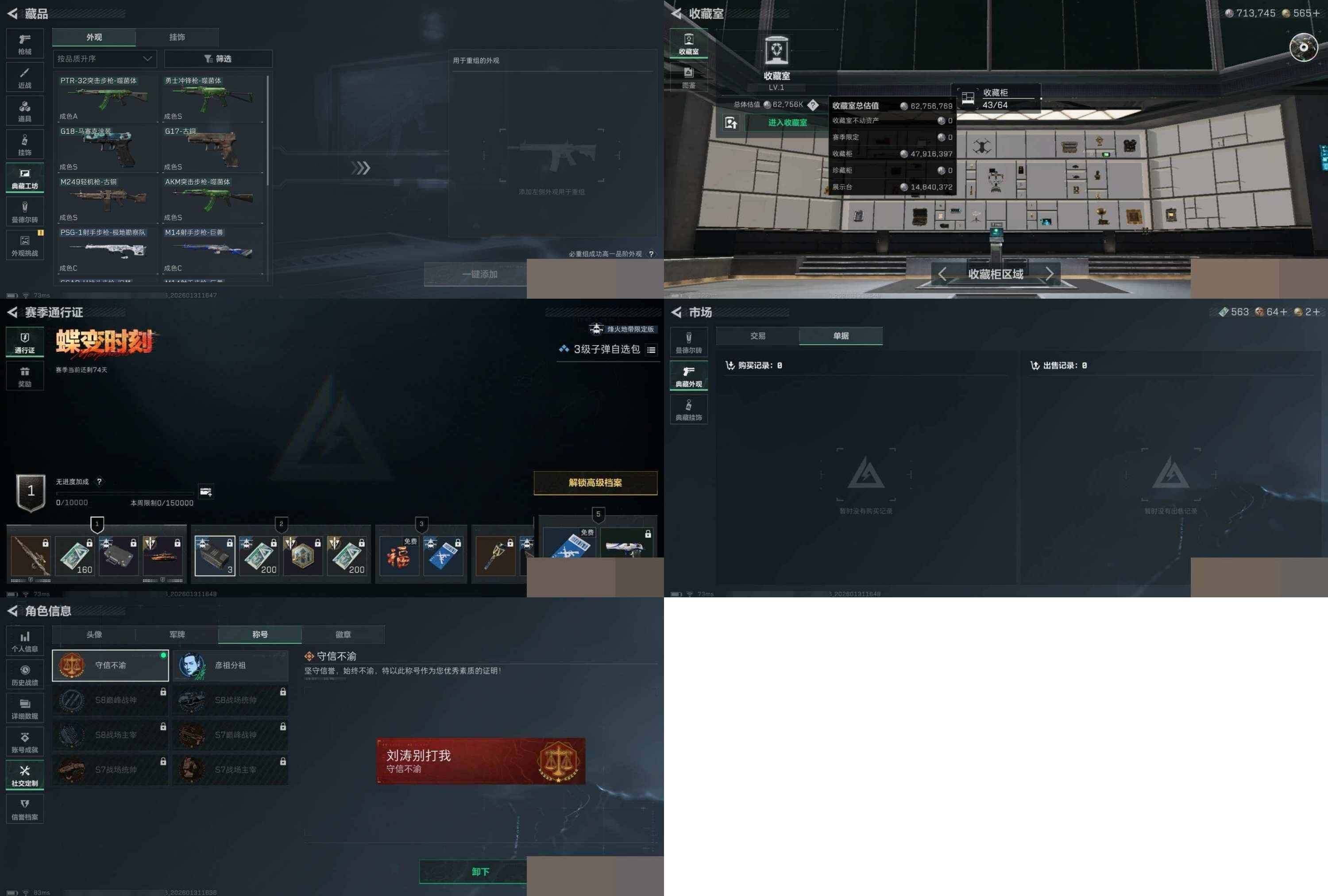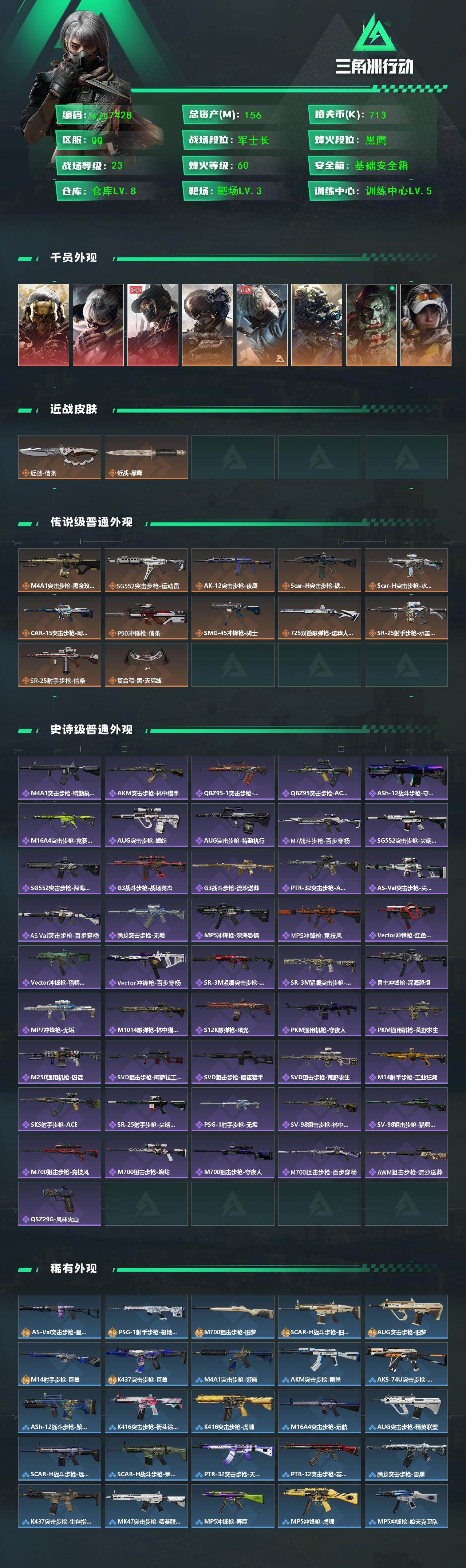 【sjs7428】总资产 150m 红狼 露娜 水墨 信条 烽火地带段位: 黑鹰 全面战场段位: 军士长 总资产: 156000000 哈夫币: 713000 sjs7428 干员外观: 红狼-蚀金玫瑰,威龙-壮志凌云(S3),骇爪-水墨云图,无名-夜鹰(S4),蜂医-送葬人·无题密令(S5),露娜-黑·天际线,红狼-电锯惊魂,露娜-金牌射手(S7) 传说武器皮肤: M4A1突击步枪-蚀金玫瑰,SCAR-H战斗步枪-铁艺苍穹,SR-25射手步枪-水墨云图,SCAR-H战斗步枪-水墨云图,AK-