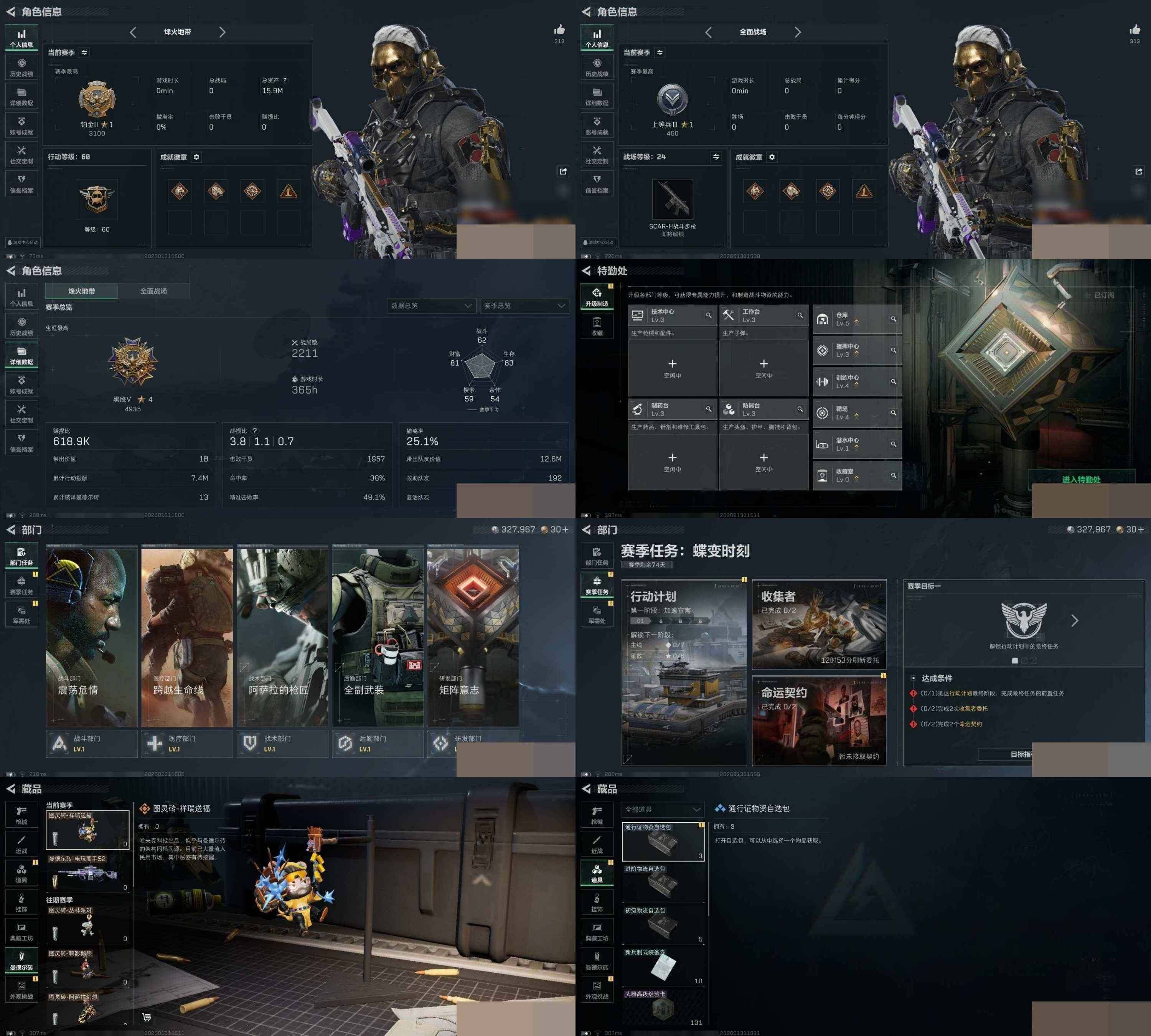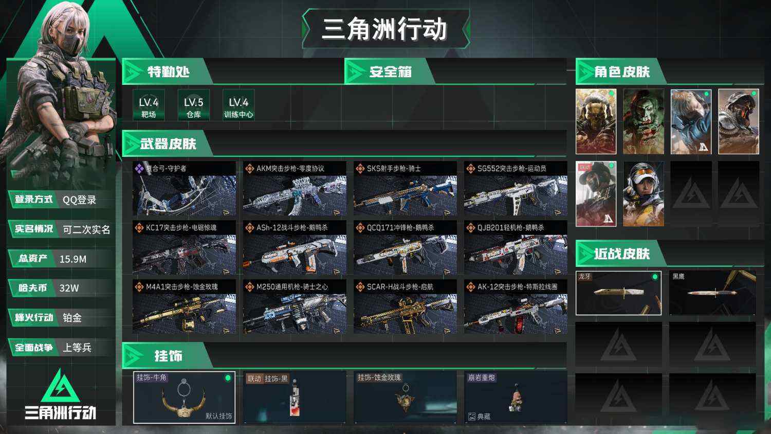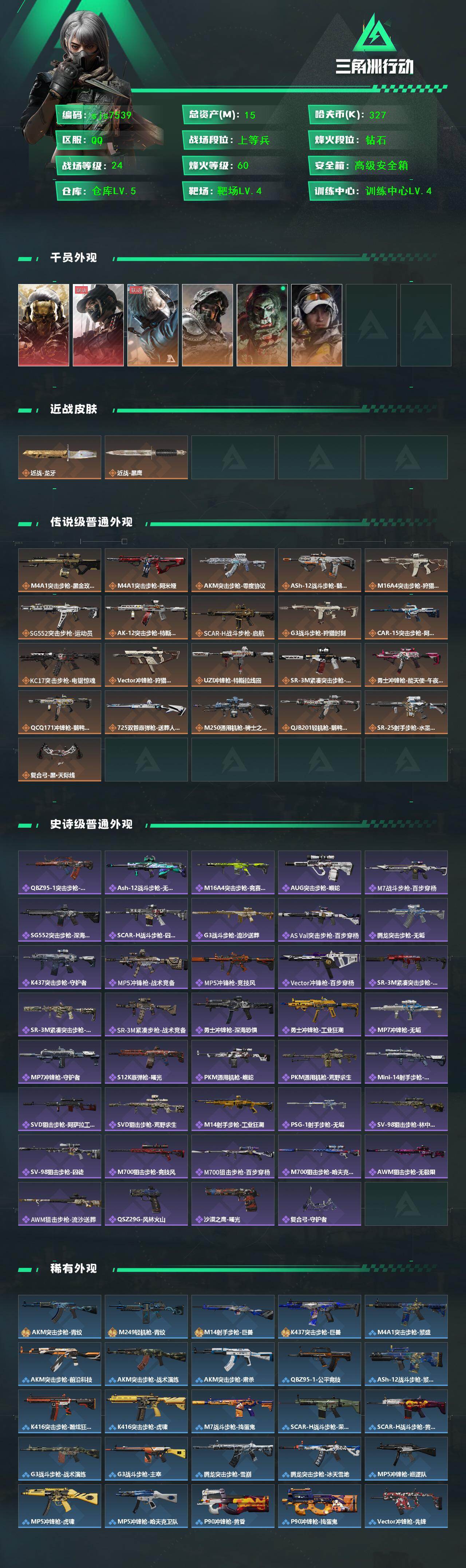 【sjs7539】总资产15m 红狼 露娜 龙牙 烽火地带段位: 钻石 全面战场段位: 上等兵 总资产: 15000000 哈夫币: 327000 sjs7539 干员外观: 红狼-蚀金玫瑰,蜂医-送葬人·无题密令(S5),露娜-黑·天际线,深蓝-不破誓约(S6),红狼-电锯惊魂,露娜-金牌射手(S7) 传说武器皮肤: M4A1突击步枪-蚀金玫瑰,AKM突击步枪-零度协议,SR-25射手步枪-水墨云图,725双管霰弹枪-送葬人-无题密令,M4A1突击步枪-阿米娅,CAR-15突击步枪-阿米娅,复