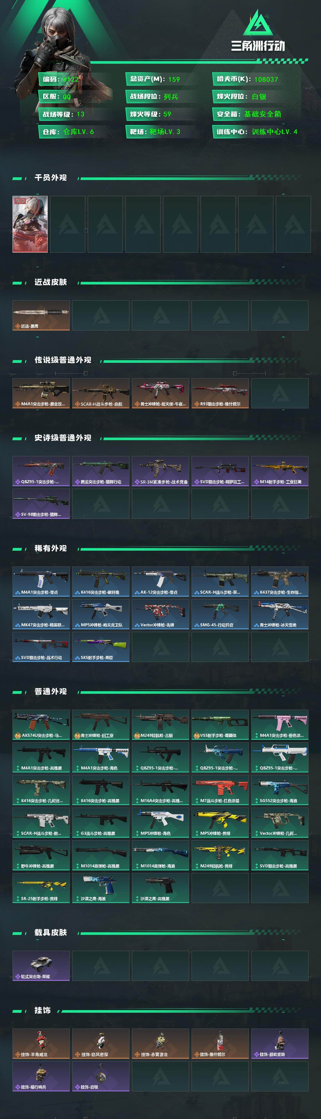 159m总资产-108037k哈伏币-59烽火等级-白银-13战场等级-列兵