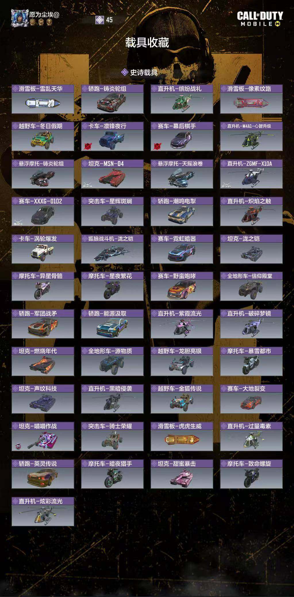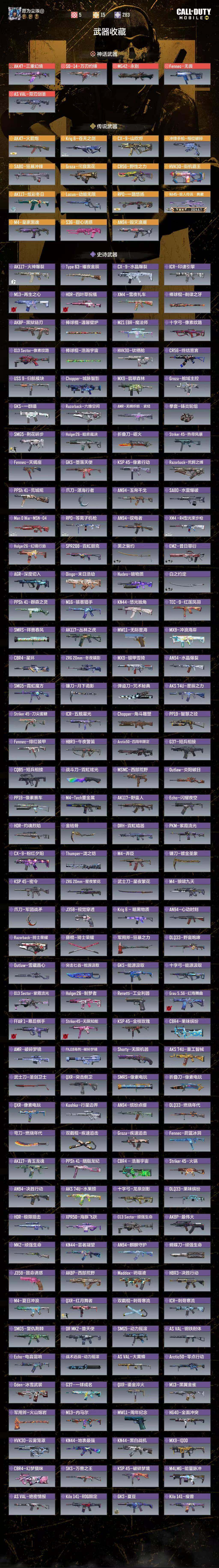 有二次 5神话 1满级神话 ,15传说武器 AK47-三重幻境 S0-14-万刃灼锋,AK47-三重幻境,MG42-永别,Fennec-无畏,AS VAL-双刃剑圣,AK47-火箭炮 Krig6-苍天之剑,CX-9-山吹烬, 冲锌手枪一相位破碎 ,SA80-狂暴冲锋, Groza-伟寂黑花,CR56-野性之力, HVK30街机露王 ,AK117-炫彩冬日,AK47-火箭炮,Locus-动