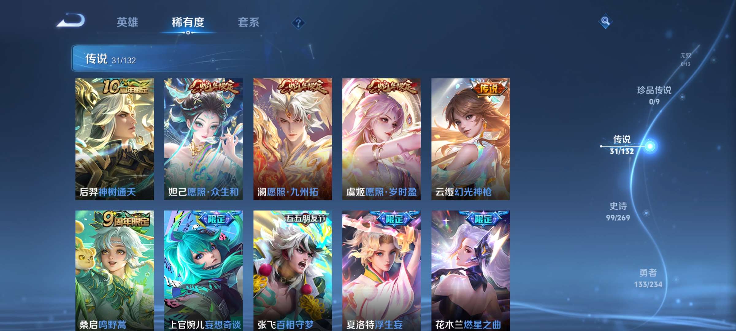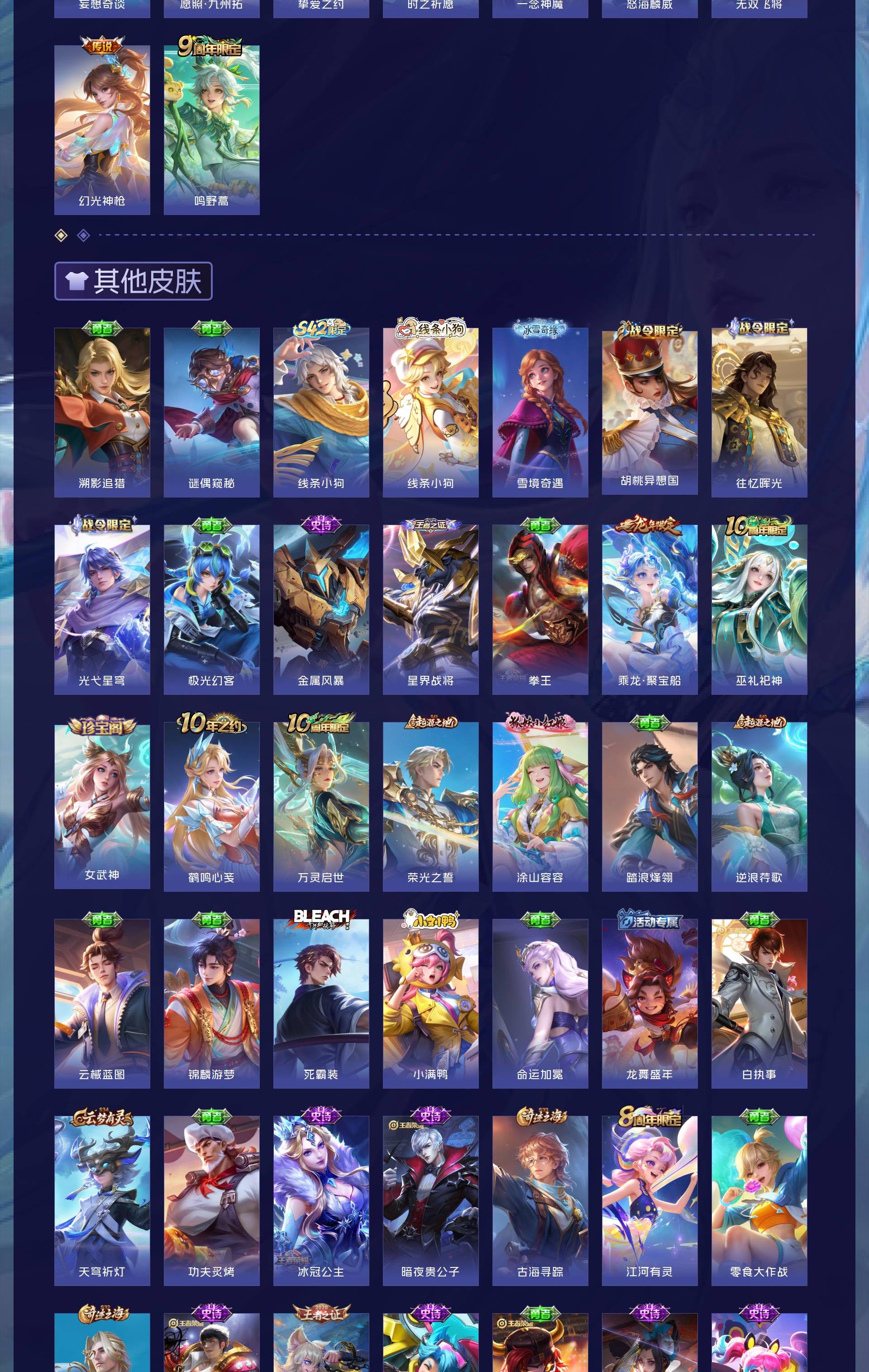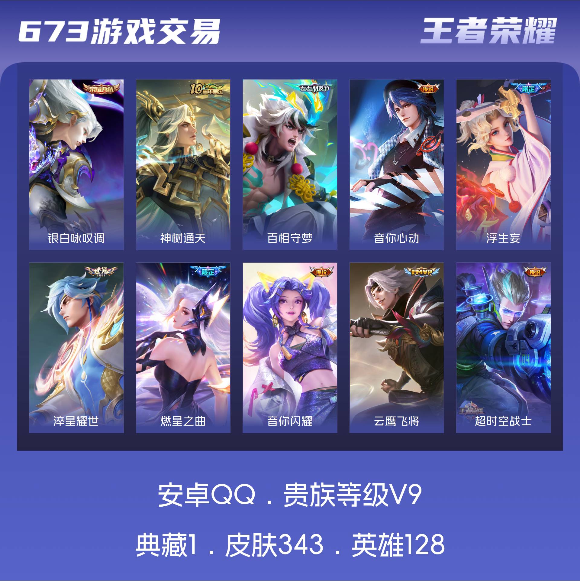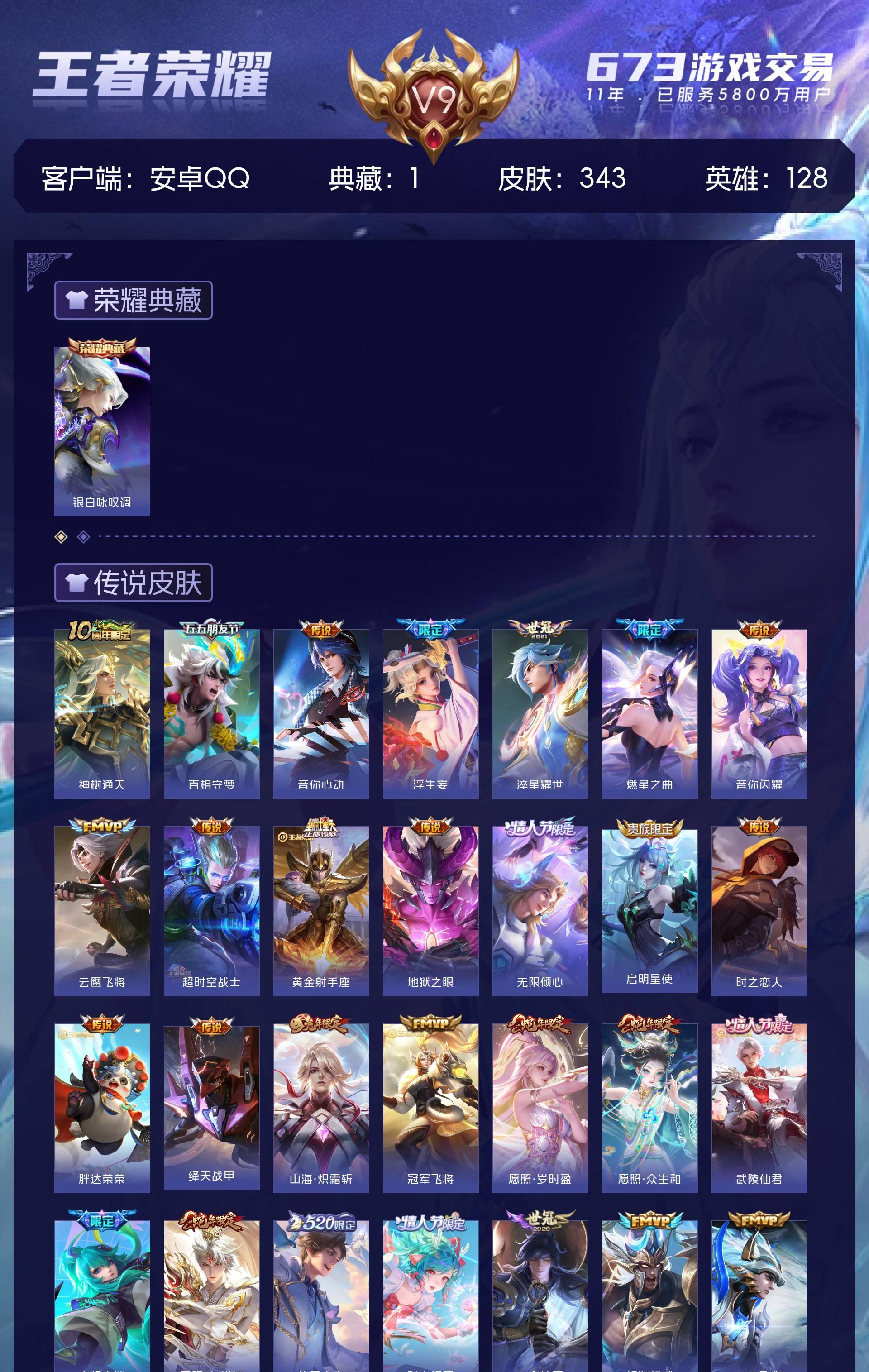 V9 皮肤343 英雄128 至尊星耀 荣耀典藏1 传说30 其他皮肤317