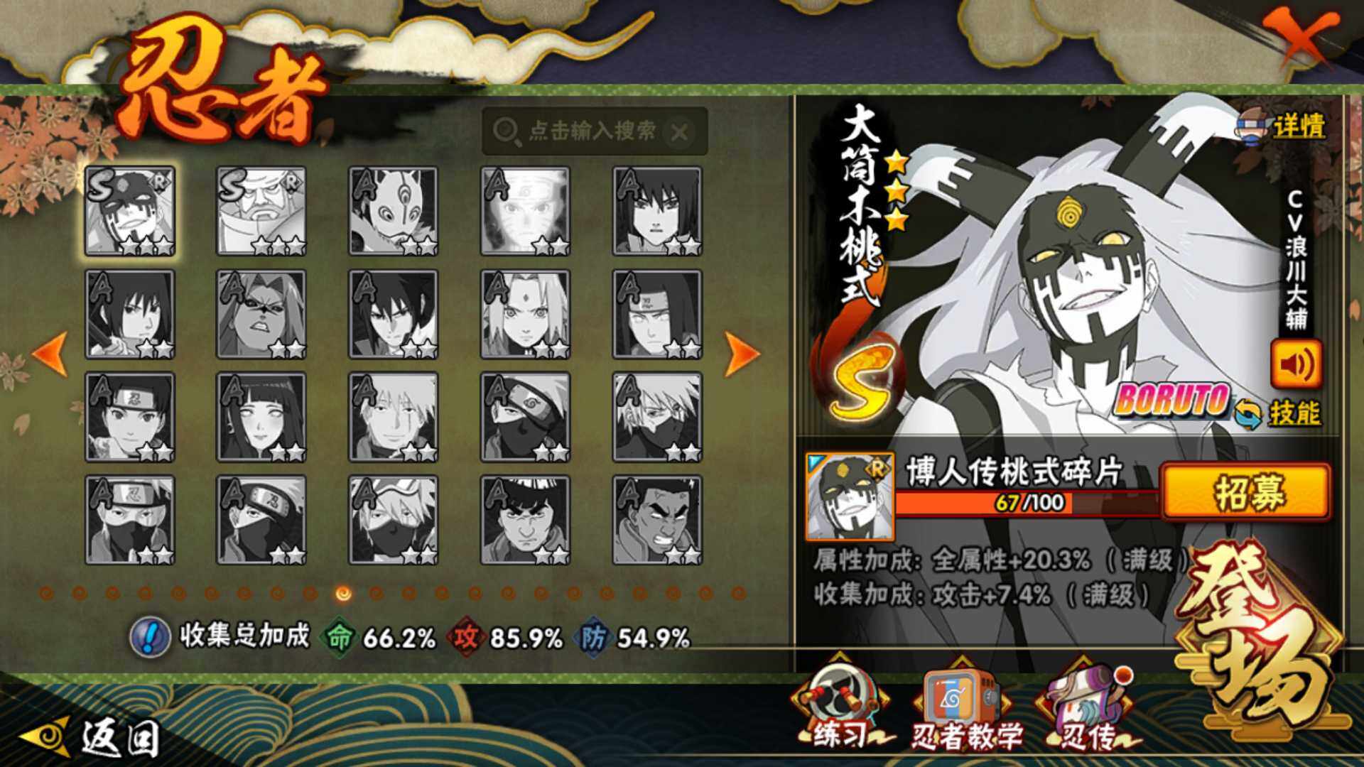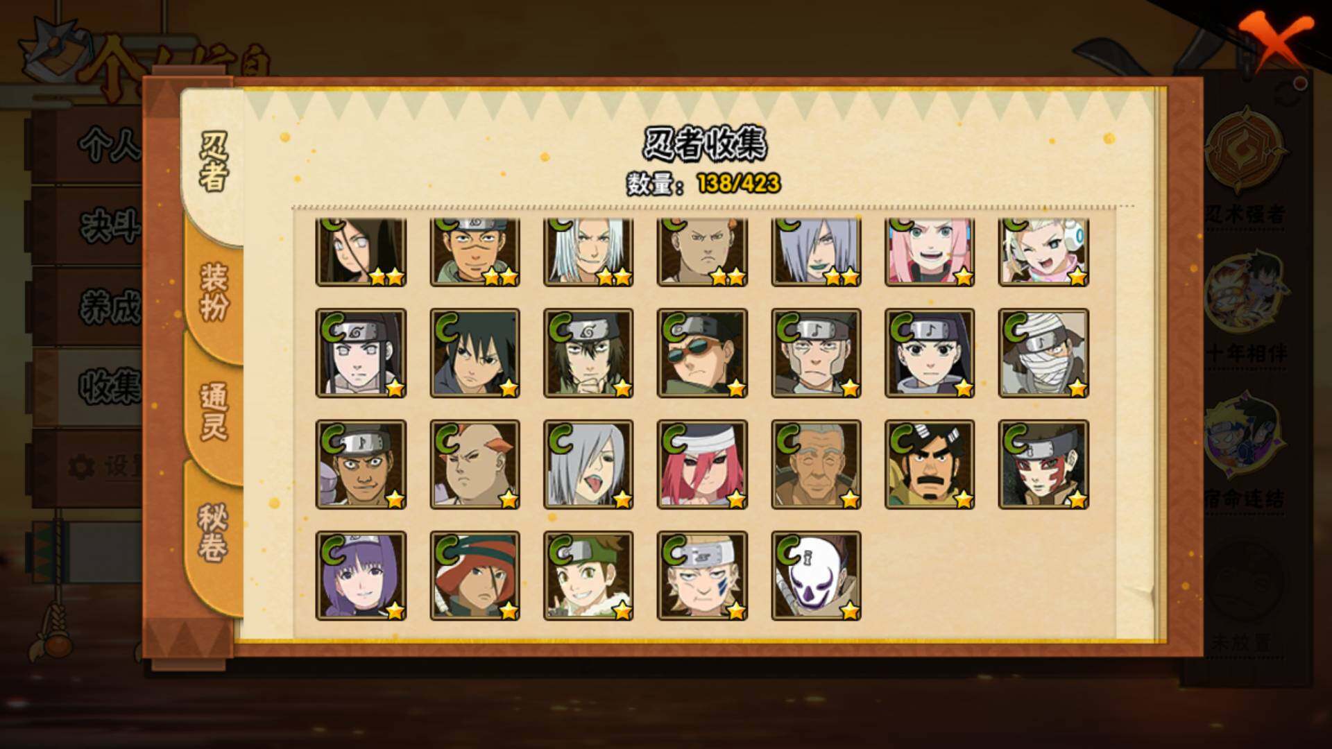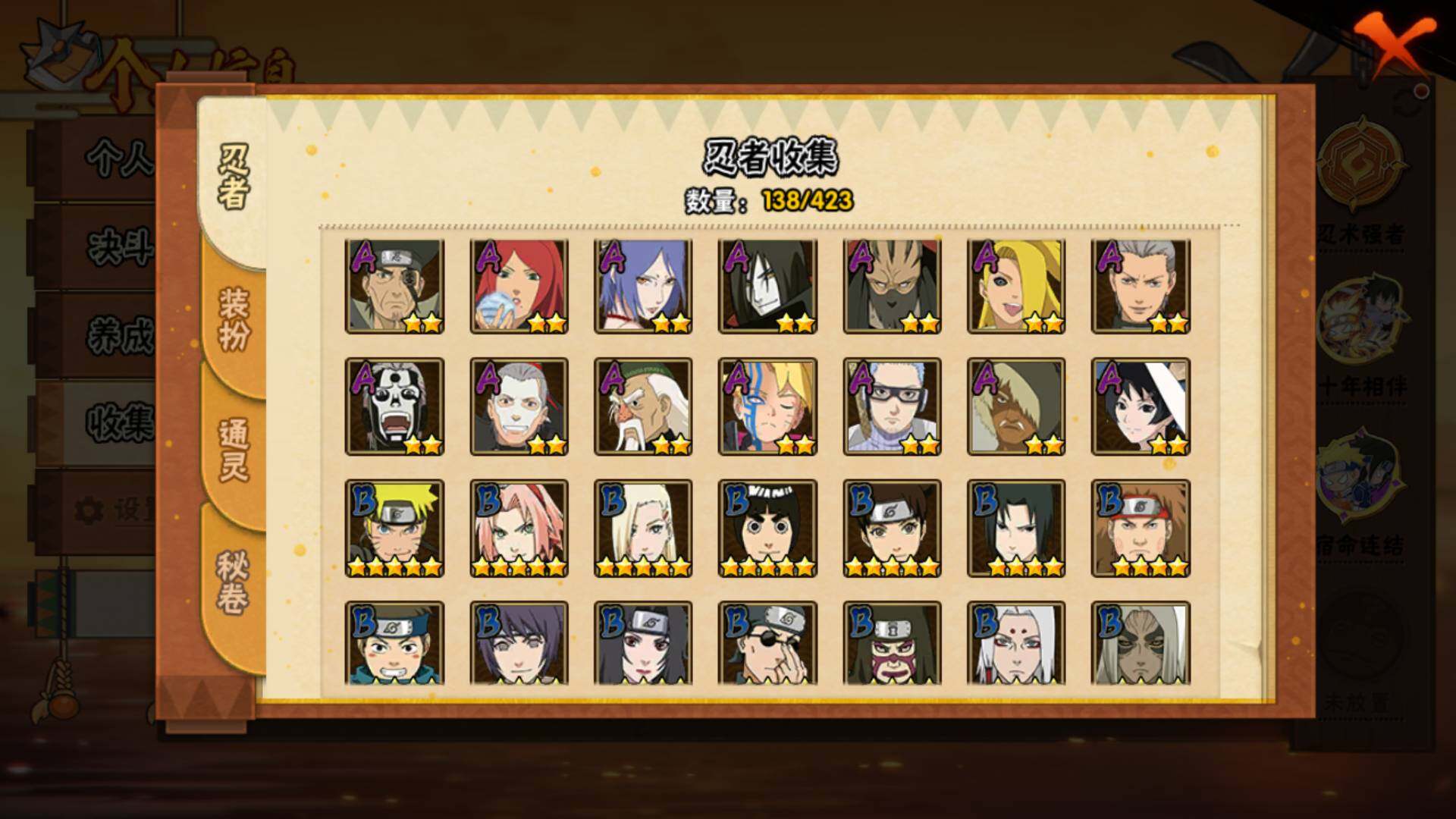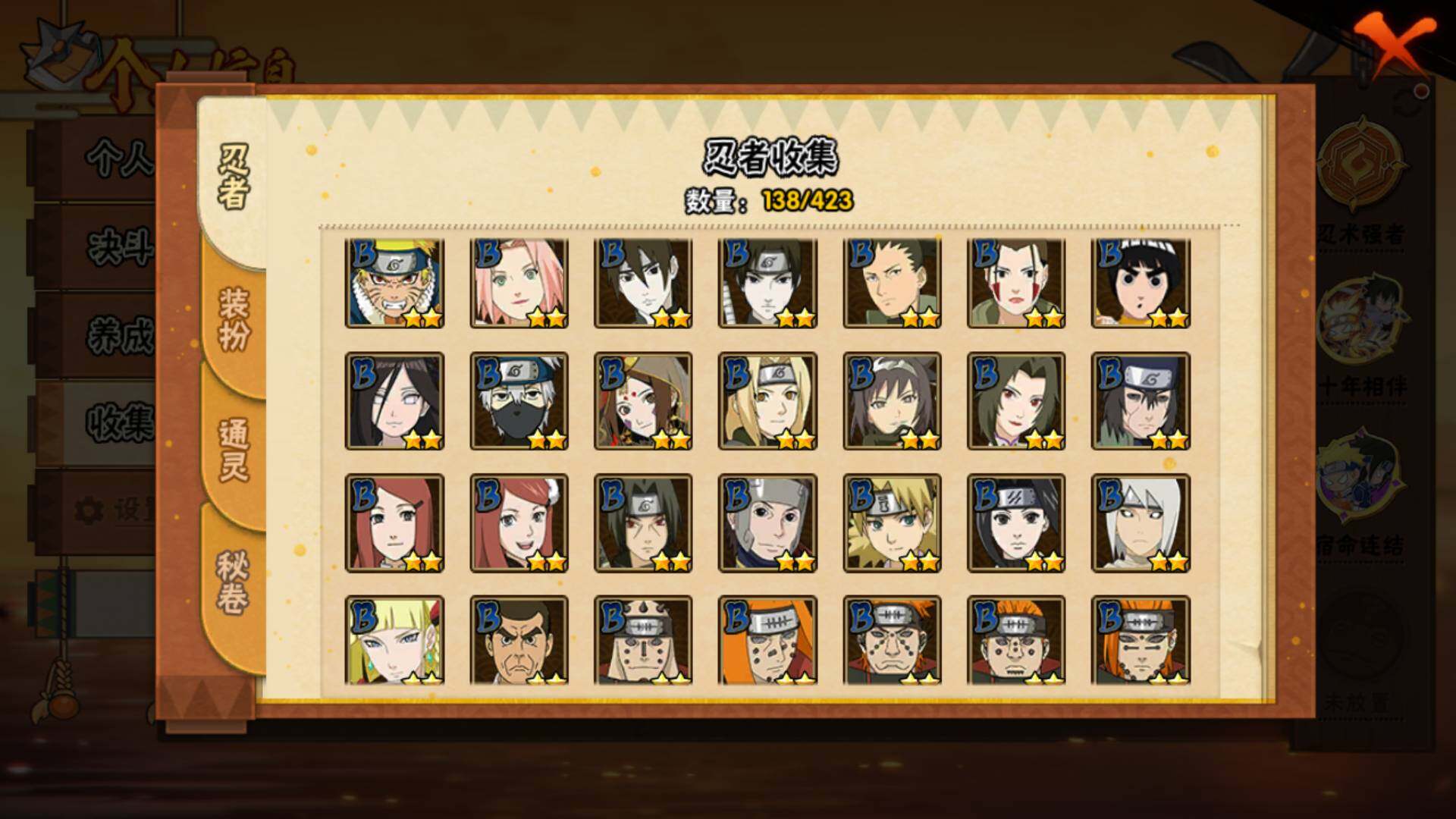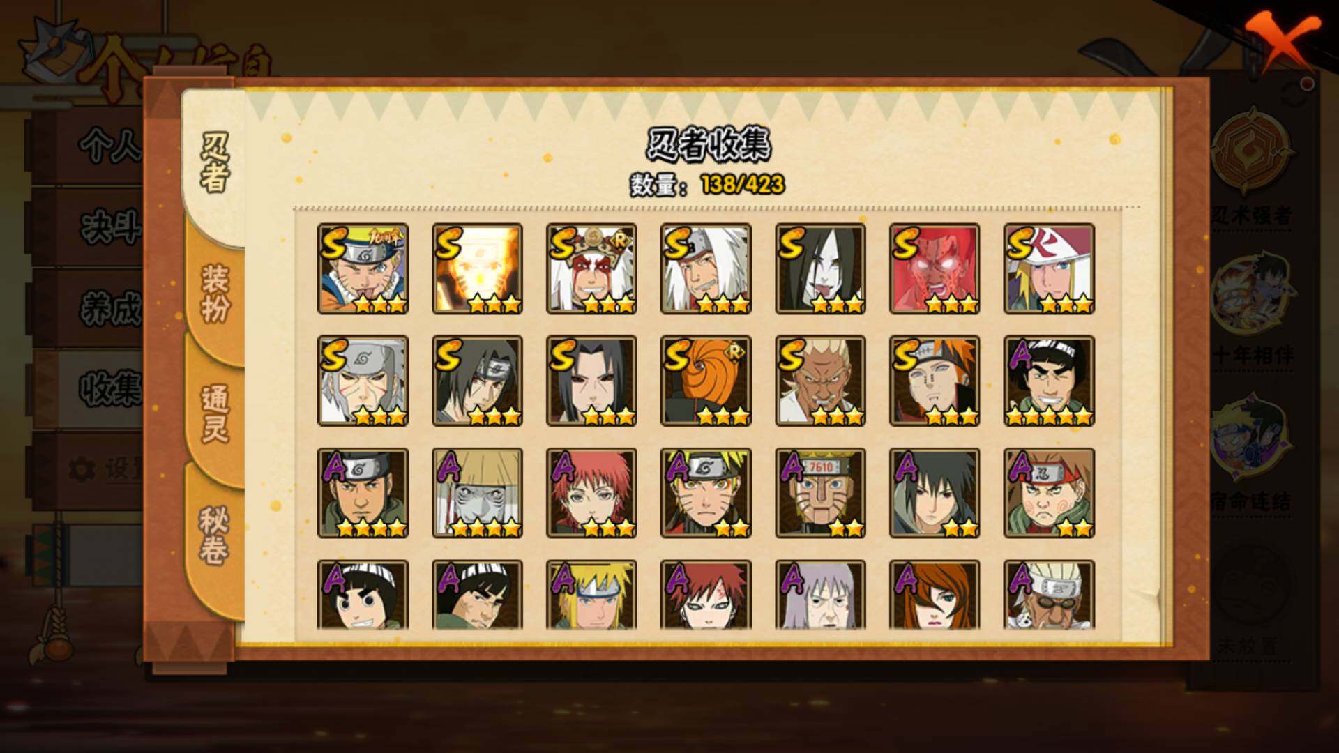 【S级忍者】:千手扉间「秽土转生」(3星),宇智波鼬「秽土转生」(3星),艾「忍界大战」(3星),宇智波鼬「须佐能乎」(3星),自来也「舞之豪杰」(3星),大蛇丸(3星),自来也「传说中的三忍」(3星),波风水门(3星),漩涡鸣人「九喇嘛连结」(3星),迈特凯「死门」(3星),佩恩「天道」(3星),宇智波斑「五影会谈」(3星),漩涡鸣