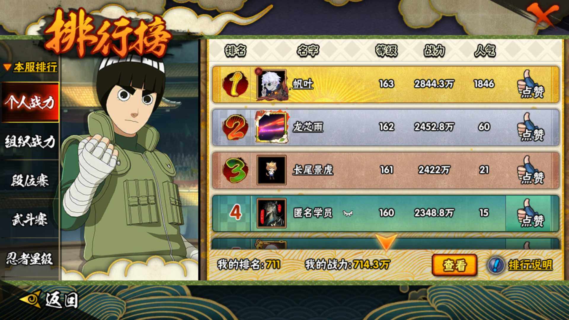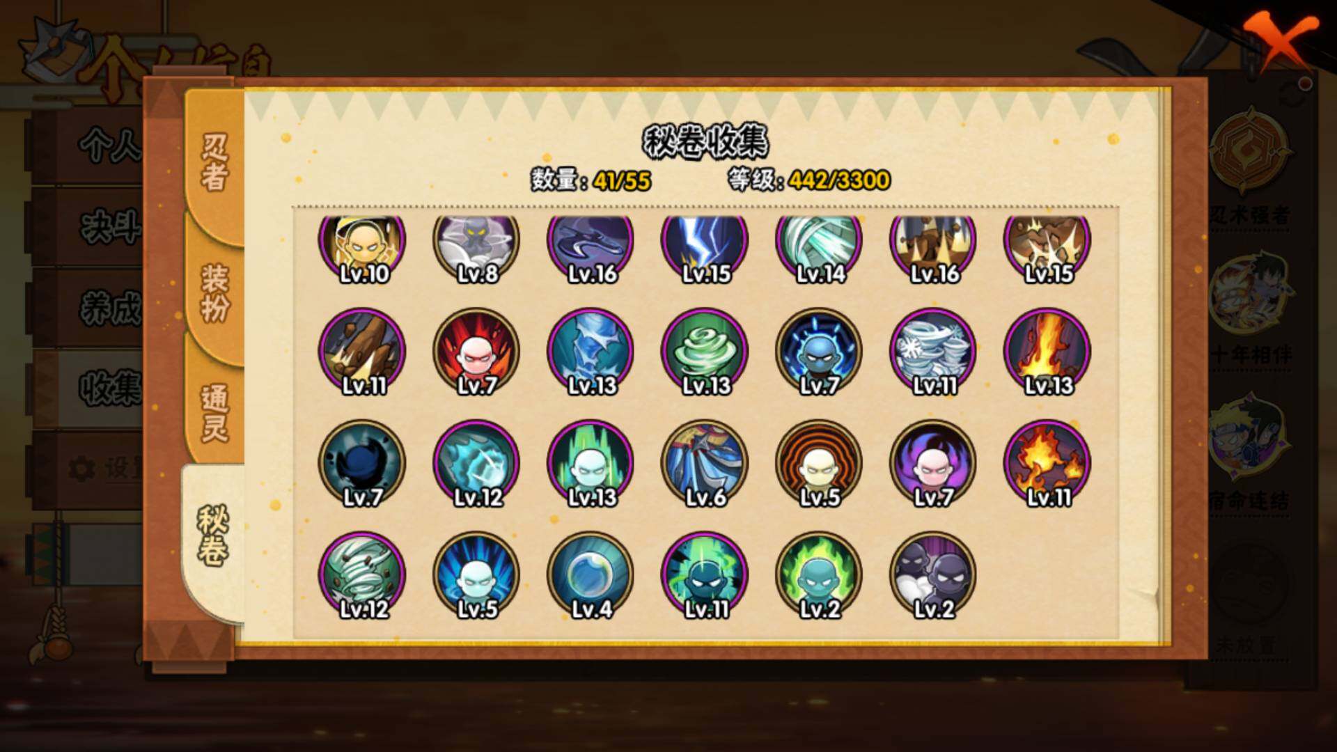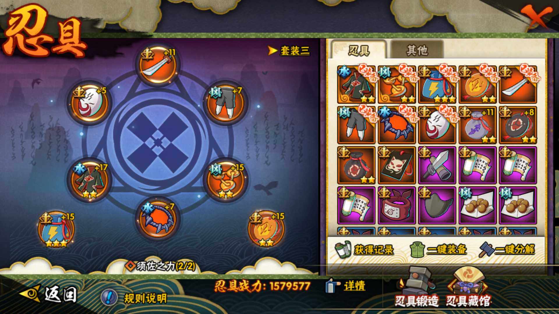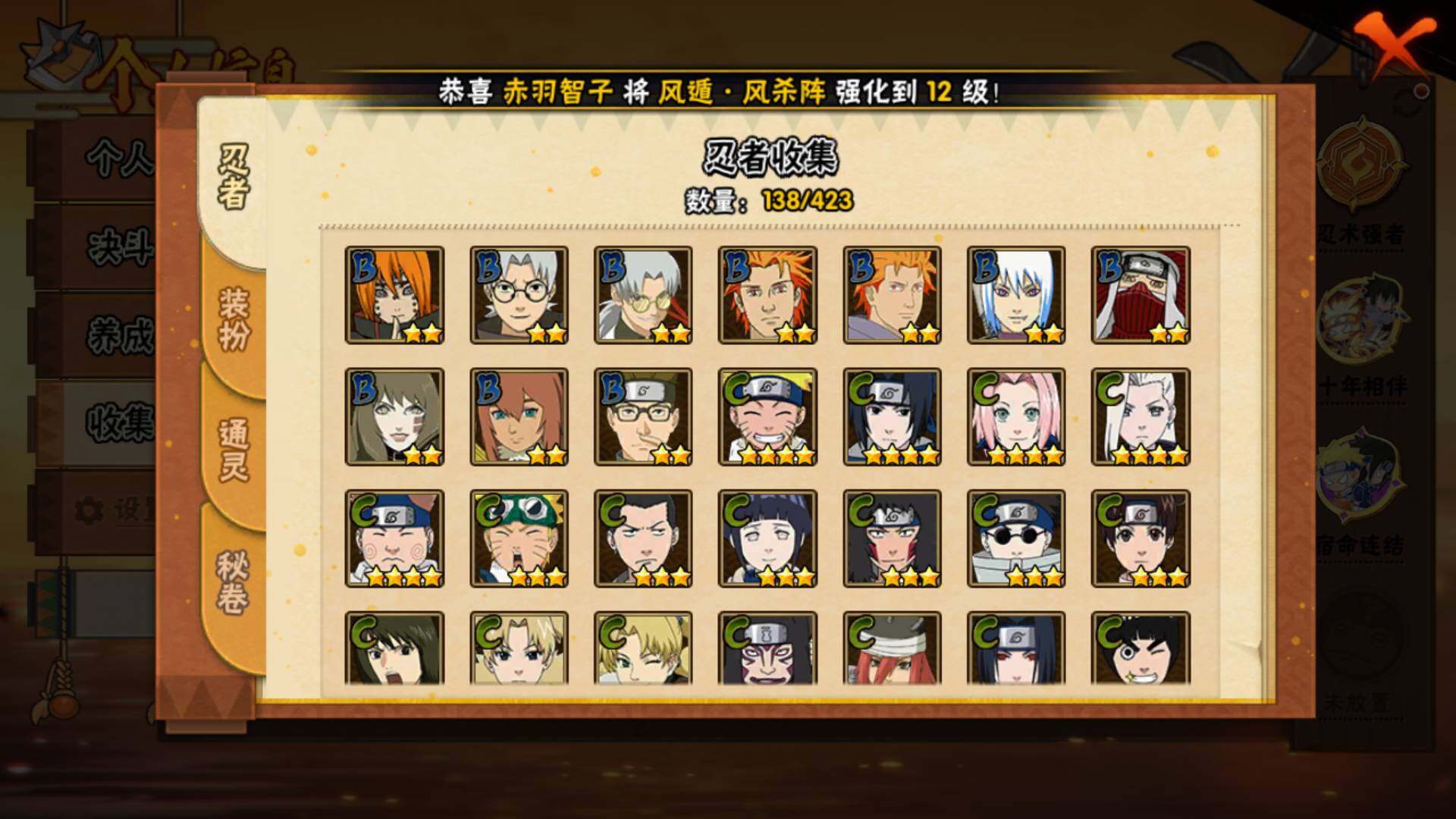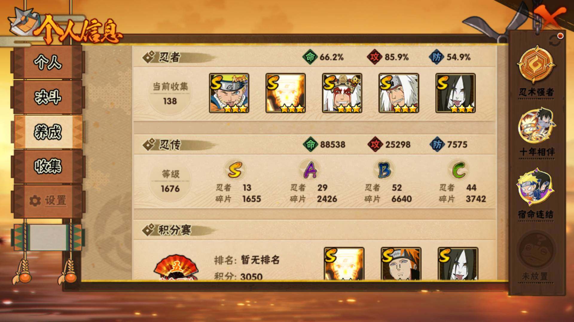 【S级忍者】:千手扉间「秽土转生」(3星),宇智波鼬「秽土转生」(3星),艾「忍界大战」(3星),宇智波鼬「须佐能乎」(3星),自来也「舞之豪杰」(3星),大蛇丸(3星),自来也「传说中的三忍」(3星),波风水门(3星),漩涡鸣人「九喇嘛连结」(3星),迈特凯「死门」(3星),佩恩「天道」(3星),宇智波斑「五影会谈」(3星),漩涡鸣