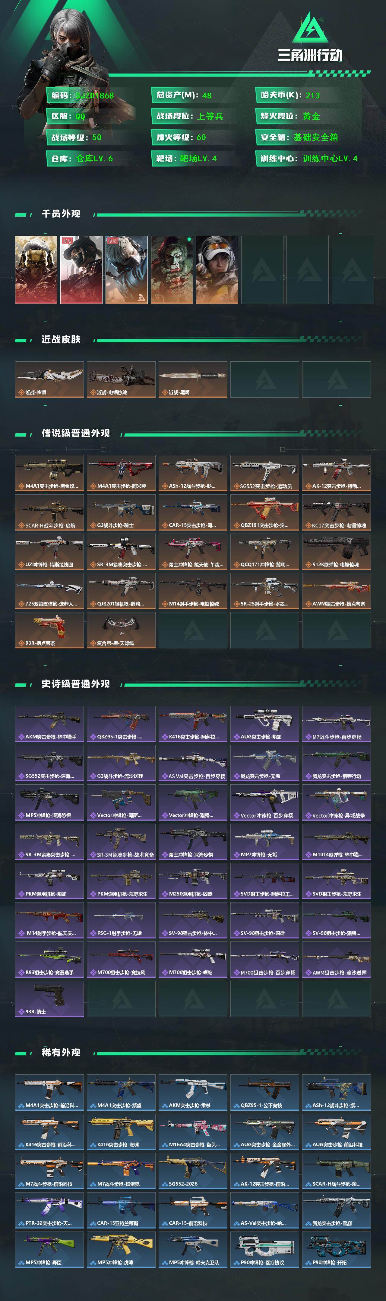 【SJZD1868】总资产(M):48M/哈夫币(K):213K/哈夫币(K):213K/传说枪皮数:22/全面战场等级:50_段位:上等兵/烽火地带等级:60_段位:黄金/红狼-蚀金玫瑰/露娜-黑·天际线/蜂医-送葬人·无题密令/红狼-电锯惊魂/露娜-金牌射手/近战-怜悯/近战-电锯惊魂/近战-黑鹰/M4A1突击步枪-蚀金玫瑰/M4A1突击步枪-阿米娅/ASh-12战斗步枪-鹅鸭杀/SG552突击步枪-运动员/AK-12突击步枪-特斯拉线圈/SCAR-H战斗步枪-启航/G3战斗步枪-骑士/CA