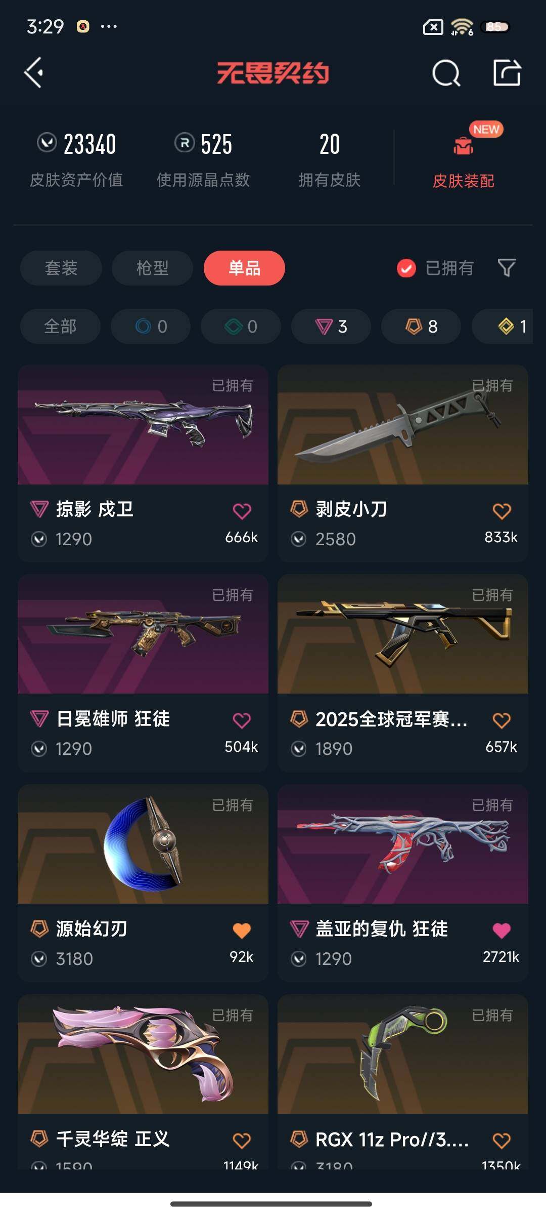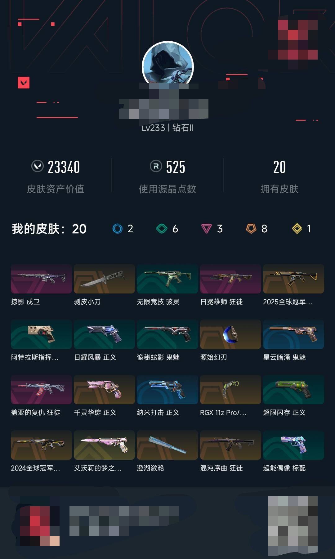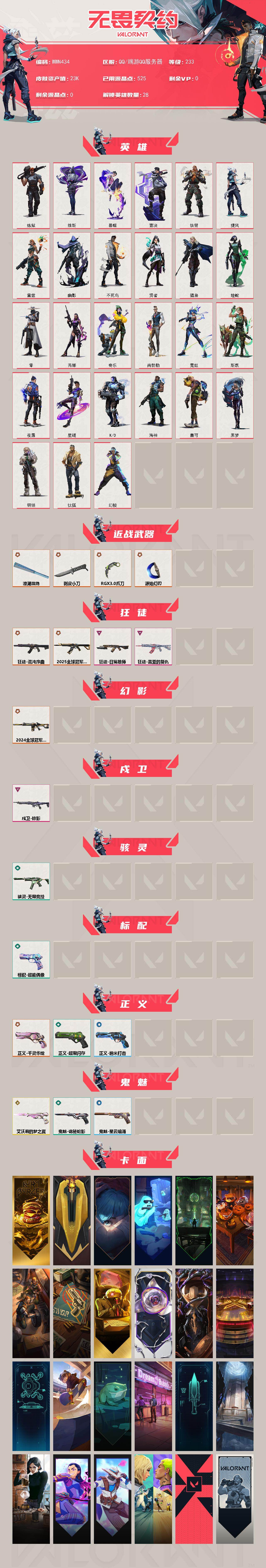 【WWN434】终极*8/传奇*1/卓越*3/皮肤*20/等级*233/段位:钻石/幻棱/炼狱/维斯/暮蝶/钛狐/壹决/铁臂/捷风/雷兹/幽影/不死鸟/贤者/猎枭/蝰蛇/零/芮娜/奇乐/尚勃勒/霓虹/斯凯/夜露/星礈/K/O/海神/盖可/黑梦/钢锁/近战武器-剥皮小刀/近战武器-RGX 11z Pro//3.0 爪刀/近战武器-澄湖潋滟/近战武器-源始幻刃/狂徒-2025全球冠军赛/狂徒-混沌序曲/狂徒-盖亚的复仇/狂徒-日冕雄师/幻影-2024全球冠军赛/戍卫-掠影/骇灵-无限竞技/标配-超能