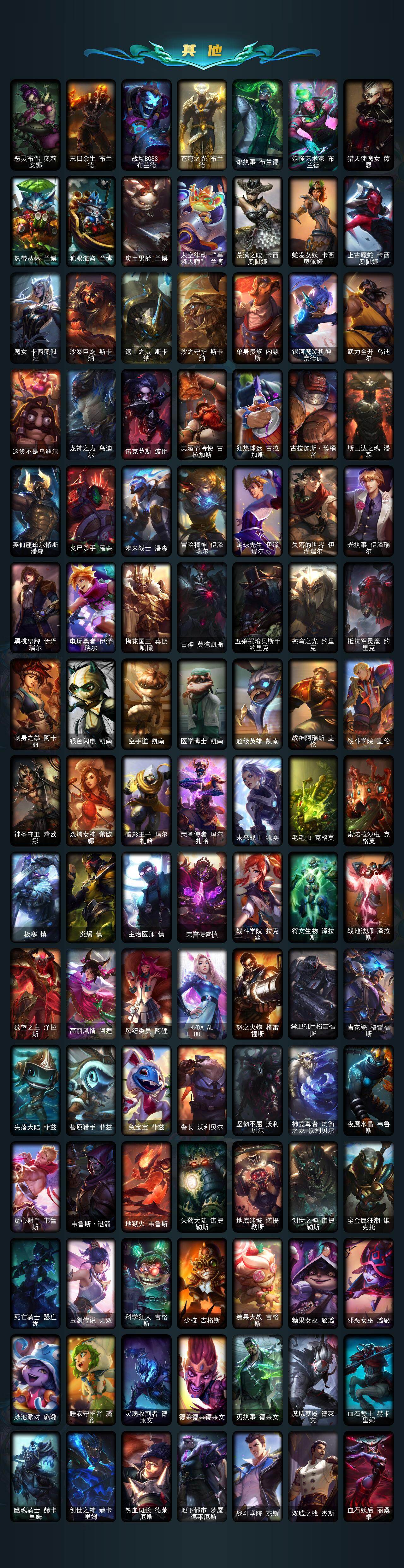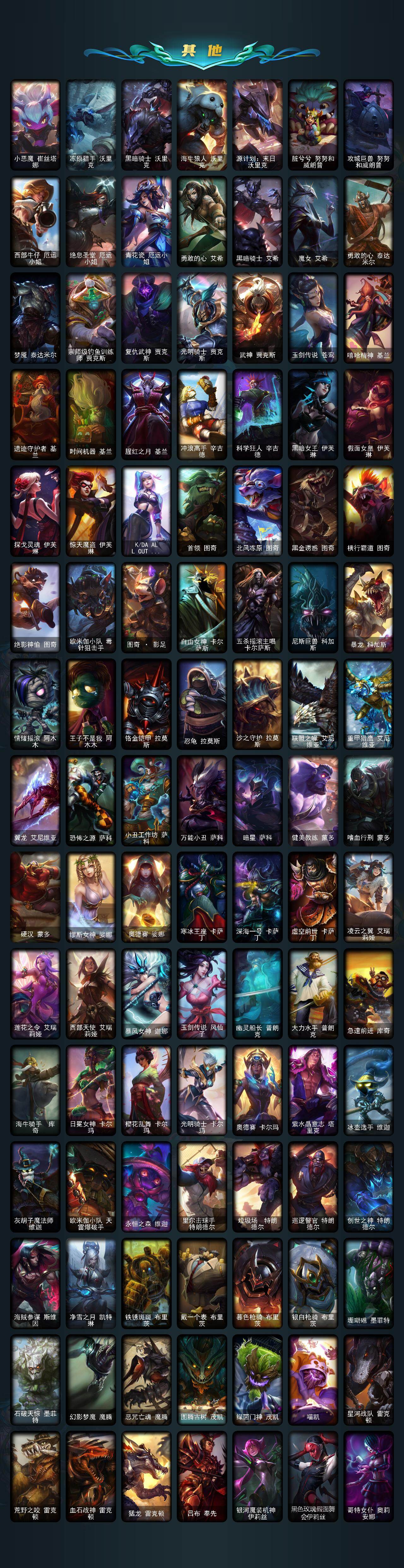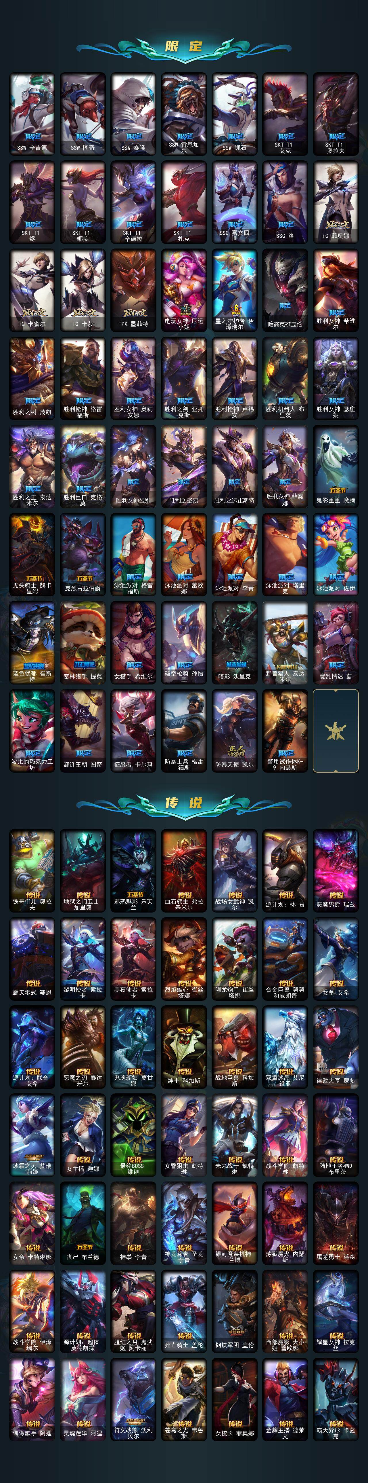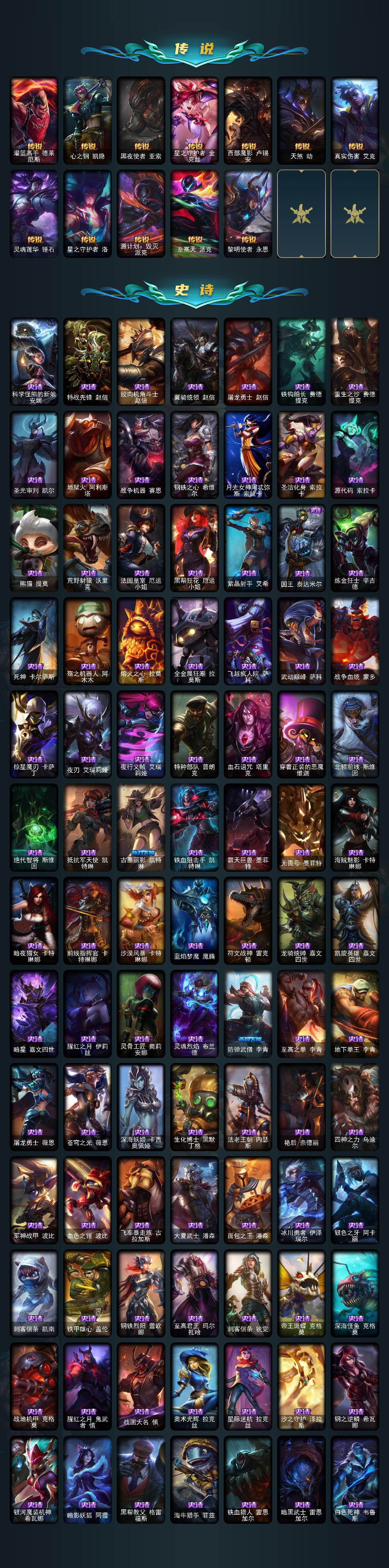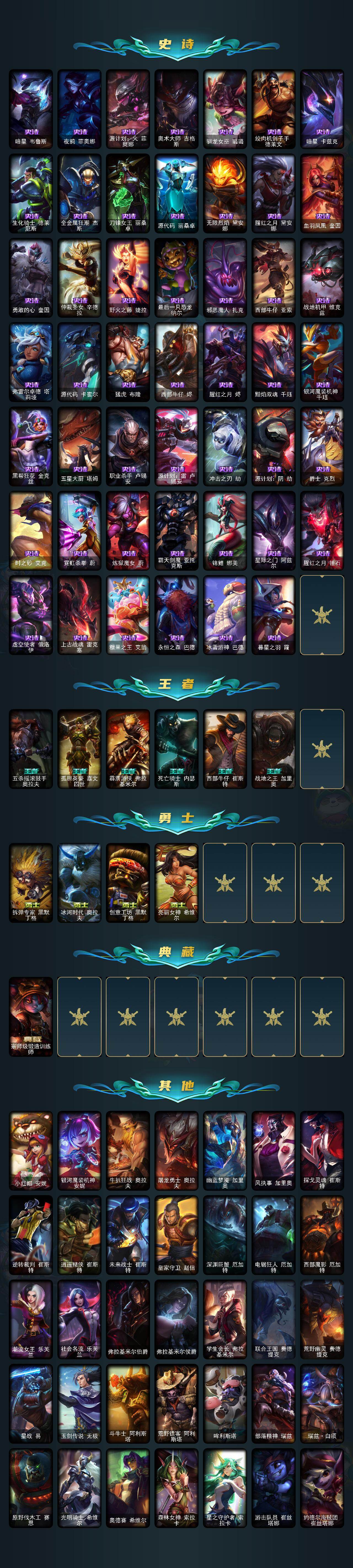 171英雄/620皮肤/18神话/94限定/17臻彩/416炫彩/61传说/139史诗/未定级