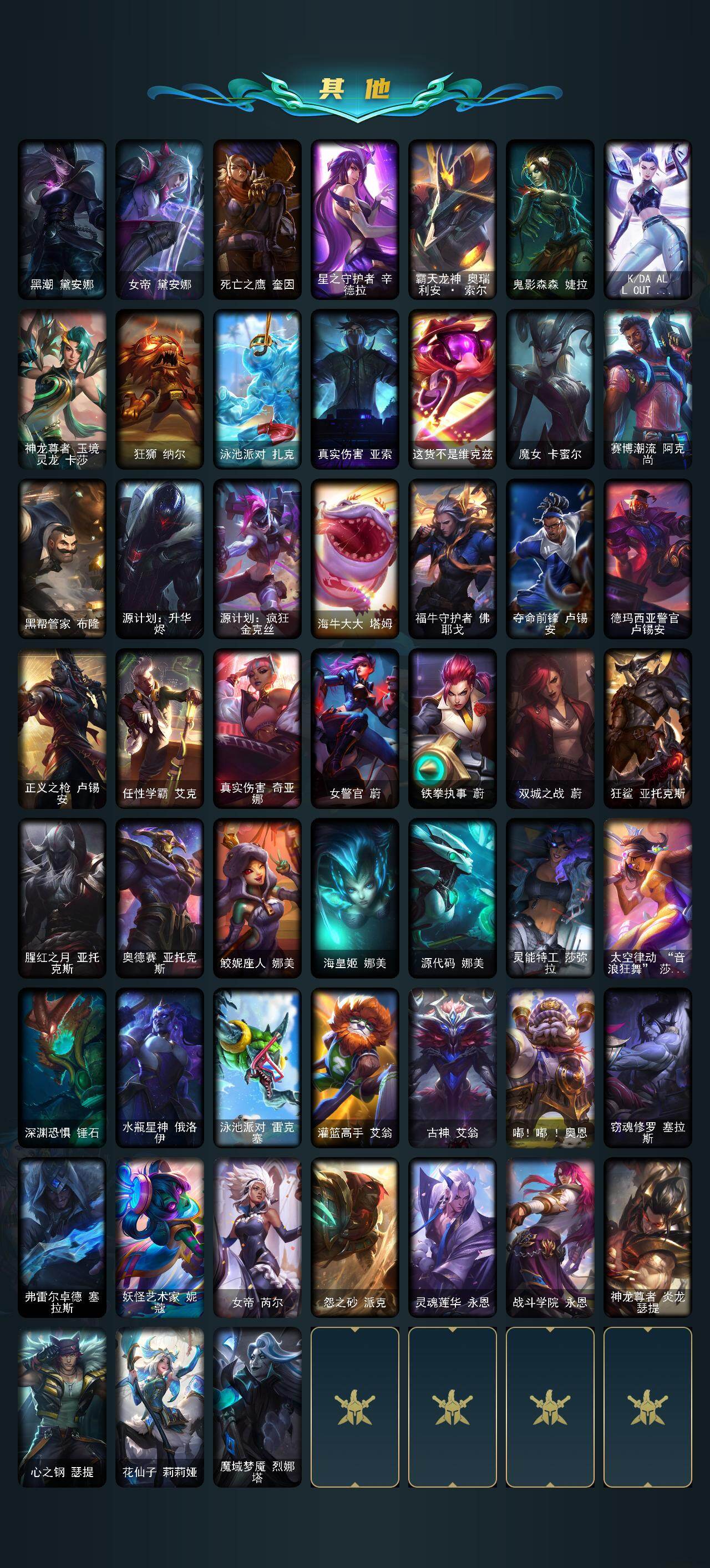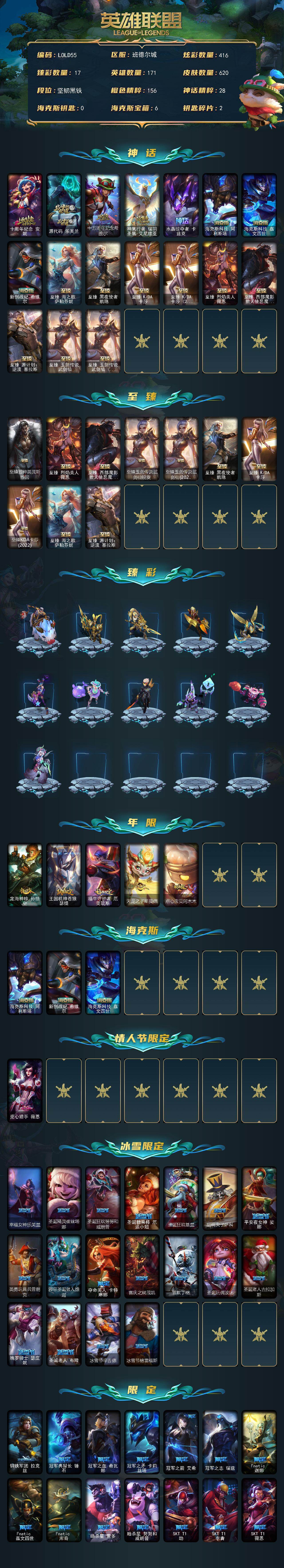 【LOLD55】171英雄/620皮肤/18神话/94限定/17臻彩/416炫彩/61传说/139史诗/未定级/至臻狼神英灵斯维因/至臻烈焰美人薇恩/至臻西部魔影猎天使恶魔泰隆/至臻玉剑传说武剑仙锐雯/至臻玉剑传说武剑仙(2022)/至臻黑夜使者凯隐/至臻KDA卡莎/至臻KDA卡莎(2022)/至臻海之歌萨勒芬妮/至臻源计划逆流塞拉斯/天龙之子卡莎飞龙乘云/无畏骑士瑟庄妮赤子初心/吕布奉先炫金战神/赵云子龙炫金将军/墨之影武者亚索金墨耀影/征服者韦鲁斯炫金/冠军掠夺者卡兹克凯旋圣装/星之守护者金