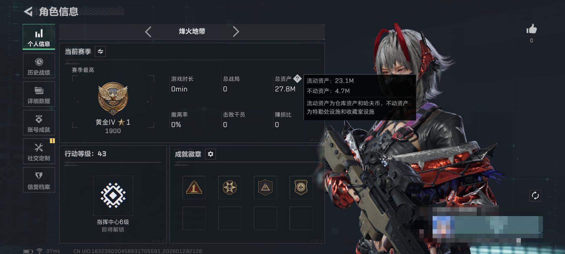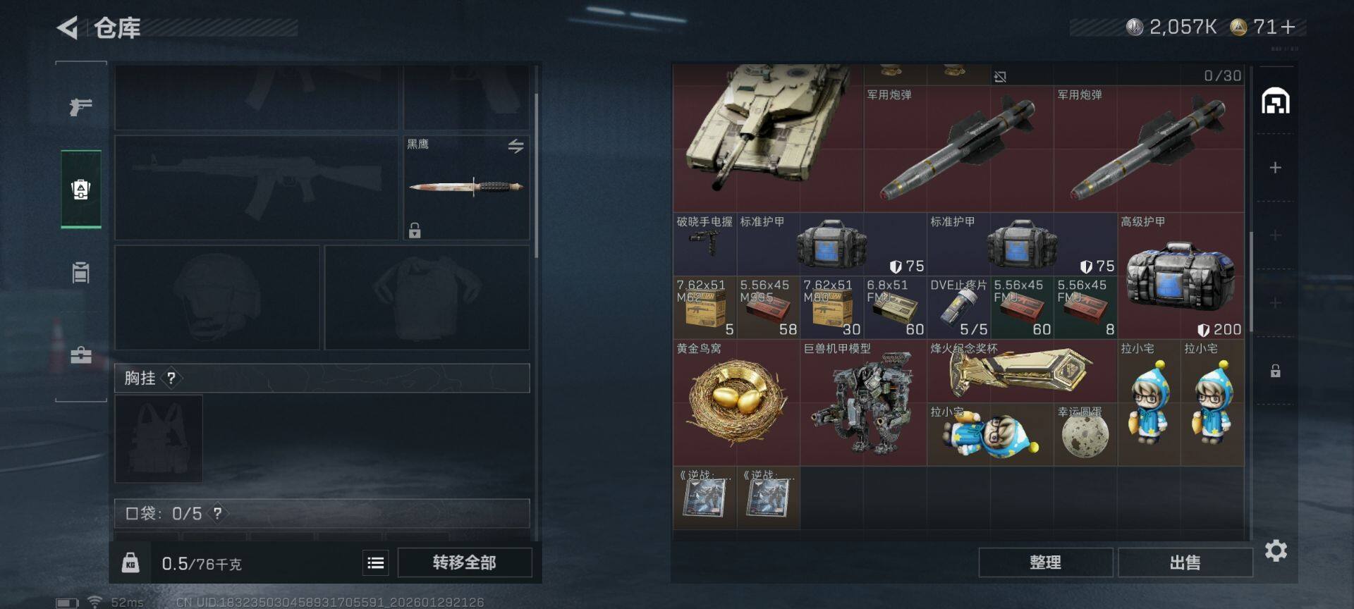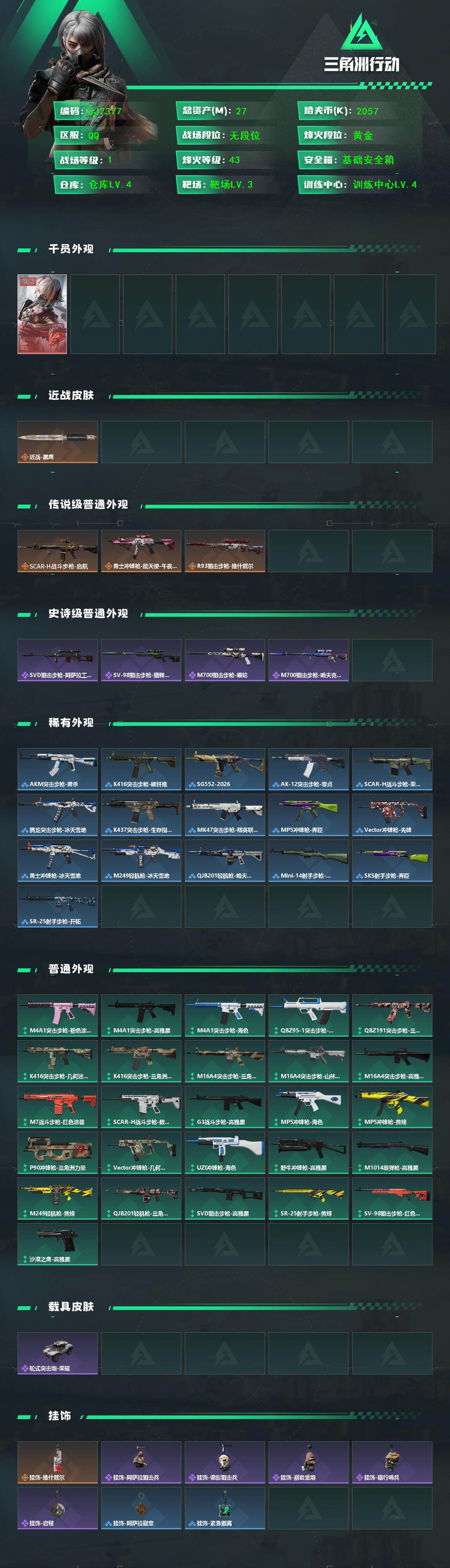 【SJ7377】总资产(M):27M/哈夫币(K):2057K/哈夫币(K):2057K/传说枪皮数:3/全面战场等级:1_段位:无段位/烽火地带等级:43_段位:黄金/骇爪-维什戴尔/近战-黑鹰/SCAR-H战斗步枪-启航/勇士冲锋枪-能天使-午夜邮差/R93狙击步枪-维什戴尔/SVD狙击步枪-阿萨拉工艺/SV-98狙击步枪-猎鳄行动/M700狙击步枪-蝮蛇/M700狙击步枪-哈夫克警备/AKM突击步枪-肃杀/K416突击步枪-碳纤维/SG552突击步枪-2026/AK-12突击步枪-零点/S
