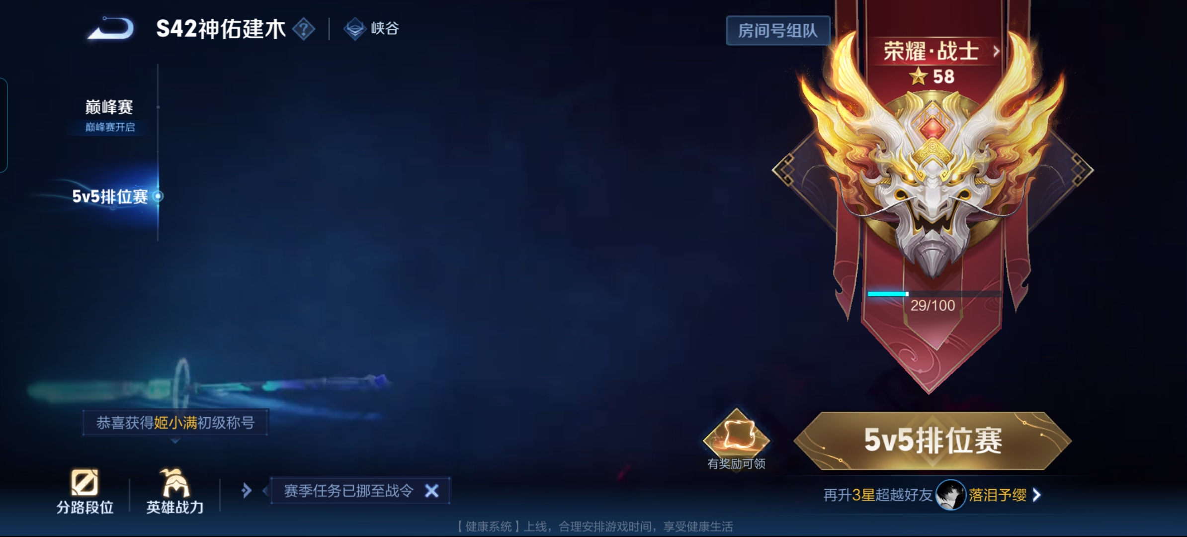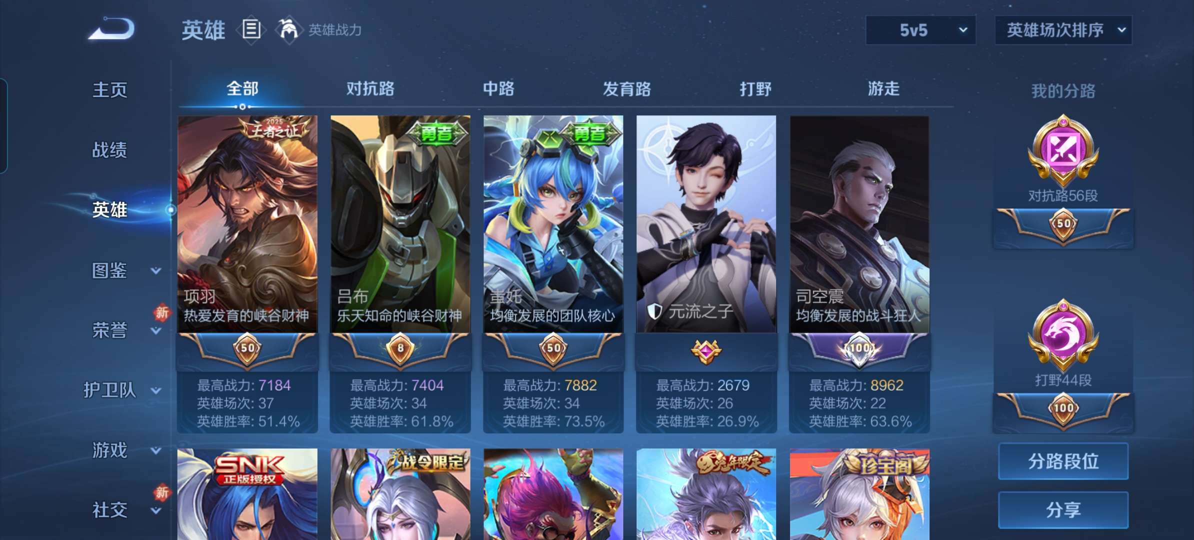 现在荣耀58星,对抗路56段,打野44段,中路43段,万战老夫子,多个市标,部落冲突联体号15满防