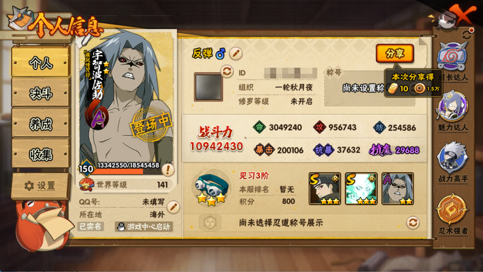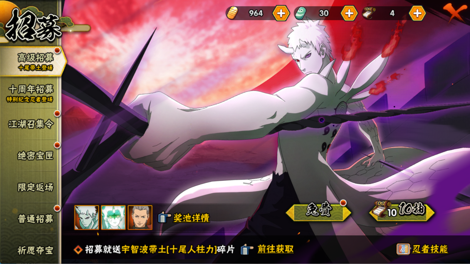 (可转苹果)1094W战力 超哥 创柱 红夜带土29S+298点券鸡翅+198直购盾狗 侠隐佐助 飘带6个198直购45A+熊猫通灵