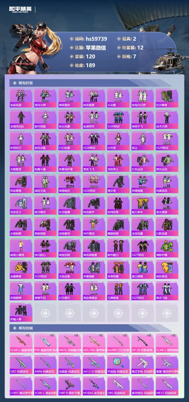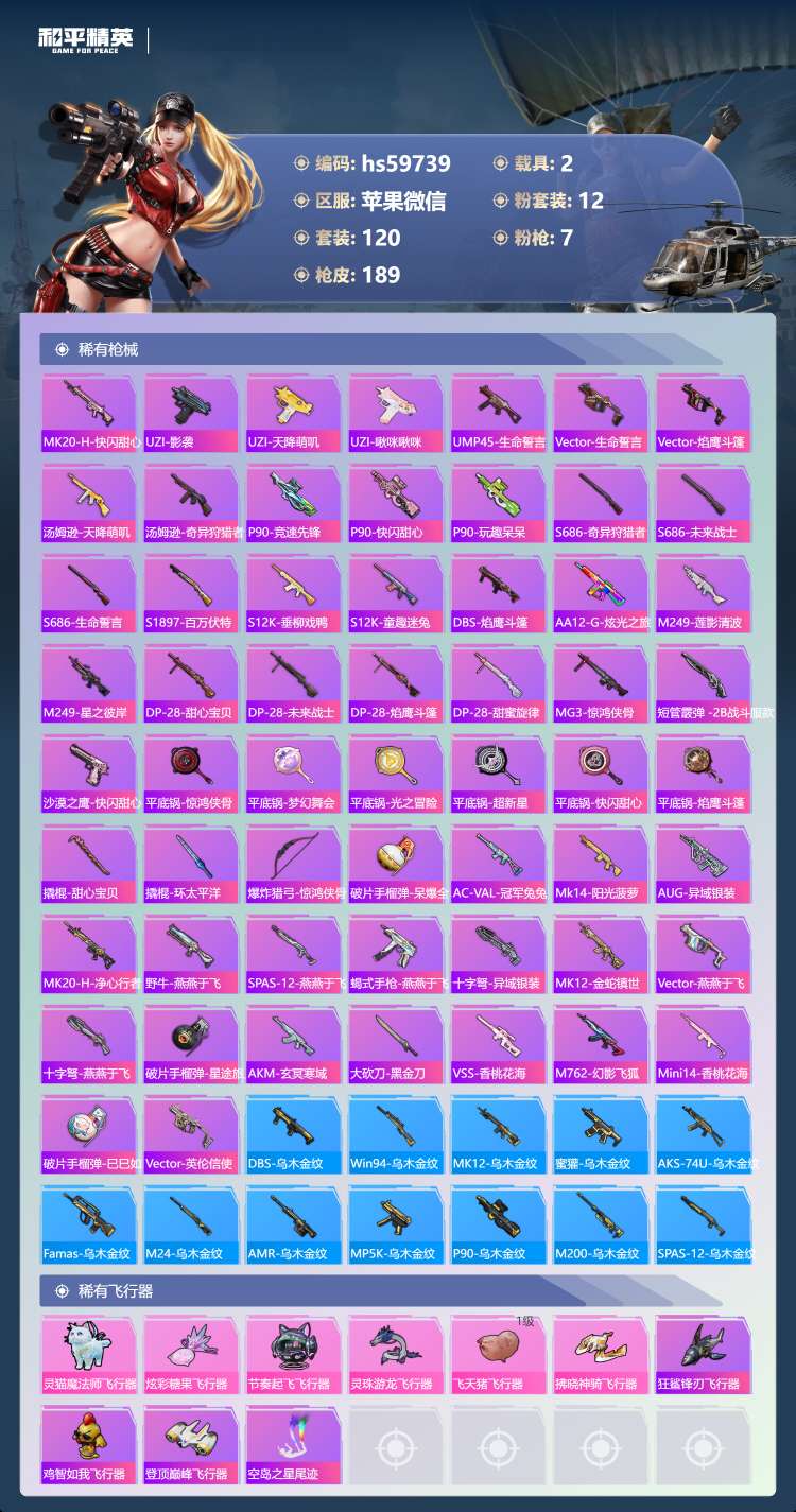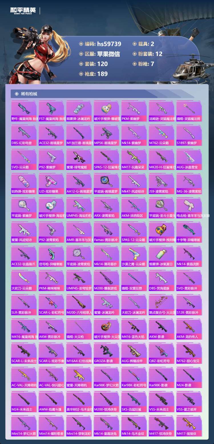 hs59739 苹果微-6王牌印记-1红装-12粉装-7特效枪-2载具-63738热力值-120套