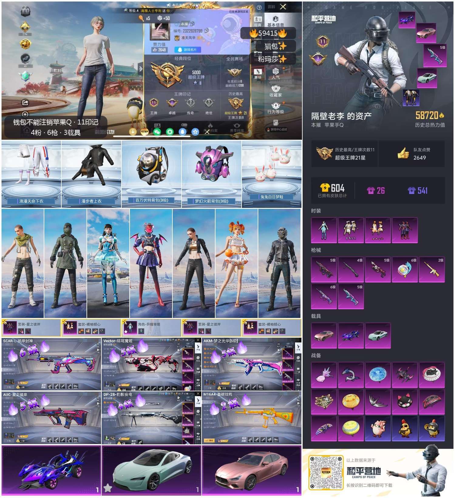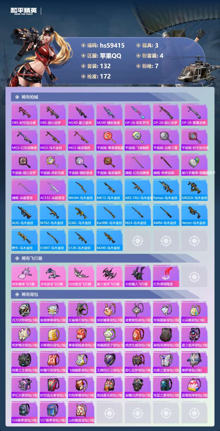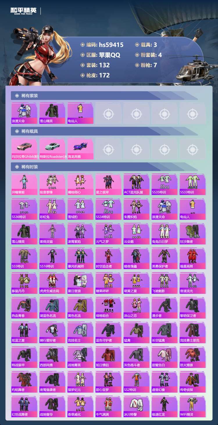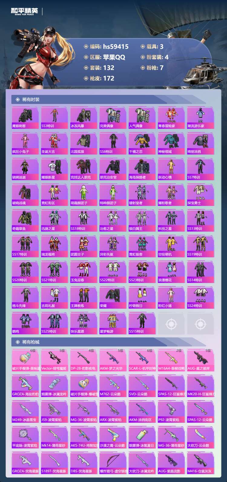 hs59415 苹果手Q-11王牌印记-4粉装-7特效枪-3载具-58720热力值-132套装-17