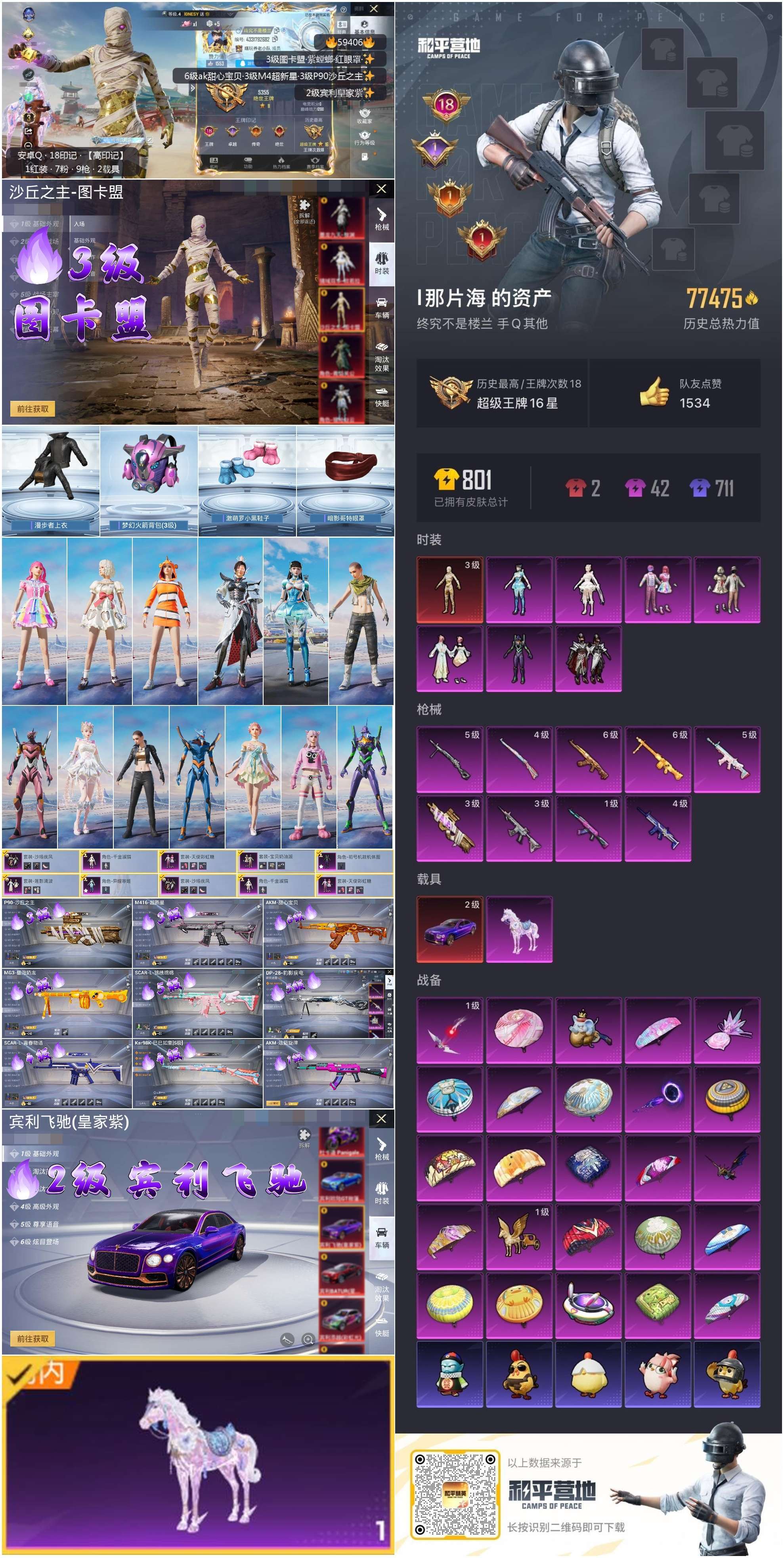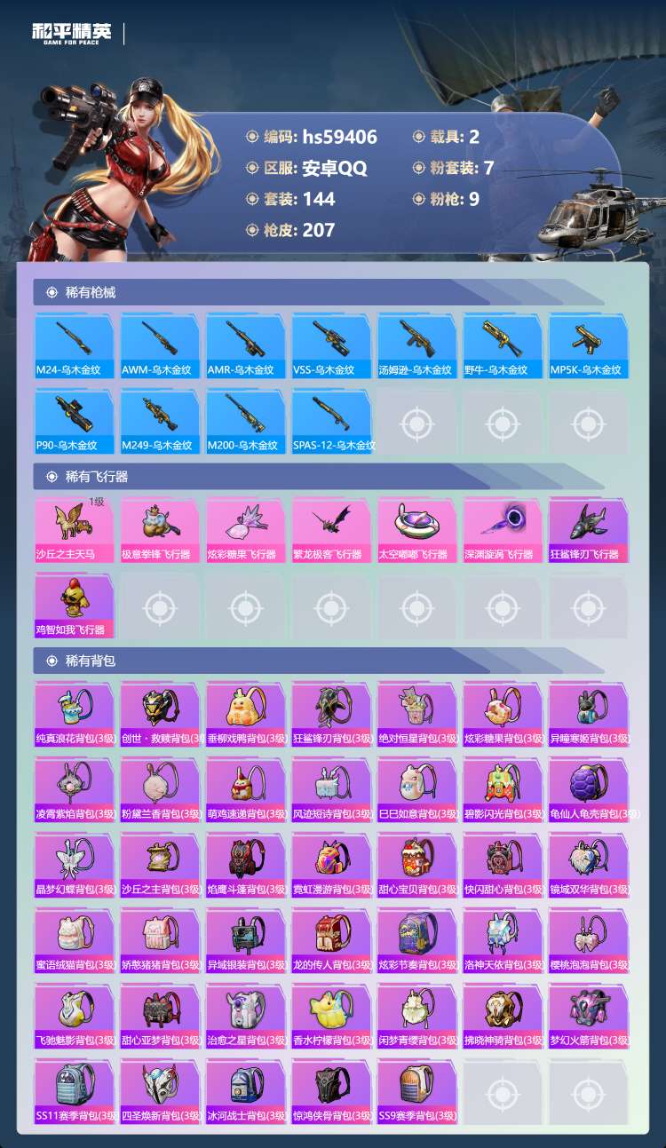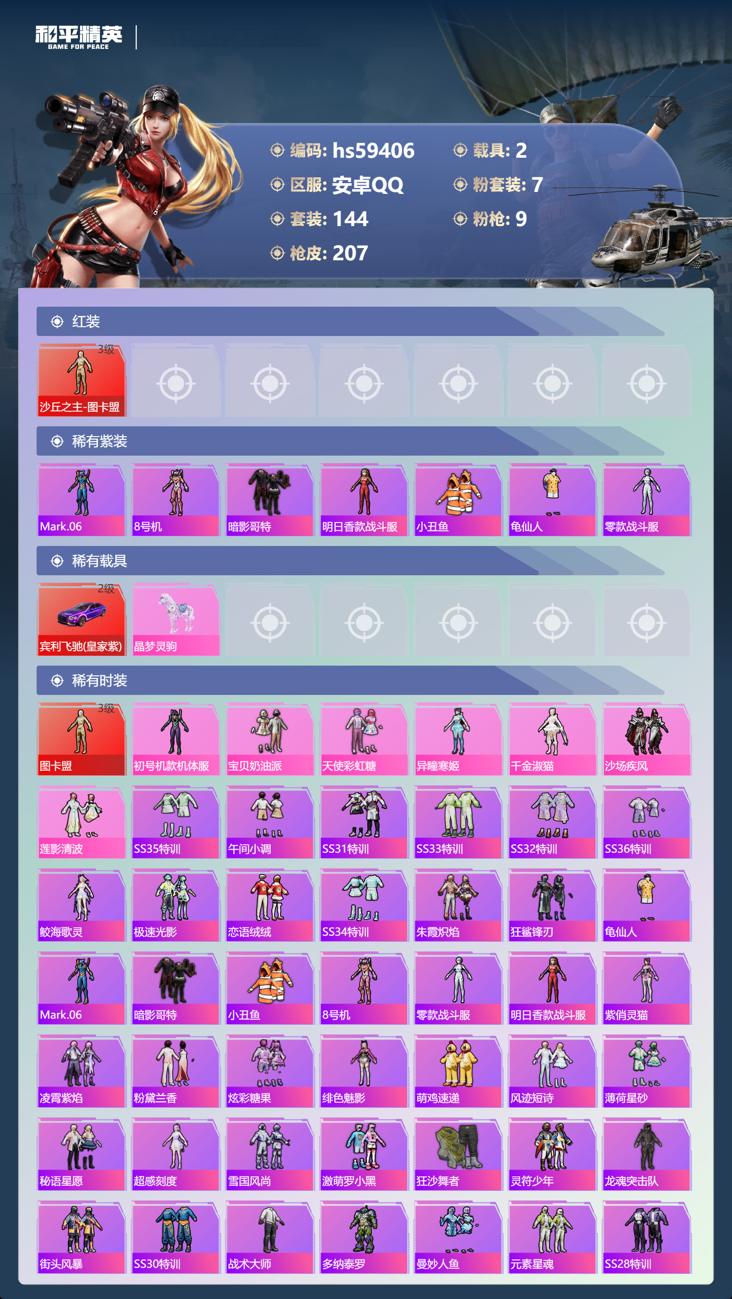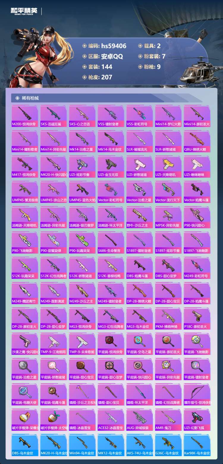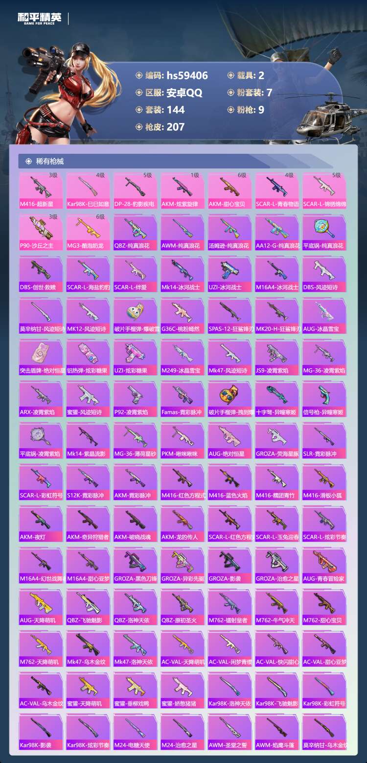 hs59406 安卓手Q-18王牌印记-1红装-7粉装-9特效枪-2载具-77475热力值-144套