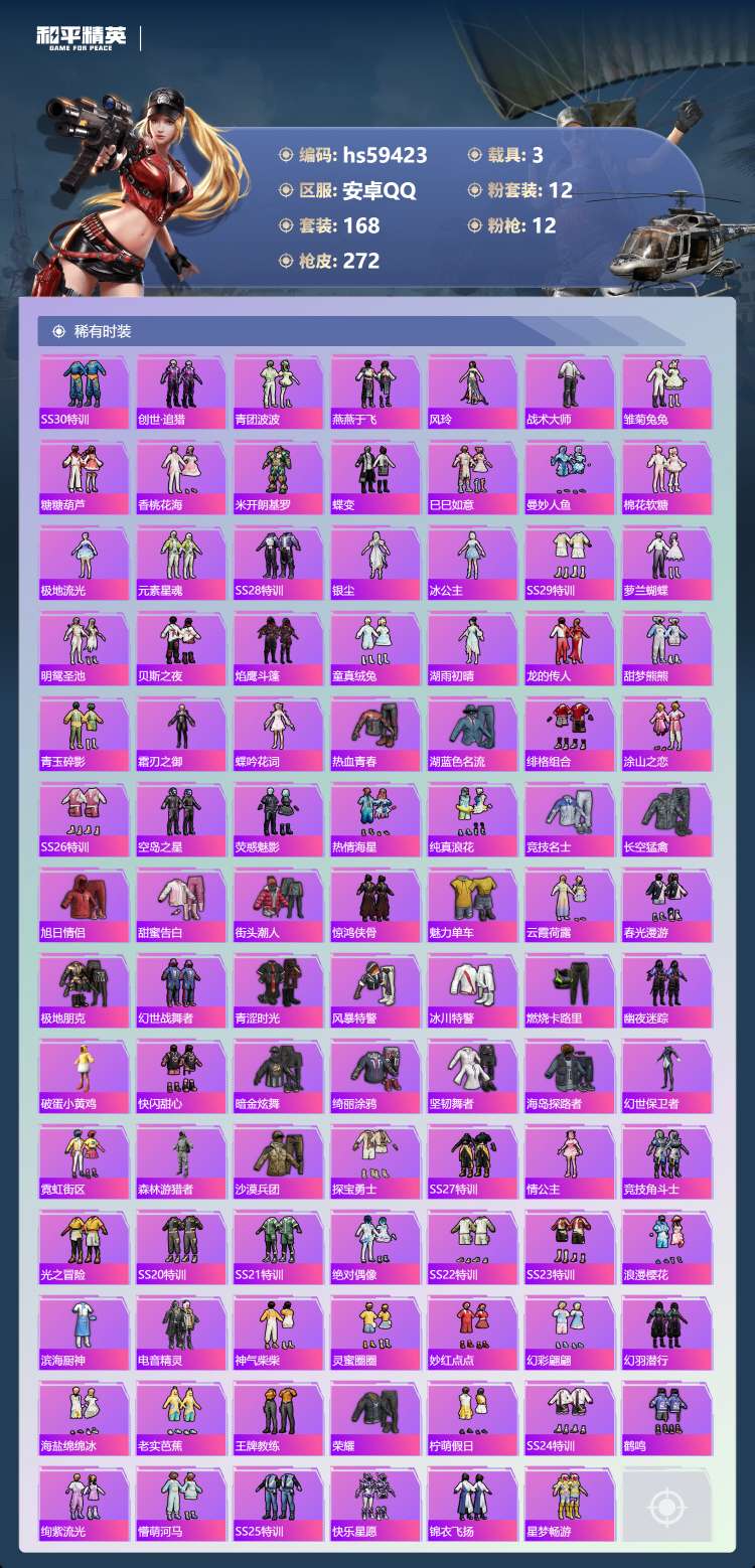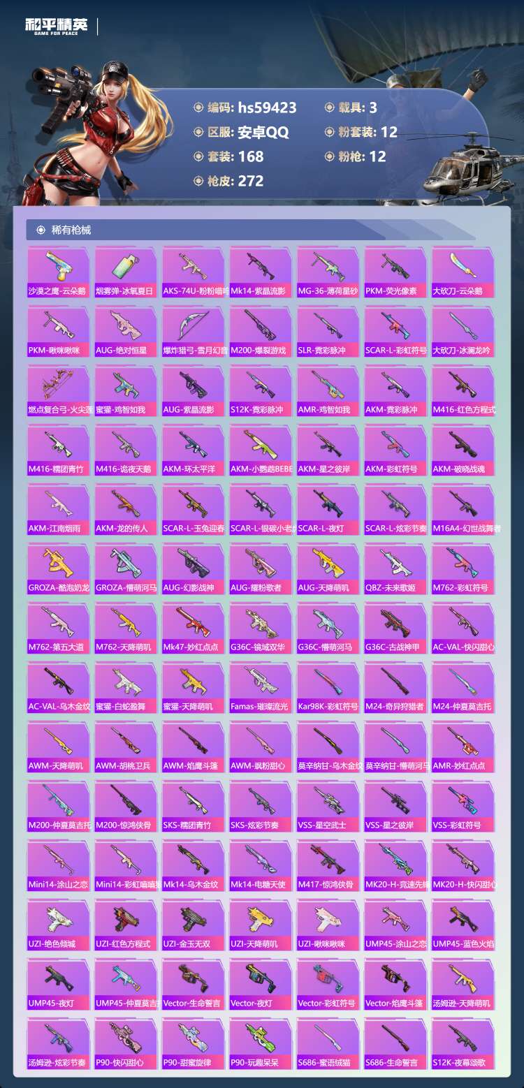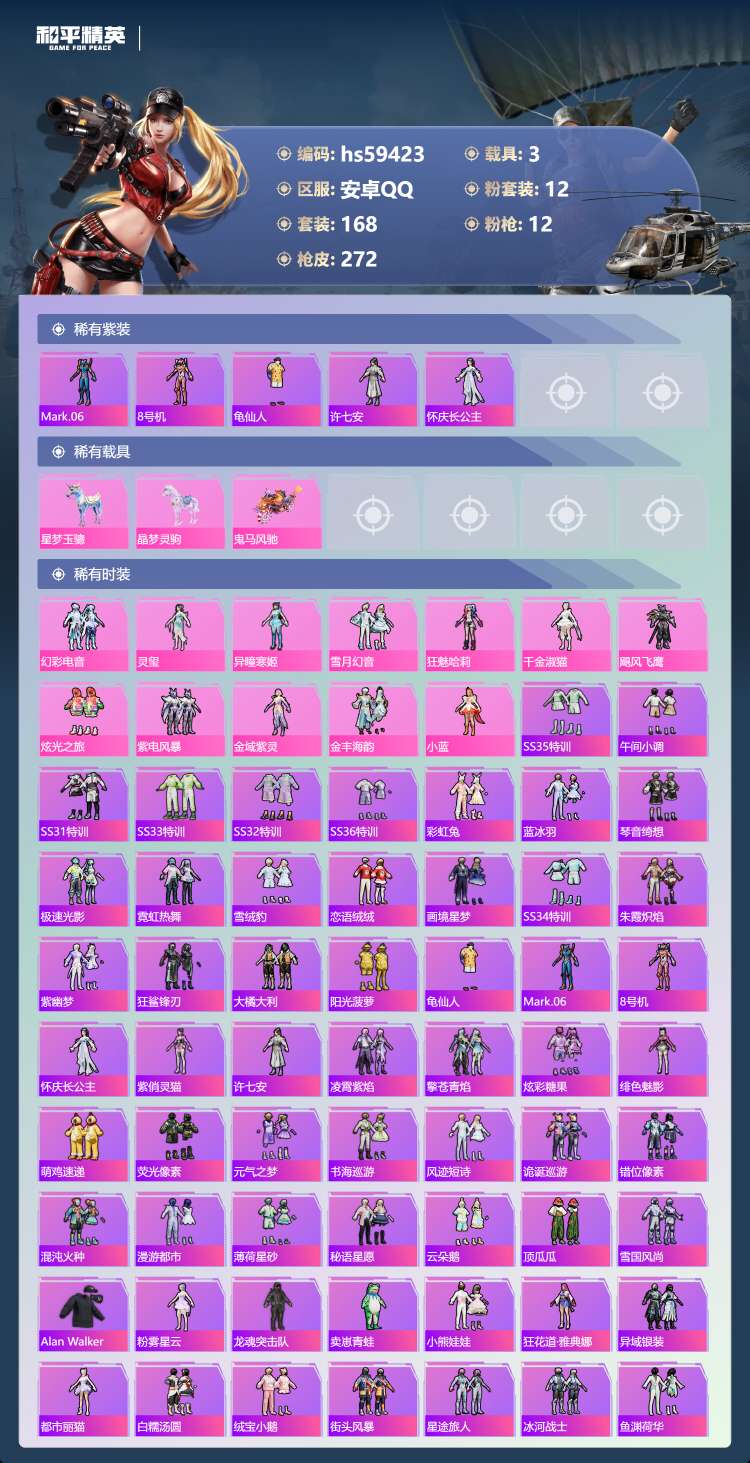 hs59423 安卓手Q-10王牌印记-12粉装-12特效枪-3载具-91027热力值-168套装-