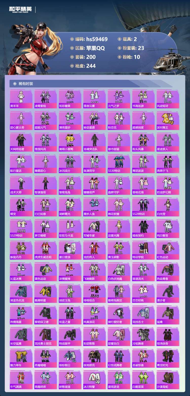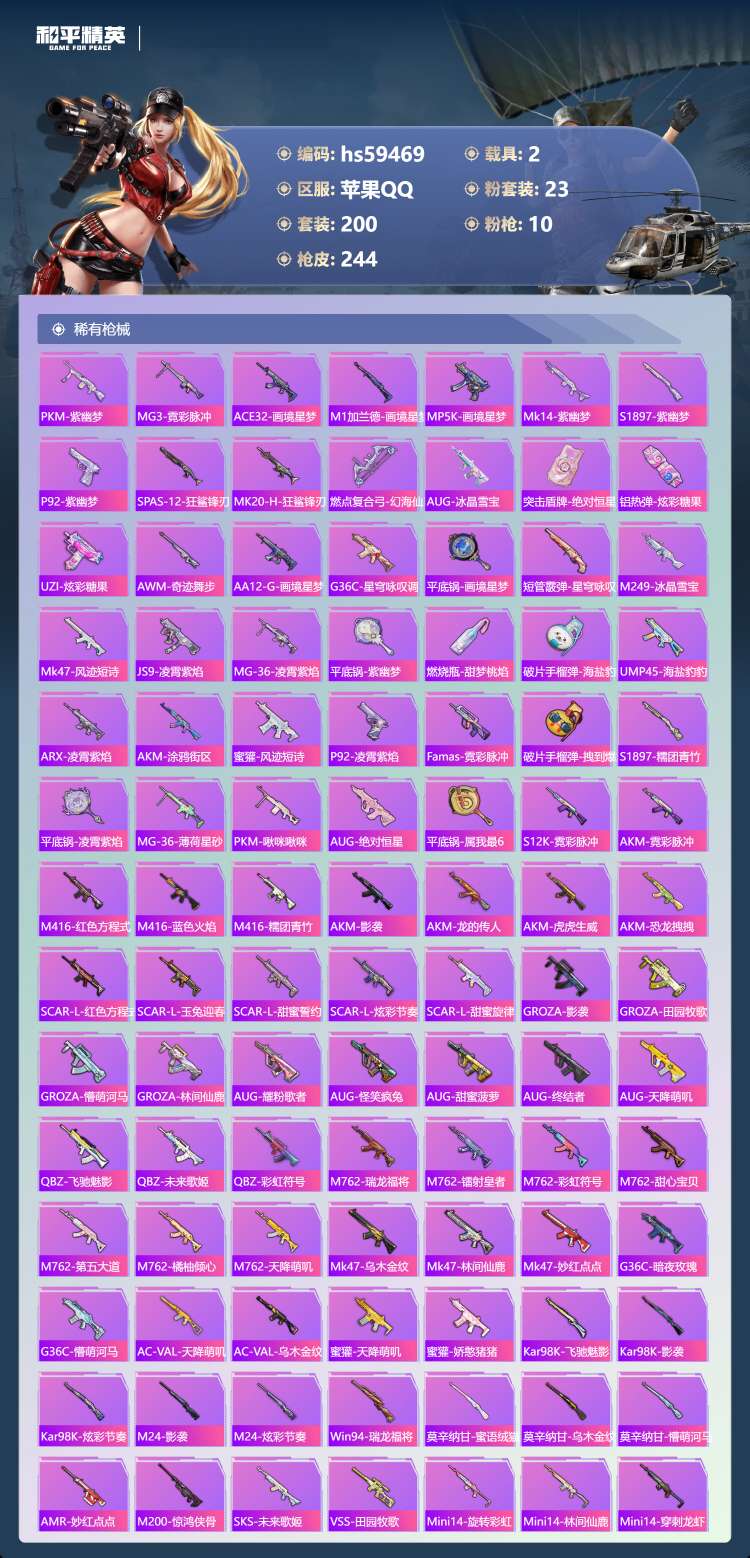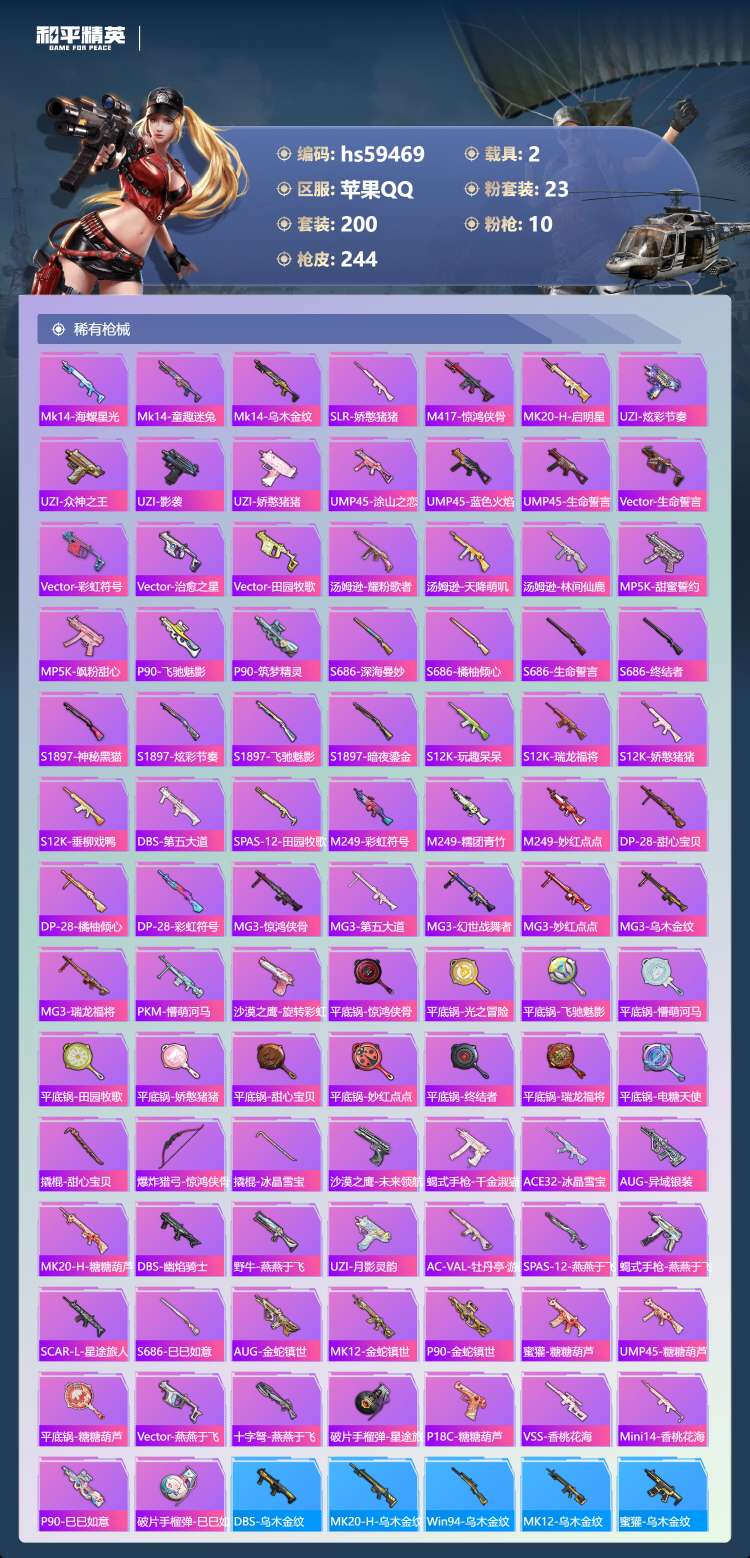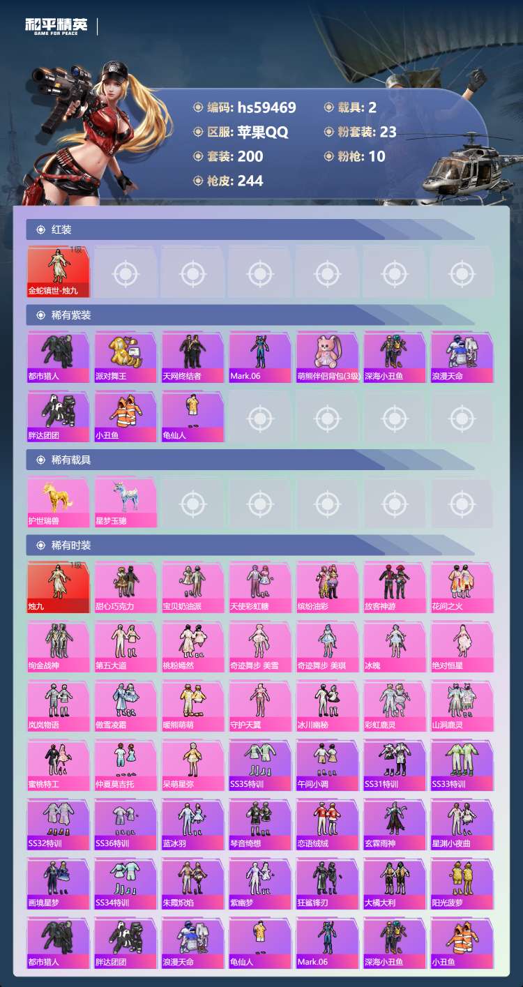 hs59469 苹果手Q-13王牌印记-1红装-23粉装-10特效枪-2载具-87971热力值-20