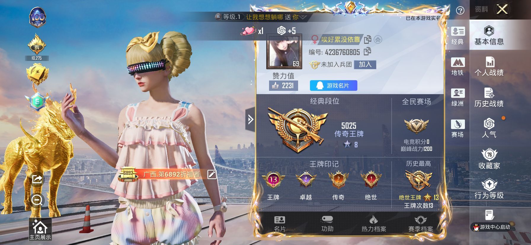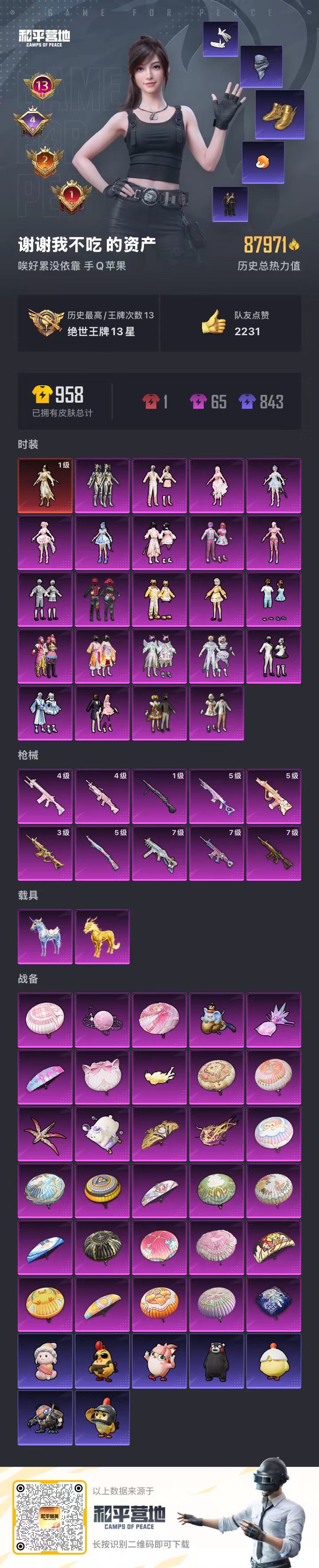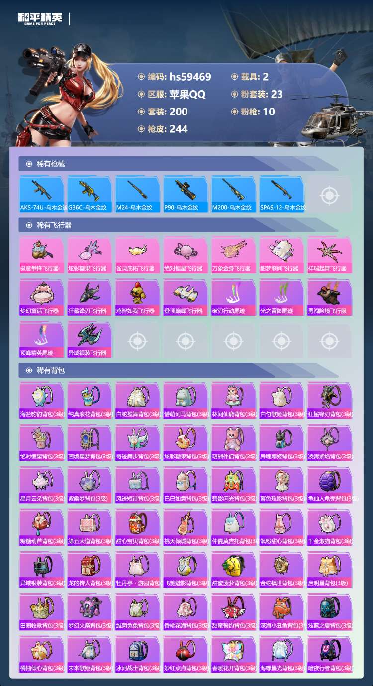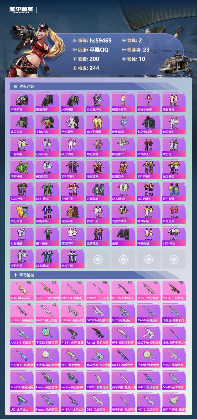 hs59469 苹果手Q-13王牌印记-1红装-23粉装-10特效枪-2载具-87971热力值-20