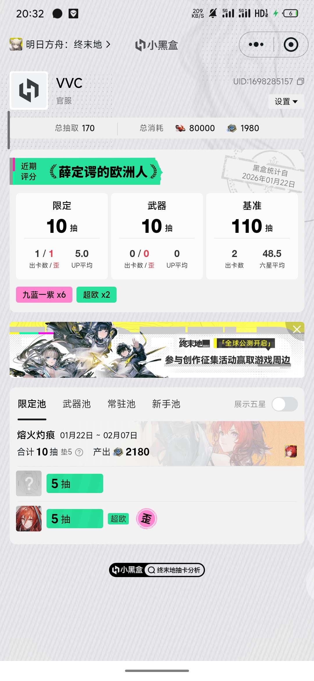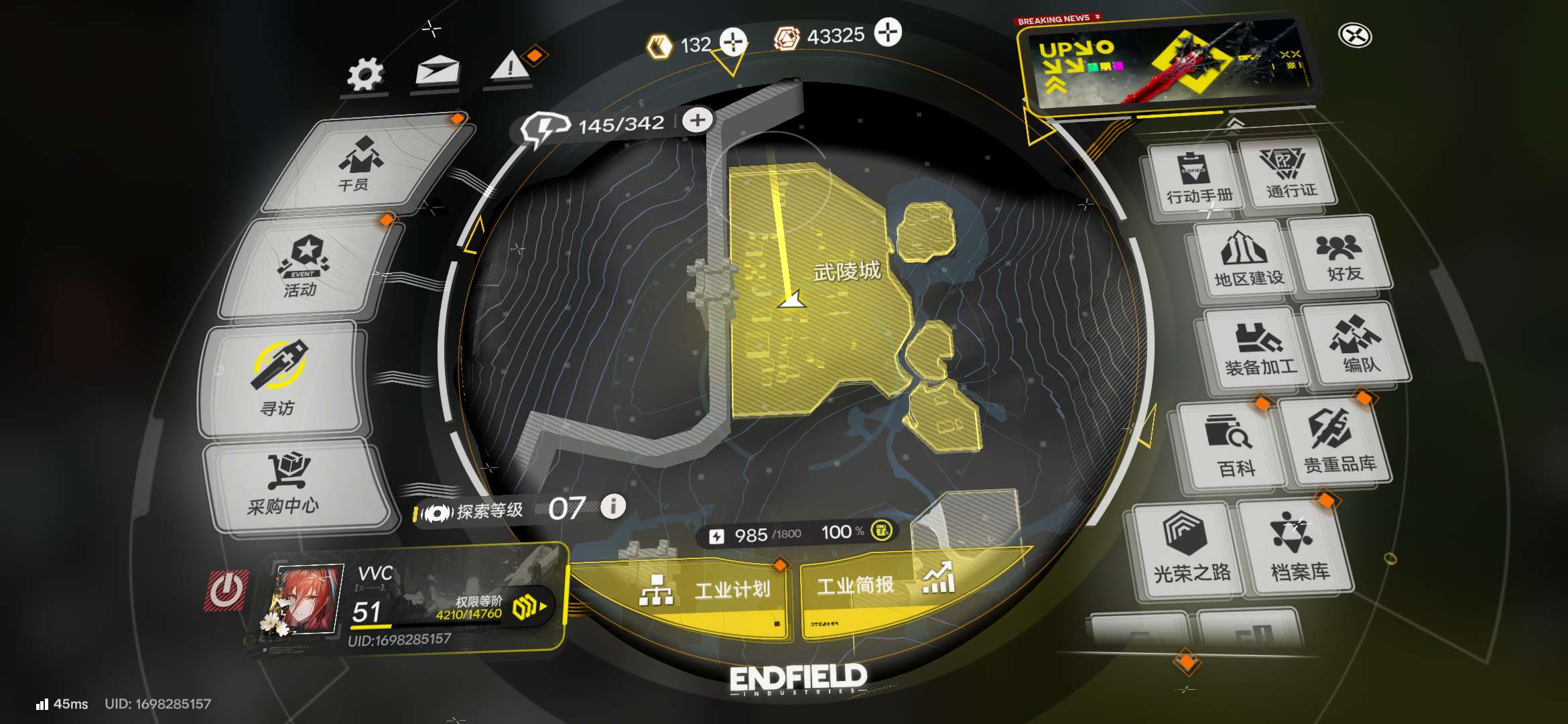 终未地一手号,可换绑可走平台,武器配额:16300,132源石,嵌晶玉:43325,抽卡券32。