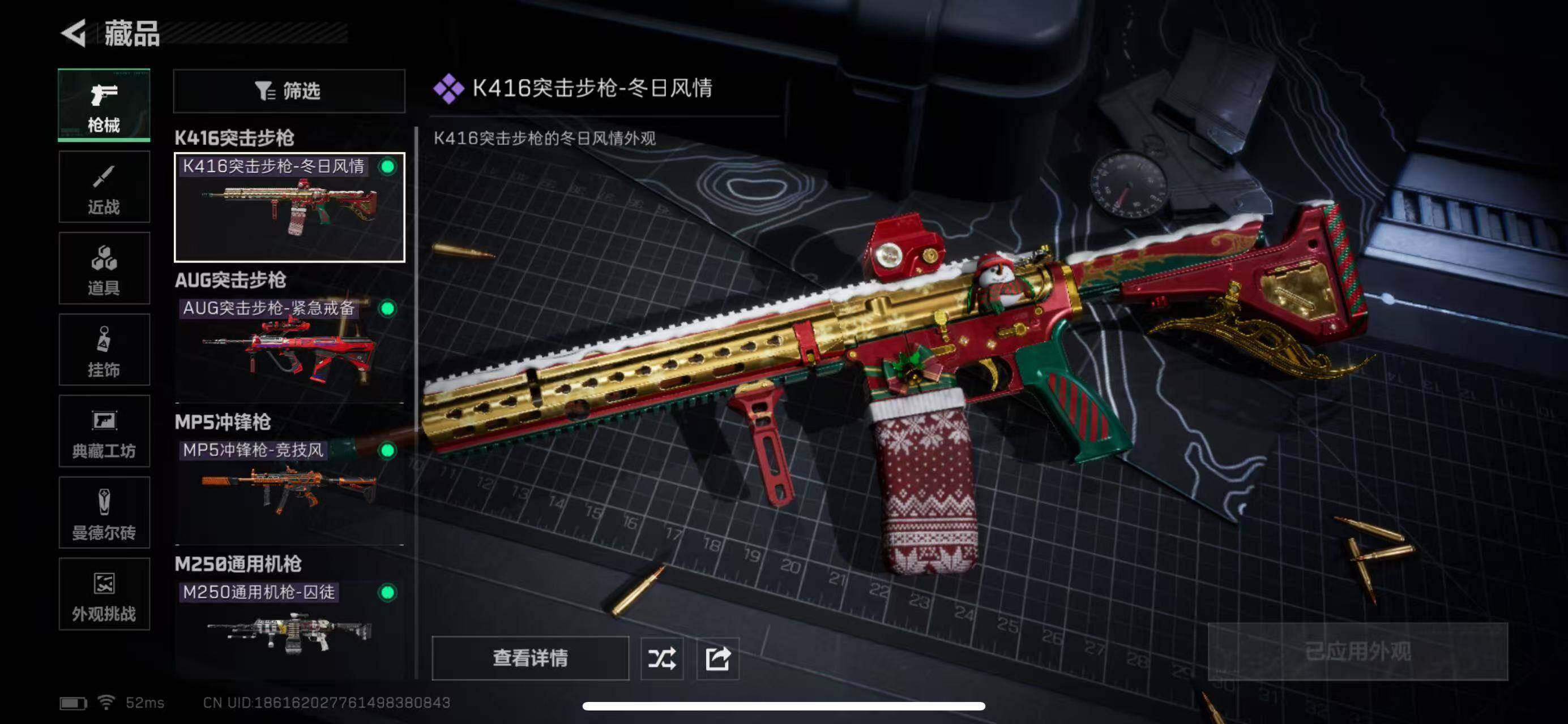 【史诗外观】:K416突击步枪-冬日风情,MP5冲锋枪-竞技风,M250通用机枪-囚徒,M14射手步枪-工业狂潮,M700狙击步枪-竞技风