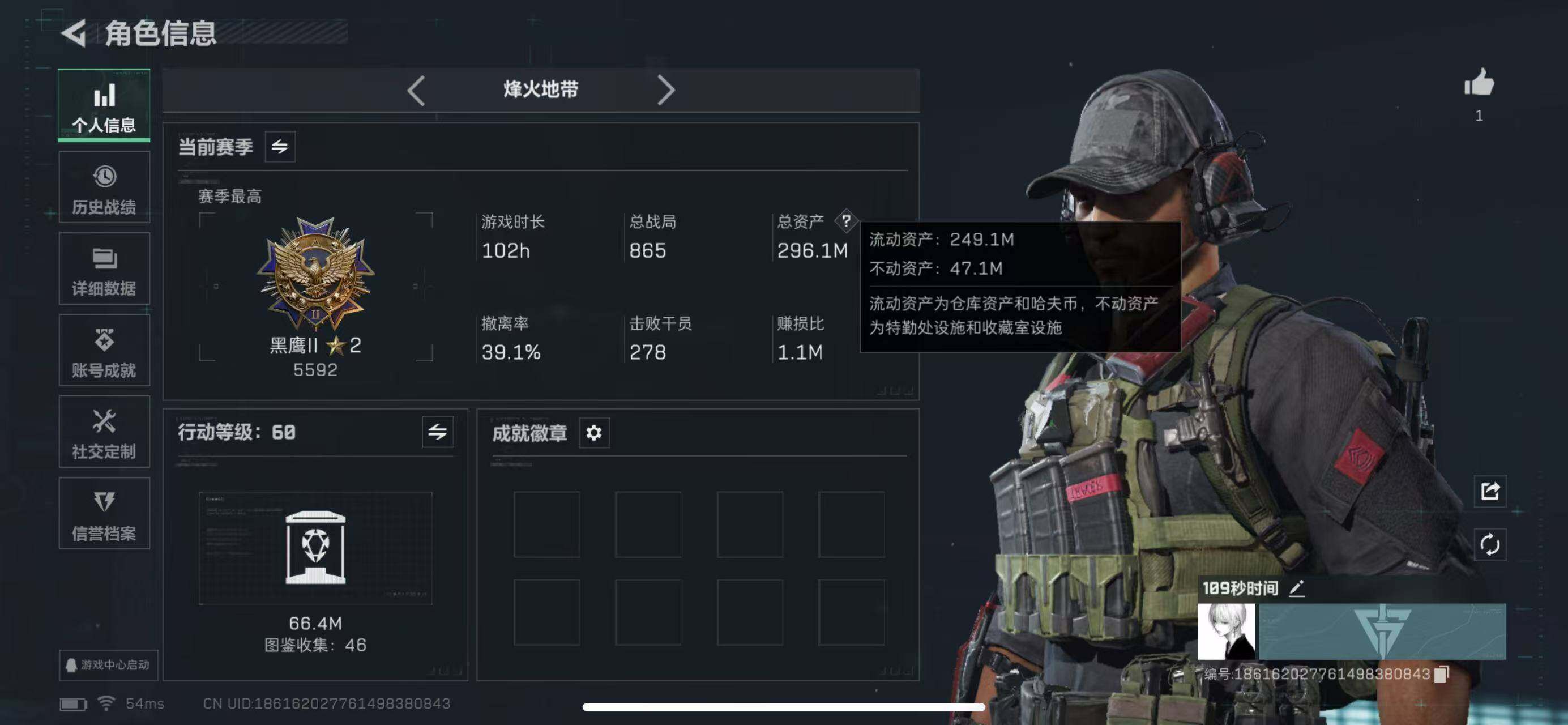 无封禁 行动等级:60 总资产:295.3M 哈夫币:4481.3W