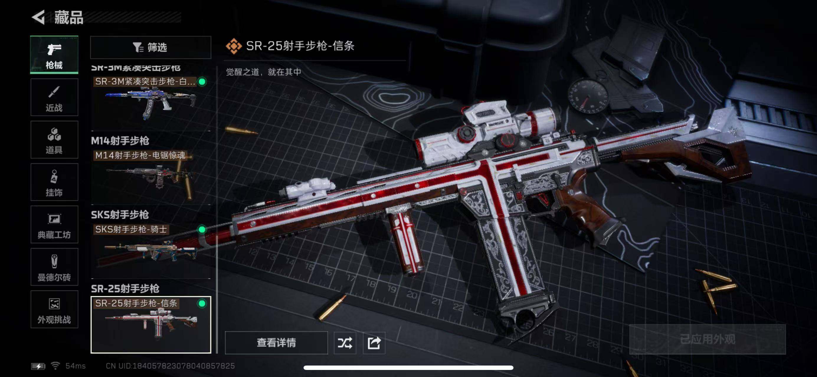 【传说外观】:M4A1突击步枪-蚀金玫瑰,M7战斗步枪-机动小队,SG552突击步枪-运动员,SCAR-H战斗步枪-启航,KC17突击步枪-电锯惊魂,P90冲锋枪-信条,M14射手步枪-电锯惊魂,SR-25