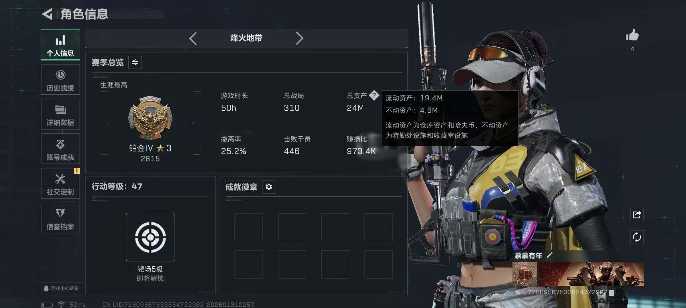 47级/总资24M/流资19M/258点卷/露娜(金牌射手)/4级仓库4级体力3级负重1级潜水