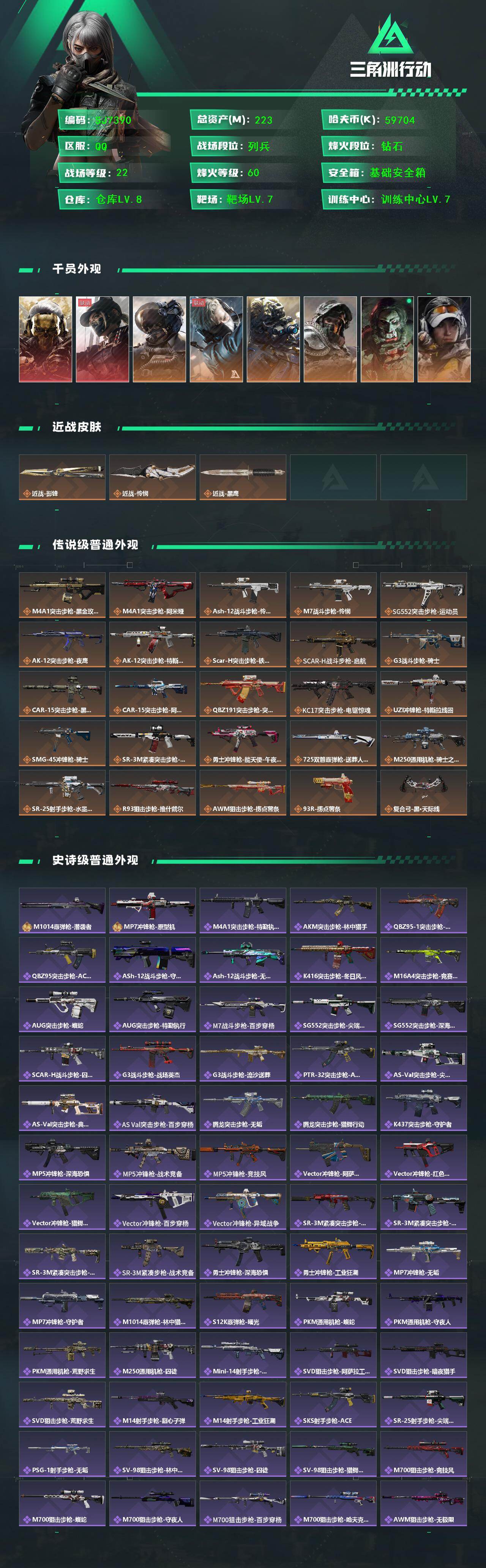 【SJ7390】总资产(M):223M/哈夫币(K):59704K/哈夫币(K):59704K/传说枪皮数:25/全面战场等级:22_段位:列兵/烽火地带等级:60_段位:钻石/红狼-蚀金玫瑰/露娜-黑·天际线/威龙-壮志凌云/蜂医-送葬人·无题密令/无名-夜鹰/深蓝-不破誓约/红狼-电锯惊魂/露娜-金牌射手/近战-影锋/近战-怜悯/近战-黑鹰/M4A1突击步枪-蚀金玫瑰/M4A1突击步枪-阿米娅/ASh-12战斗步枪-怜悯/M7战斗步枪-怜悯/SG552突击步枪-运动员/AK-12突击步枪-夜