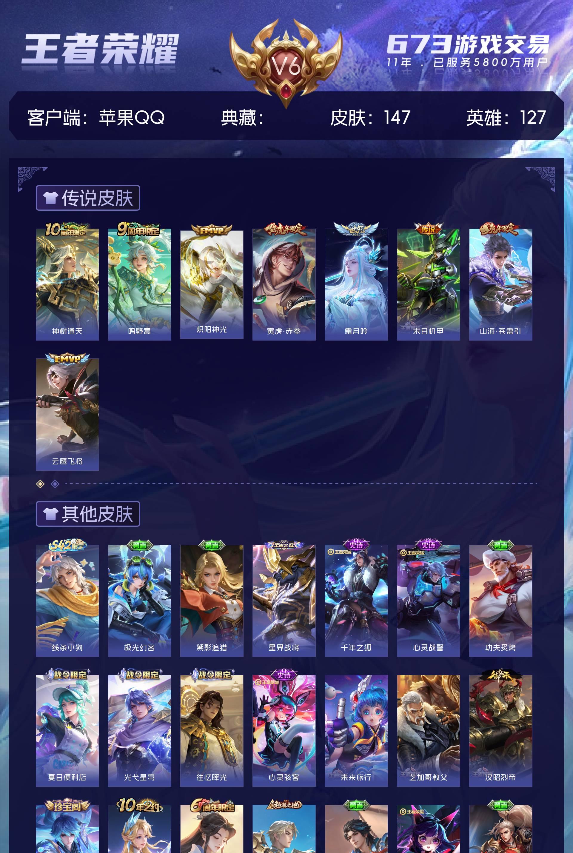 V6 皮肤147 英雄127 至尊星耀 星传说1 传说9 其他皮肤144