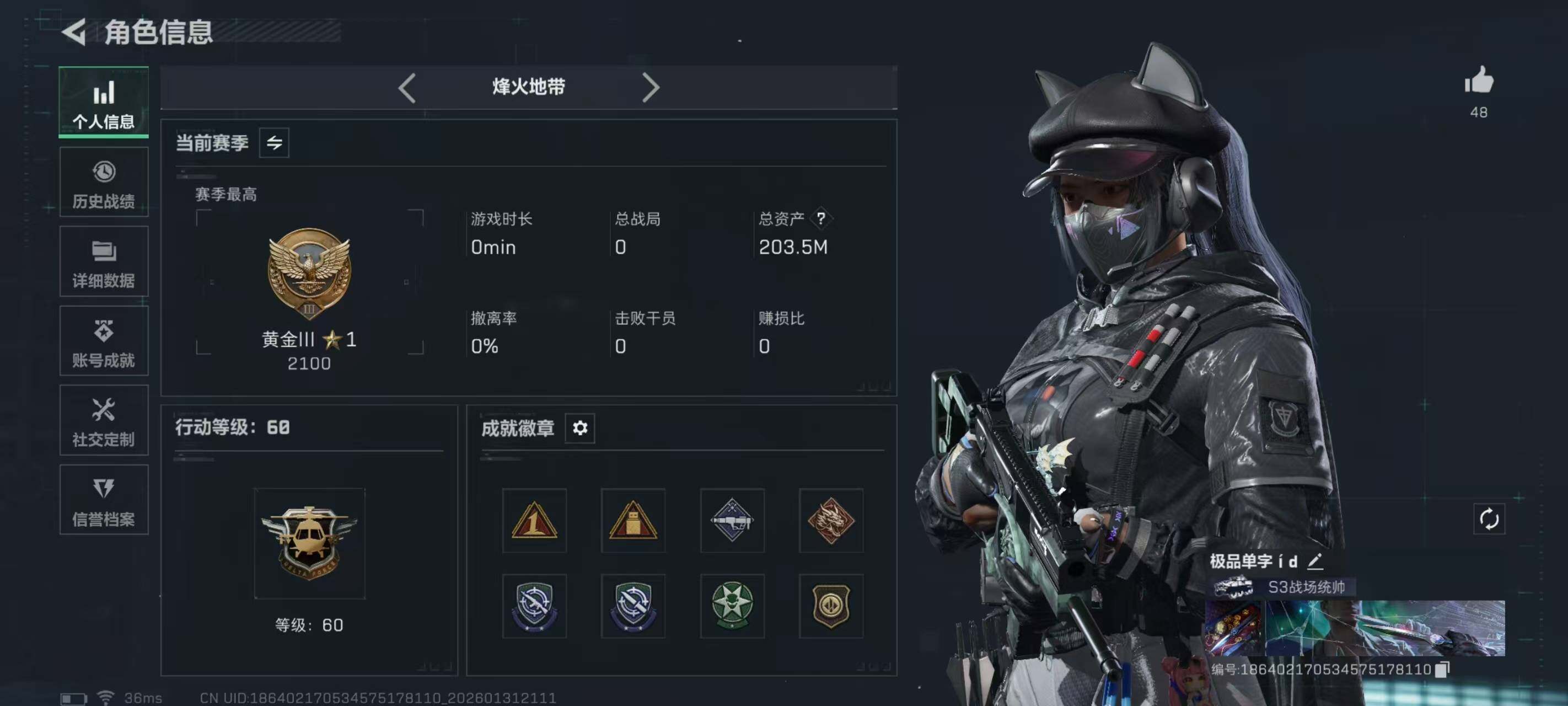 LJ4995总资产203.5M哈弗币135M近战武器-北极星,近战武器-影锋露娜黑天际线,威龙壮志凌云无无AW子弹0发三角币232仓库LV.5基础安全箱靶场LV.4训练中心LV.4无,露娜-黑·天际线,威龙-壮志凌云,近战-北极星,近战-影锋