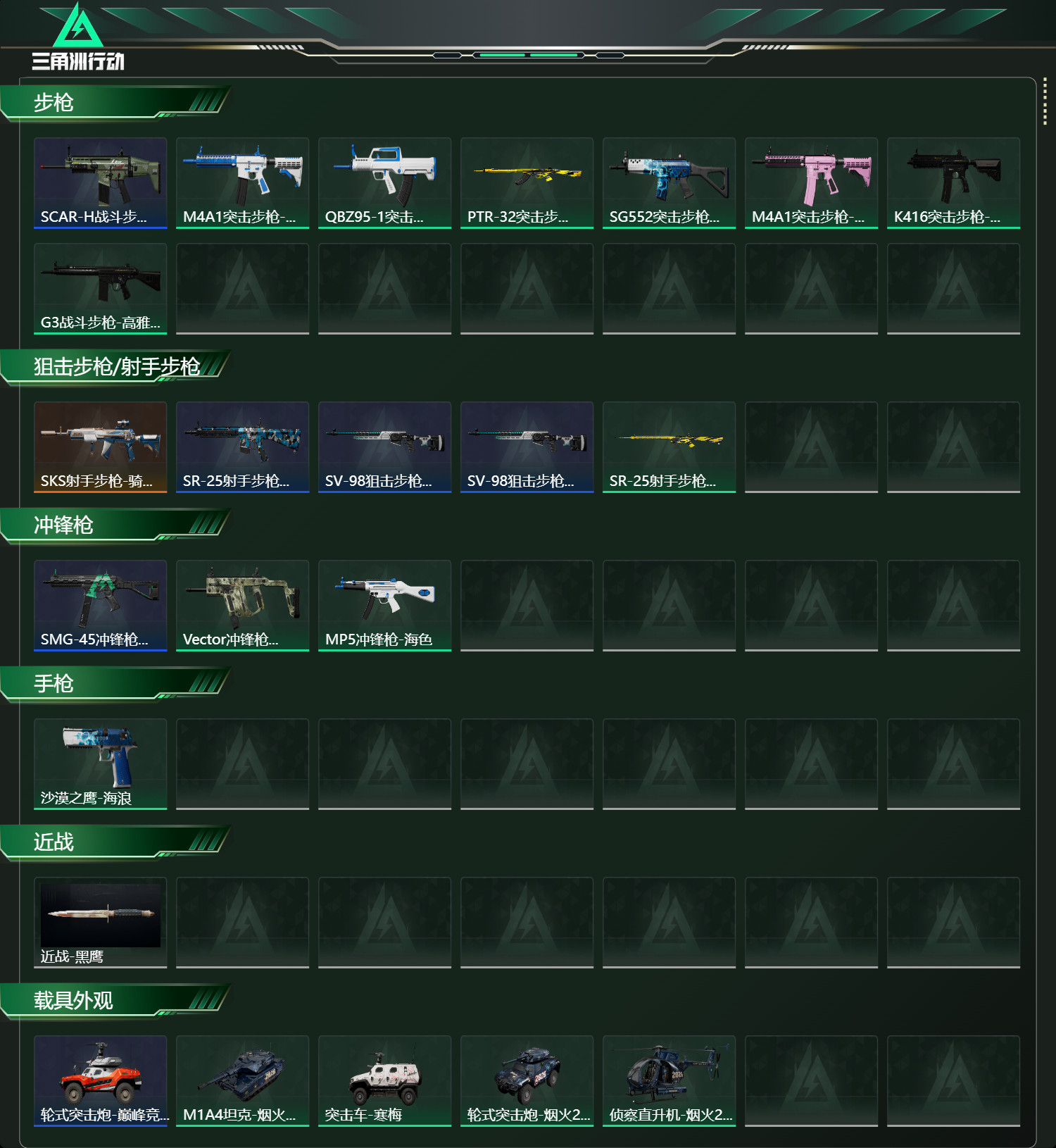 【步枪】SCAR-H战斗步枪-荣耀列队,M4A1突击步枪-海色,QBZ95-1突击步枪-海色,PTR-32突击步枪-黄蜂,SG552突击步枪-海浪,M4A1突击步枪-粉色涂装,K416突击步枪-高雅黑,G3战斗步枪-高雅黑,