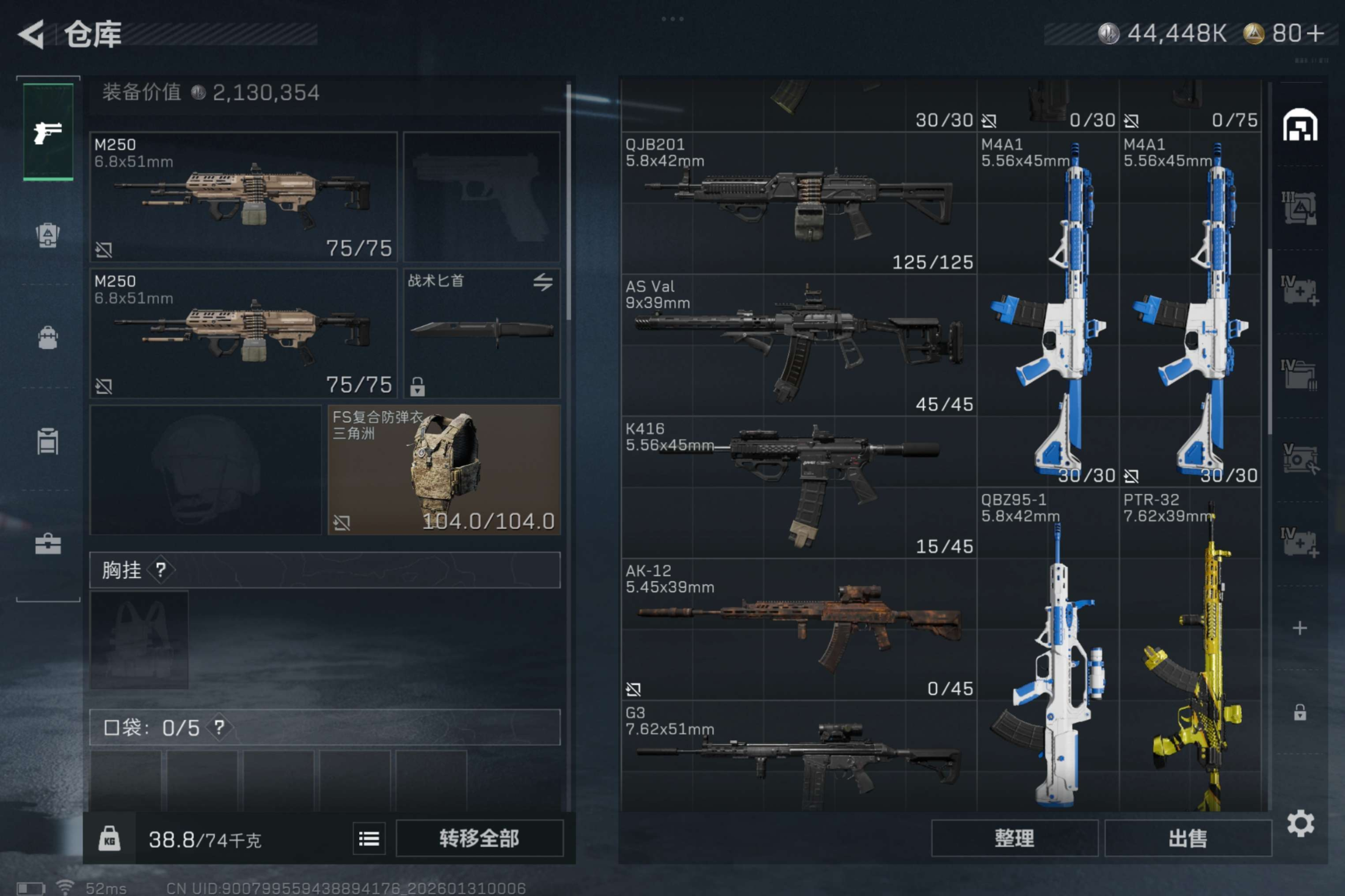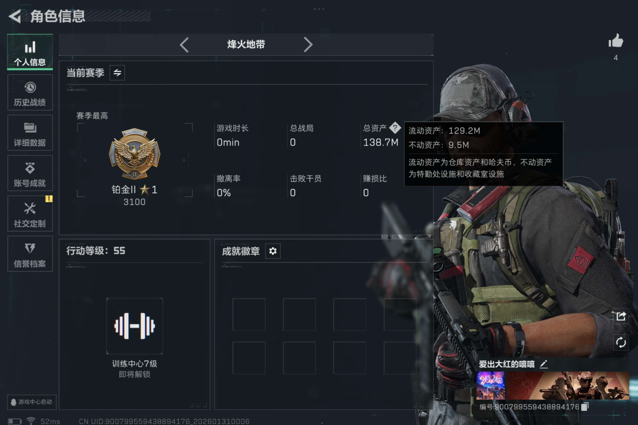 安卓qq/纯资产新手首选极品猛攻号/总资产138.73M,哈夫币 44448.91K,战场等级:1 列兵,行动等级:55 铂金,角色皮肤0,枪皮数量17