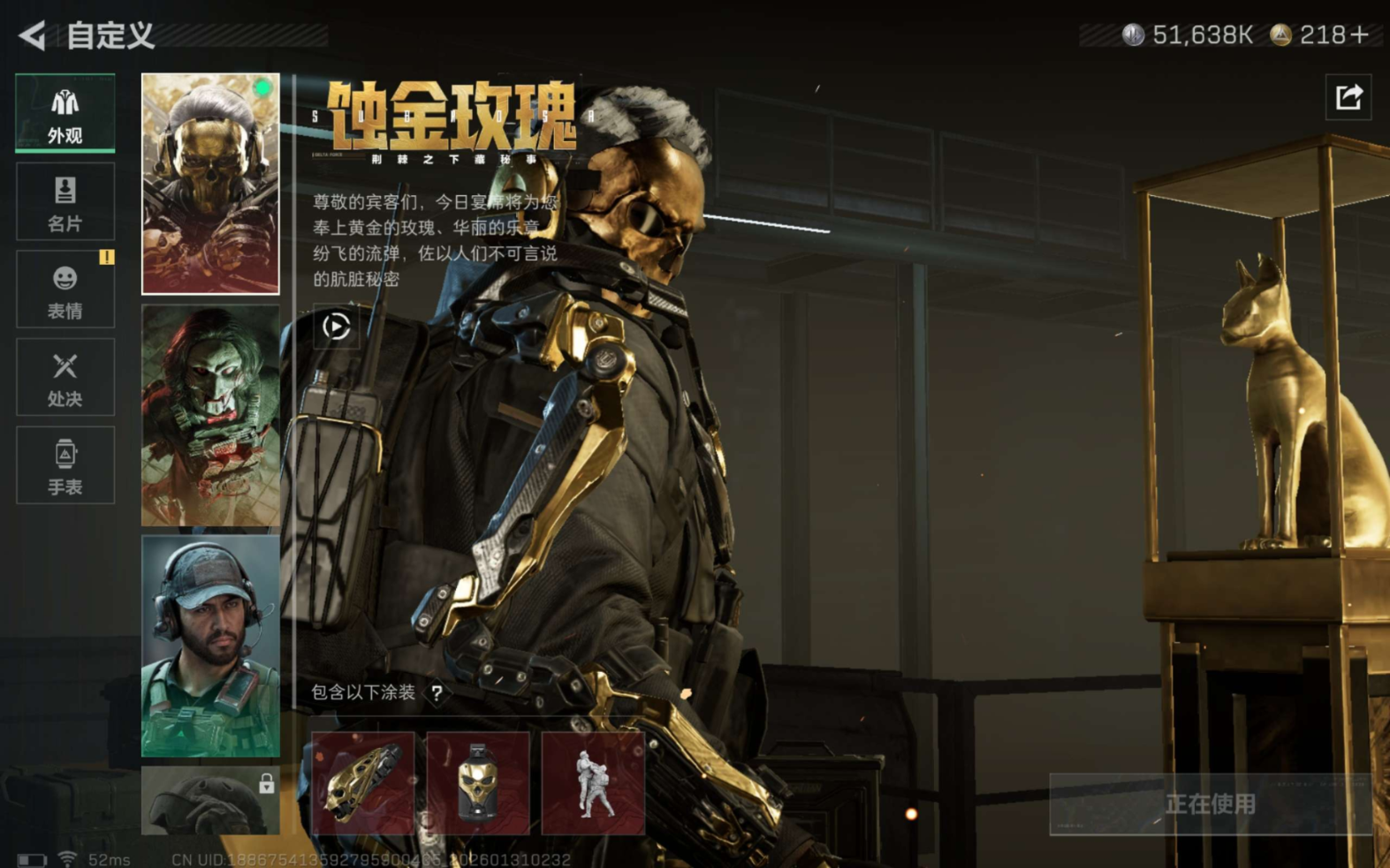 全系统qq-可二次-皮肤号-猛攻哥首选账号-纯币51638k-皮肤:饰金玫瑰-电锯惊魂-水墨云图-骇爪 维什戴尔-总资产134.06M,哈夫币 51638.37K,战场等级:16 上等兵,行动等级:56 黄金,角色皮肤5,枪皮数量62