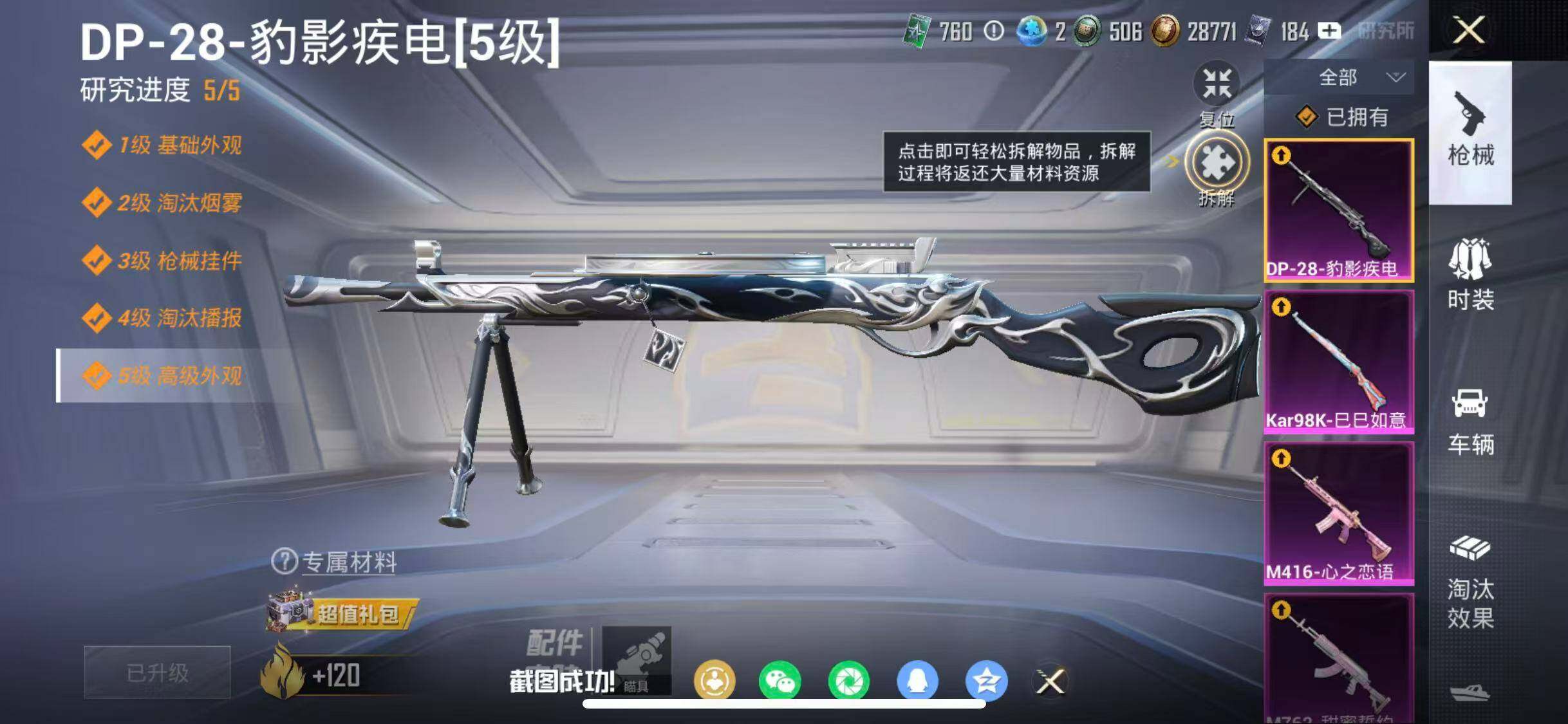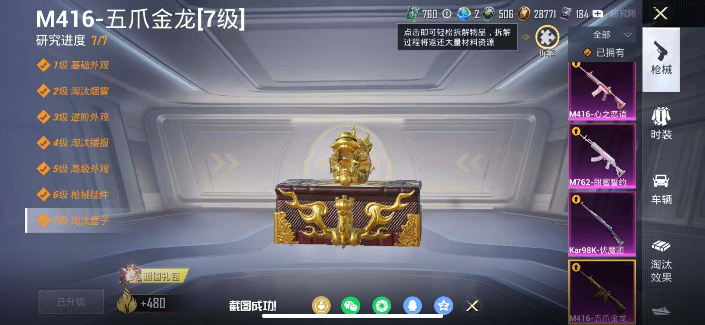 【粉色枪皮等级】:M416-五爪金龙(七级),M416-心之恋语(三级),M762-甜蜜誓约(五级),Kar98K-伏魔团(四