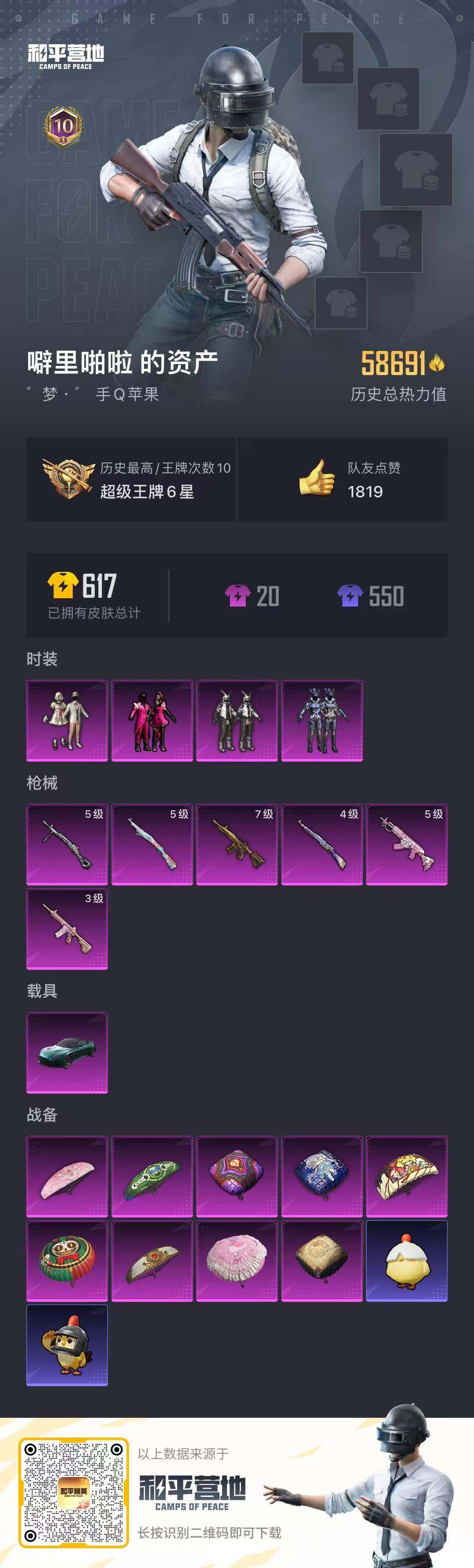 苹果 手Q-4粉装-6特效枪-1载具-0粉色飞行器-58691热力值-10王牌印记-133套装-195枪皮