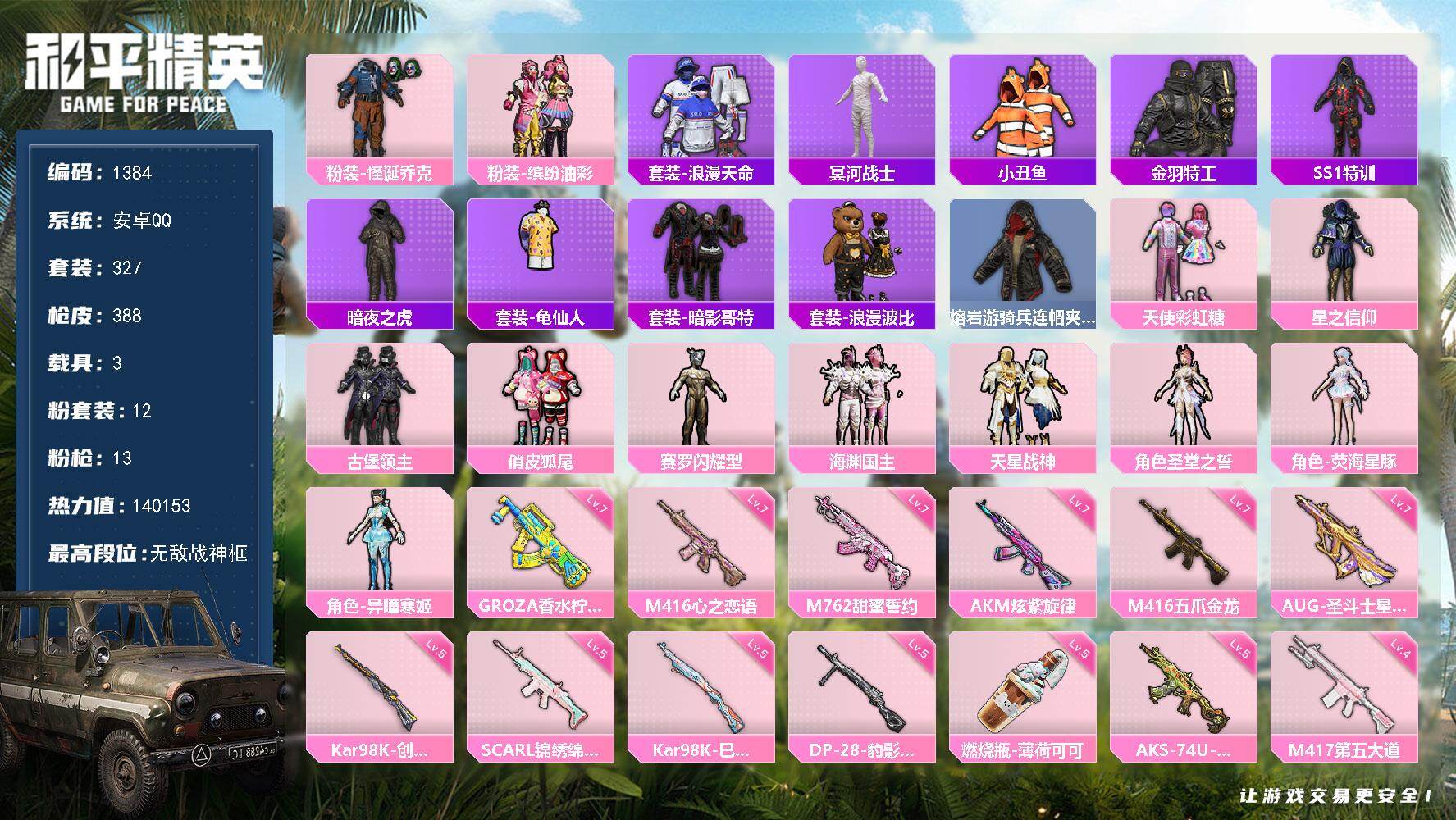 安卓 手Q-无敌战神框-12粉装-13特效枪-3载具-3粉色飞行器-140153热力值-26王牌印记-327套装-388枪皮