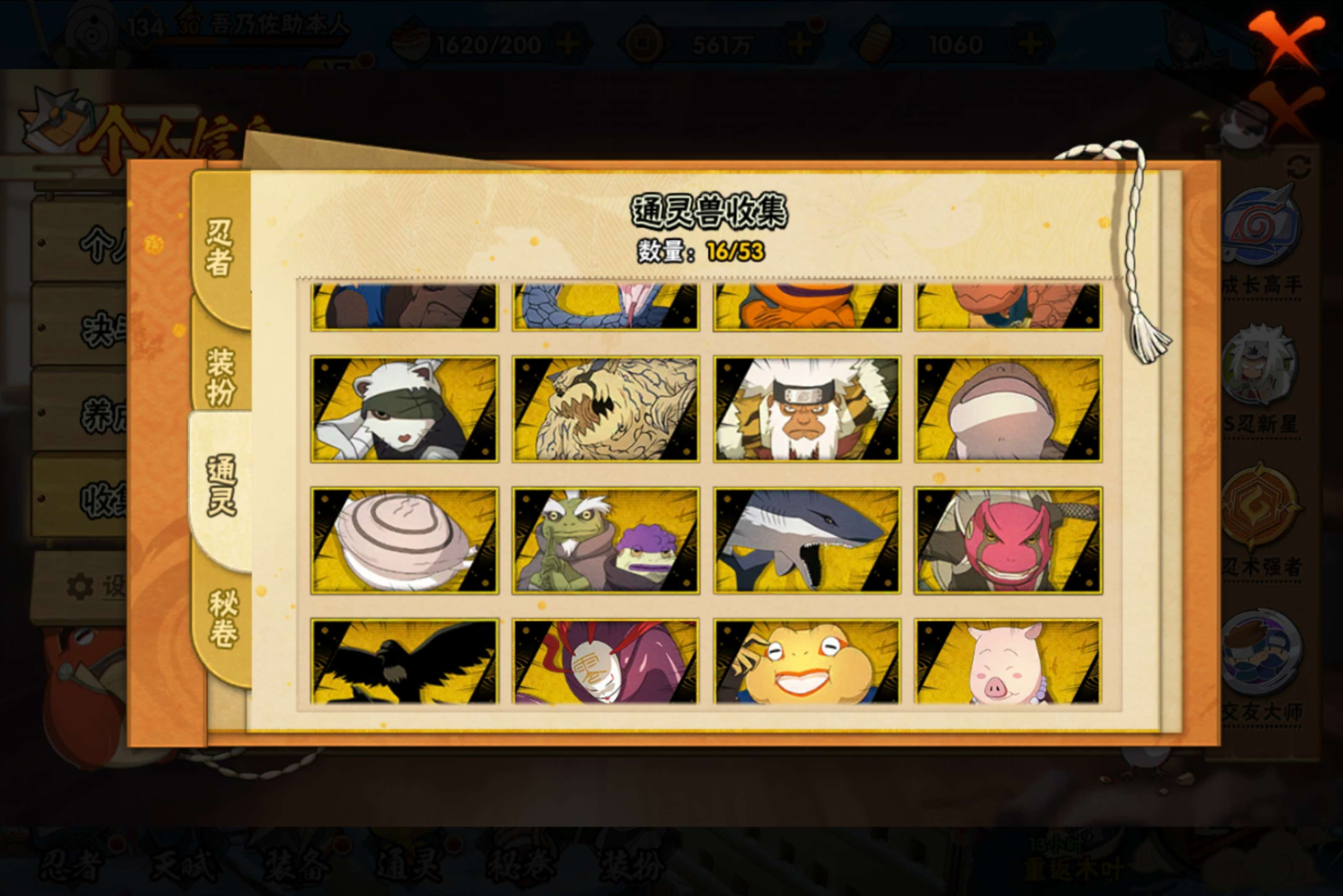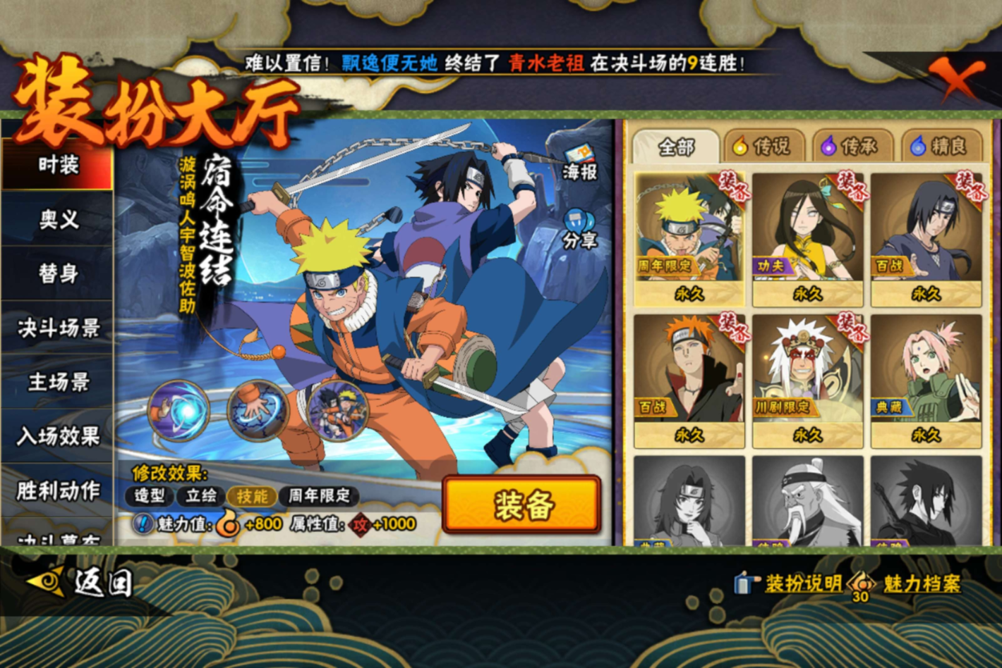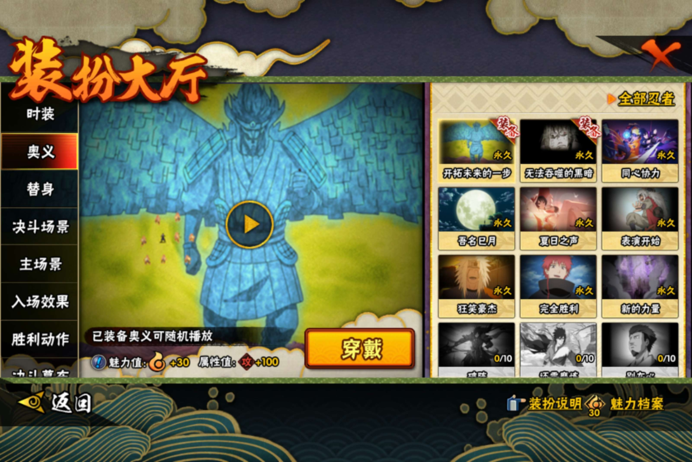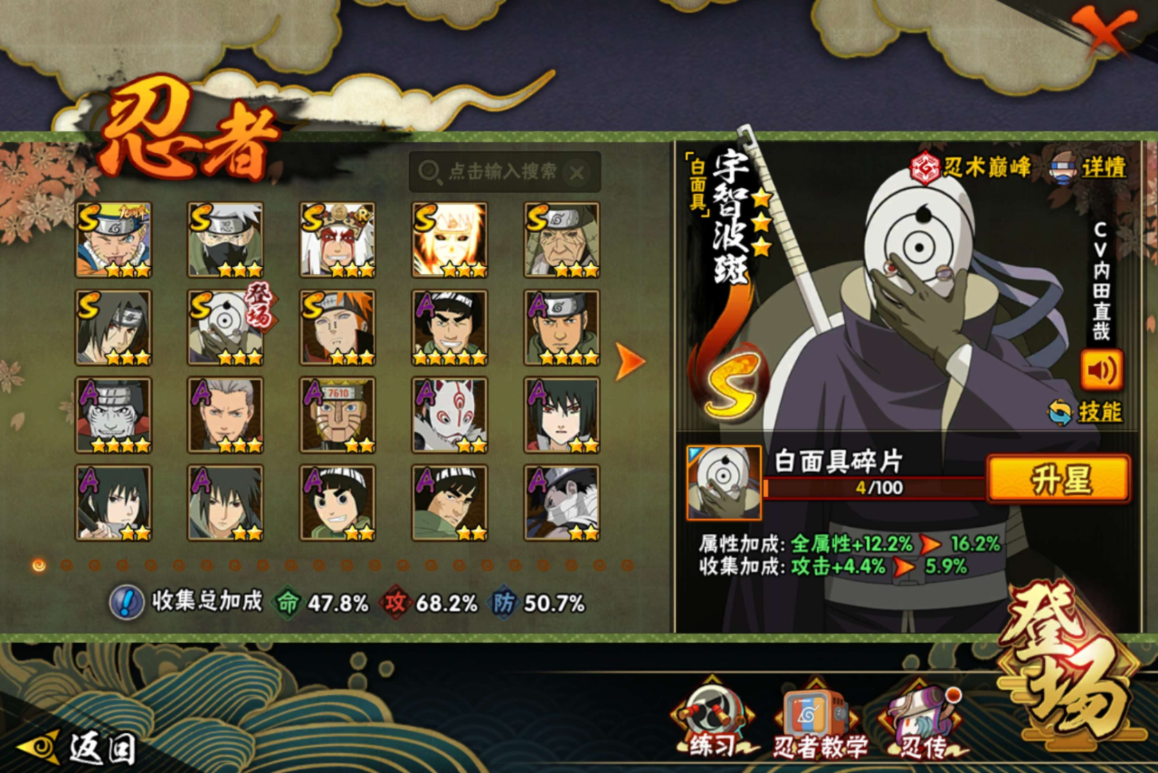 【S级忍者】旗木卡卡西「须佐能乎」(3星),波风水门「九喇嘛连结」(3星),宇智波斑「白面具」(3星),自来也「舞之豪杰」(3星),宇智波鼬「须佐能乎」(3星),漩涡鸣人·宇智波佐助(3星),佩恩「天道」(3星),猿飞日斩「秽土转生」(3星),