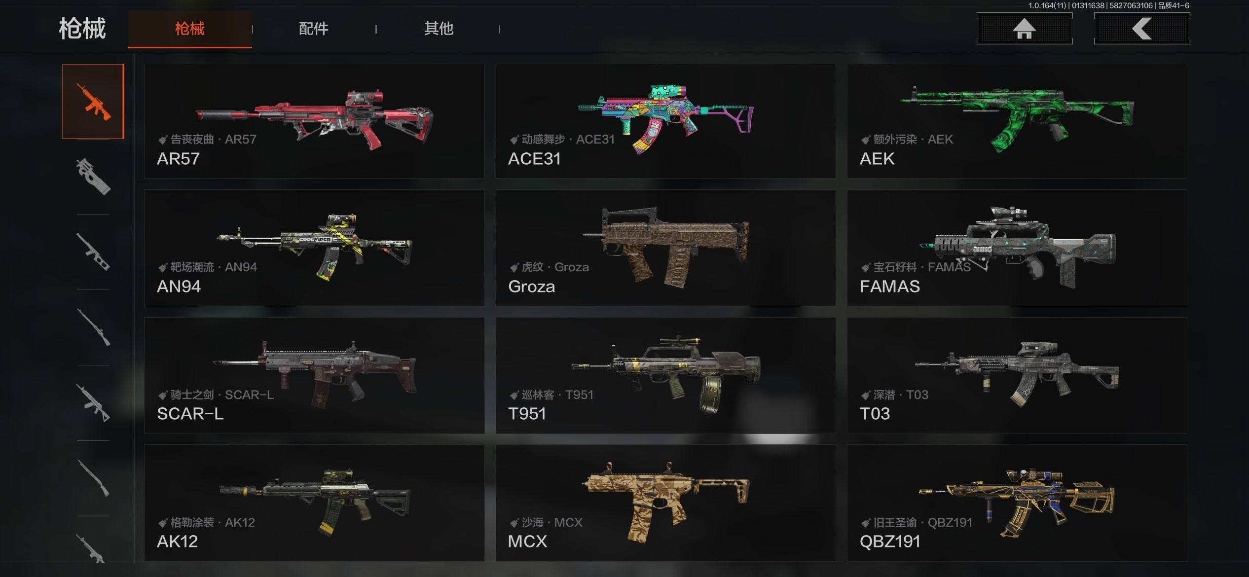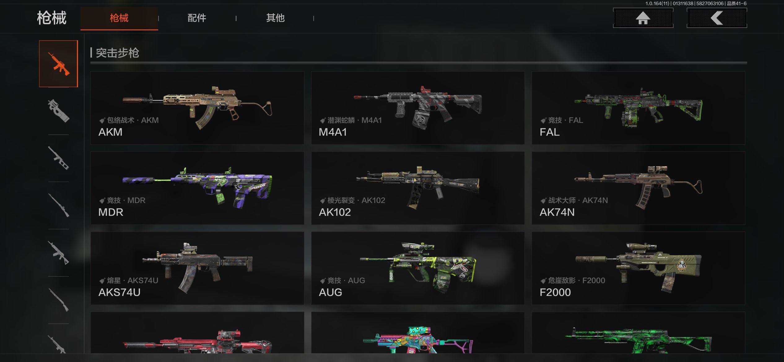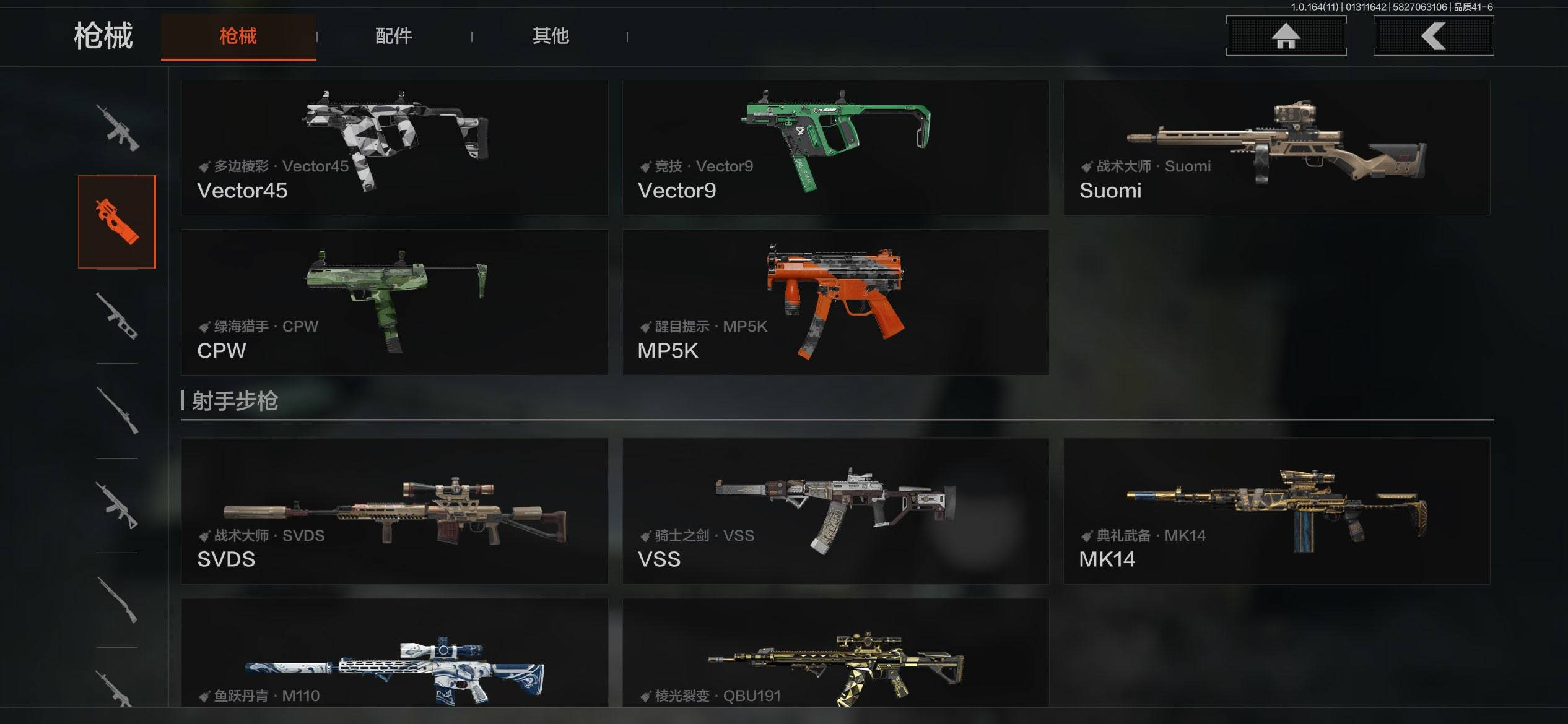 金枪:包络战术AKM,竞技FAL,告丧夜曲AR57,旧王圣谕QBZ191,浮鳞影青QBZ192,利齿风暴MPX,骑士之剑VSS,棱光裂变QBU191