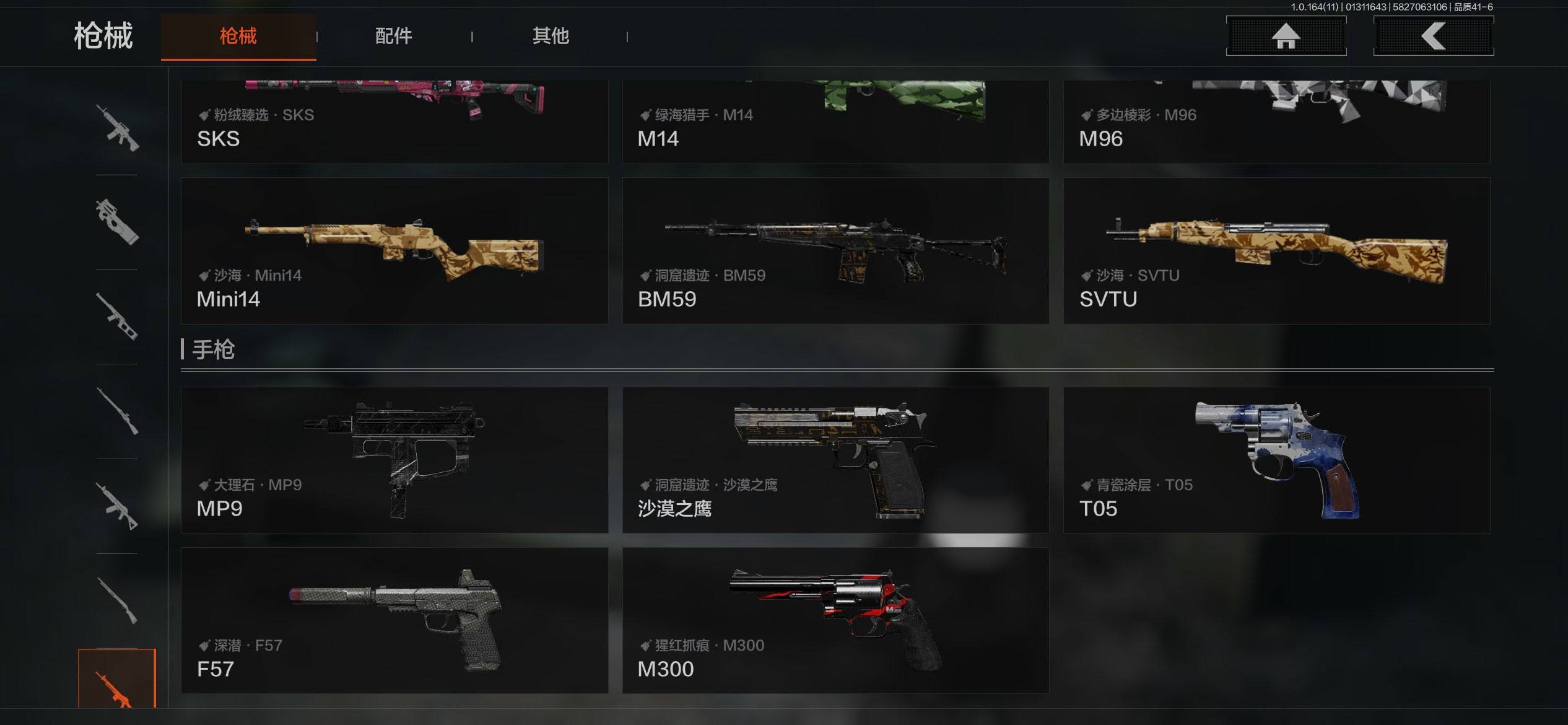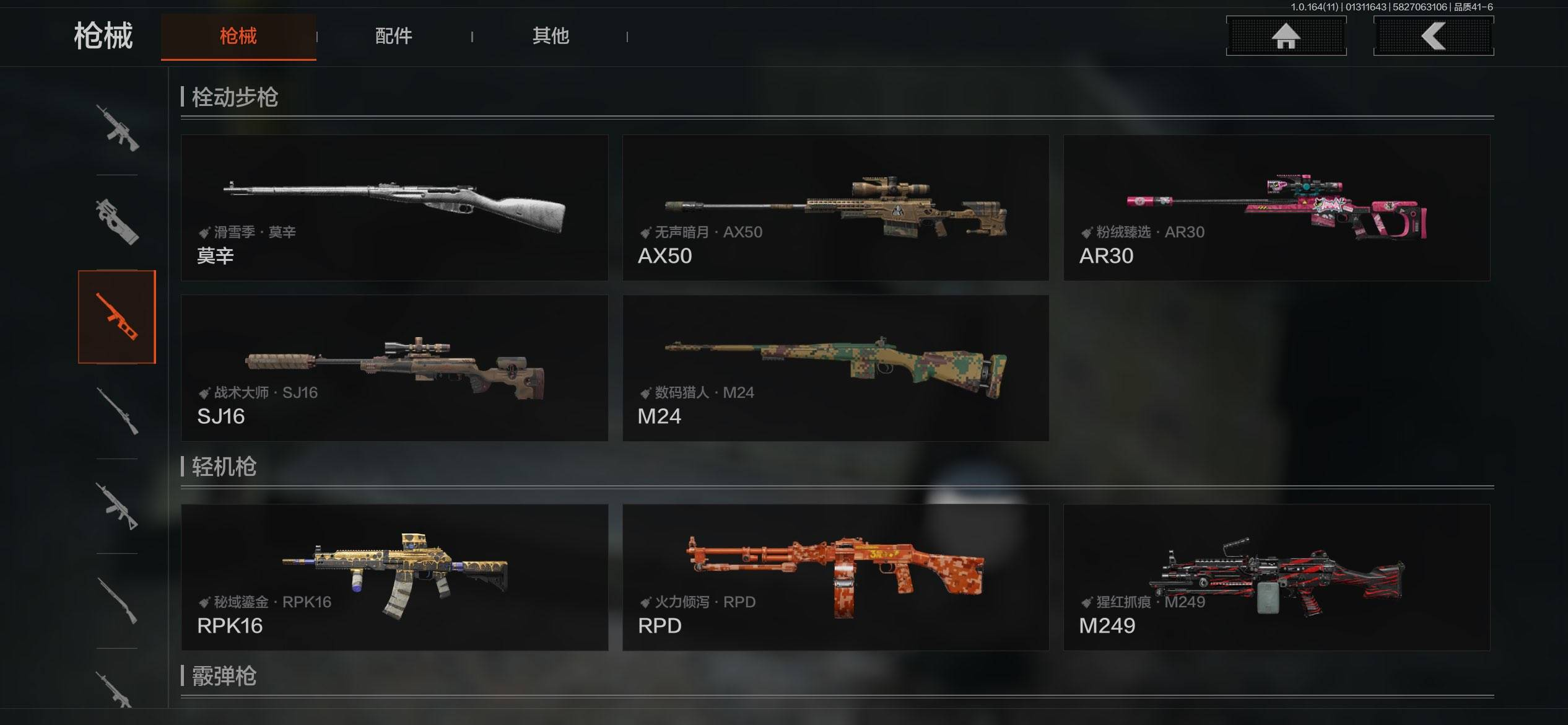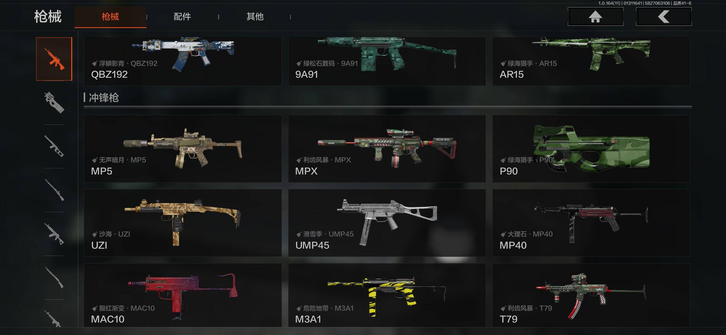 金枪:包络战术AKM,竞技FAL,告丧夜曲AR57,旧王圣谕QBZ191,浮鳞影青QBZ192,利齿风暴MPX,骑士之剑VSS,棱光裂变QBU191