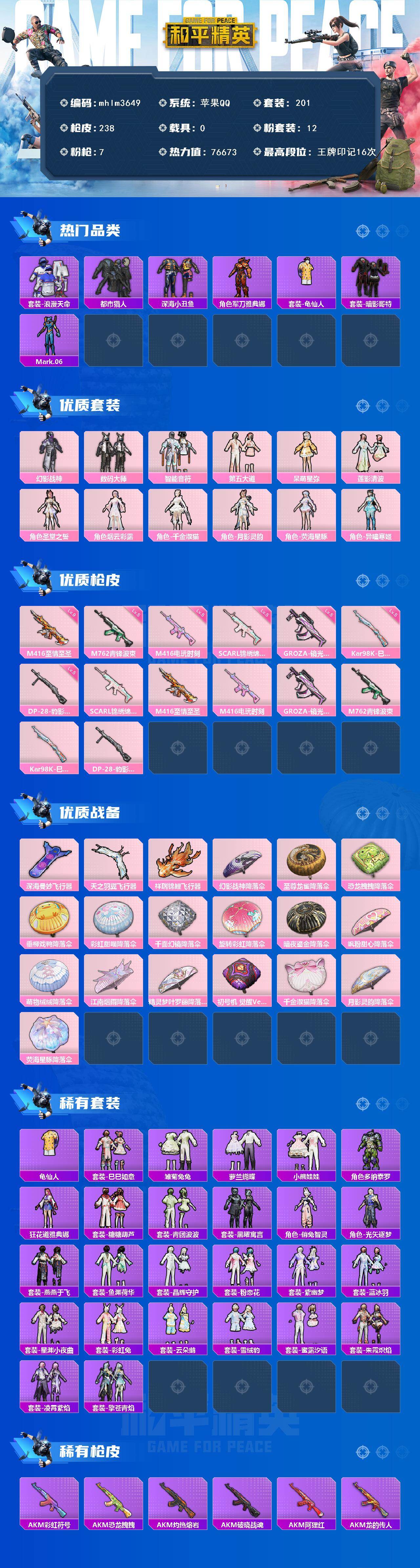 【mhlm3649】苹果 手Q-12粉装-7特效枪-0载具-4粉色飞行器-76673热力值-16王牌印记-201套装-238枪皮