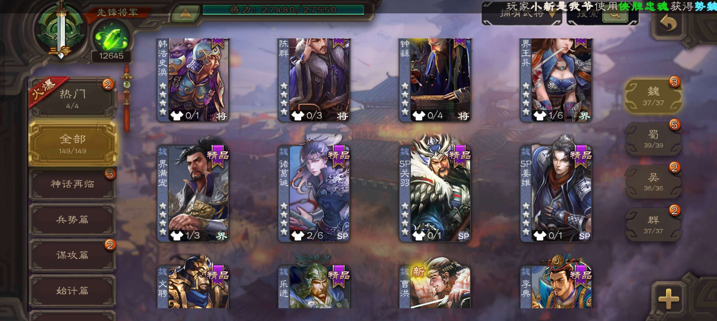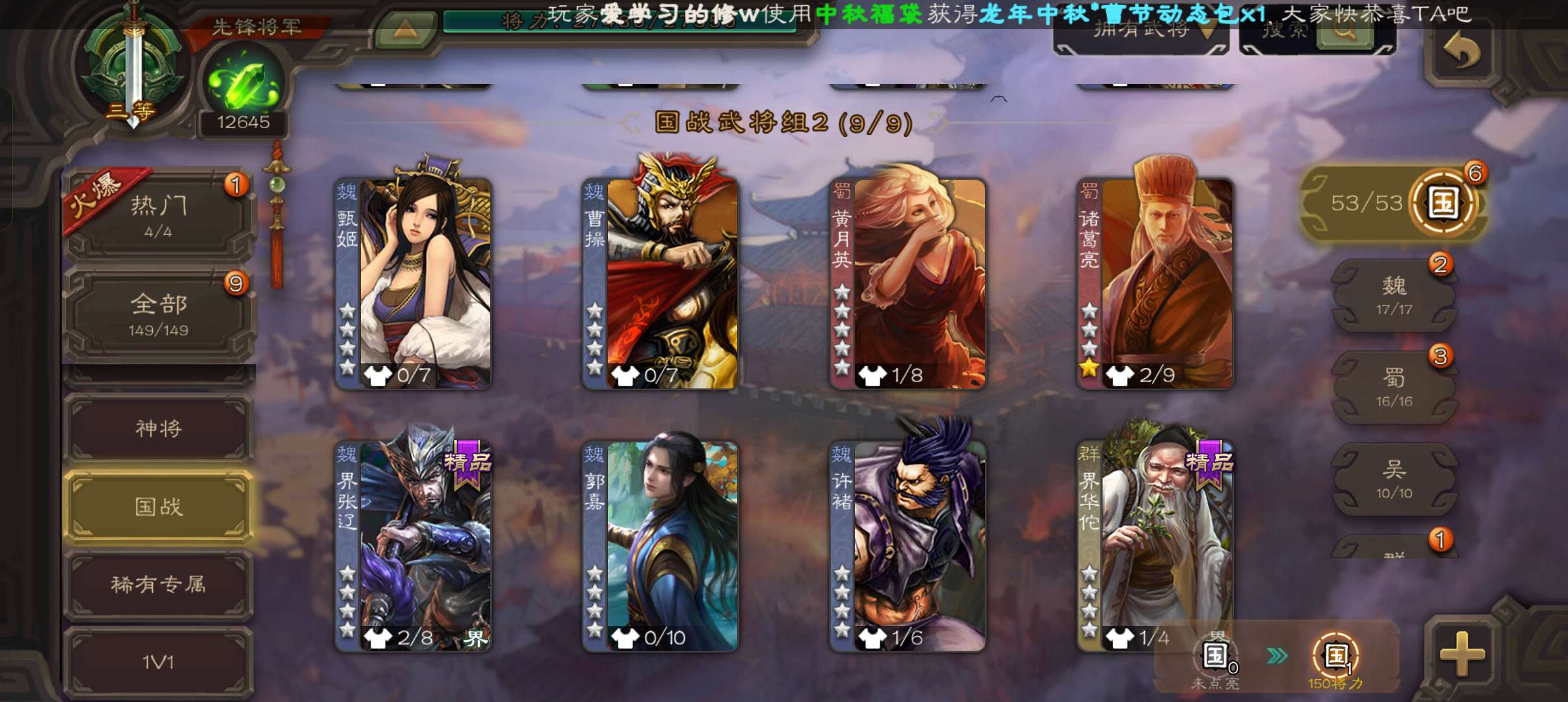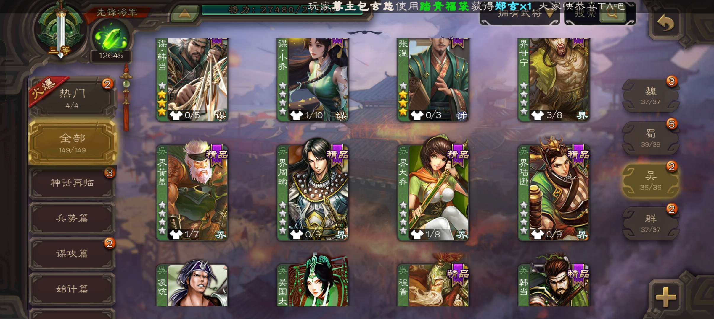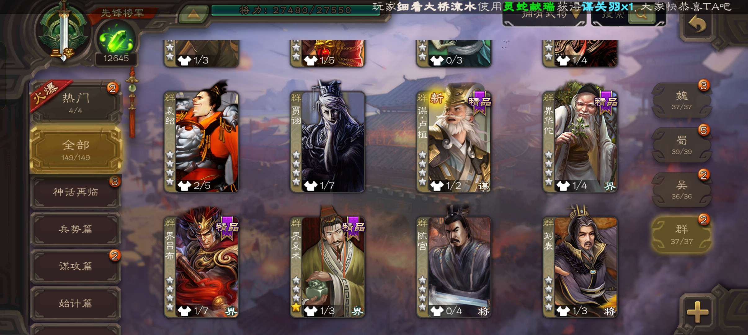 8.5万羽毛1.2万将魂7万豆,大宝界徐盛沮授双史诗先锋,谋韩当谋卢植谋小乔界满宠关银屏149将
