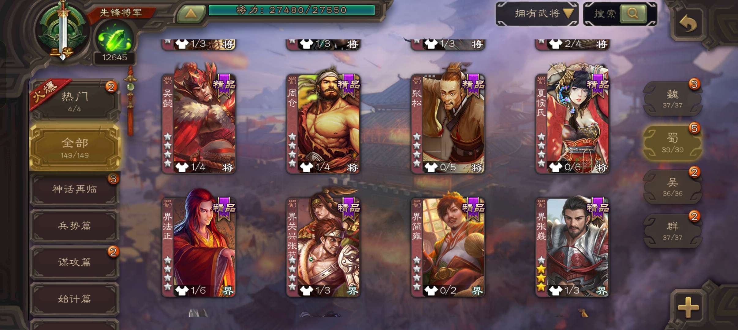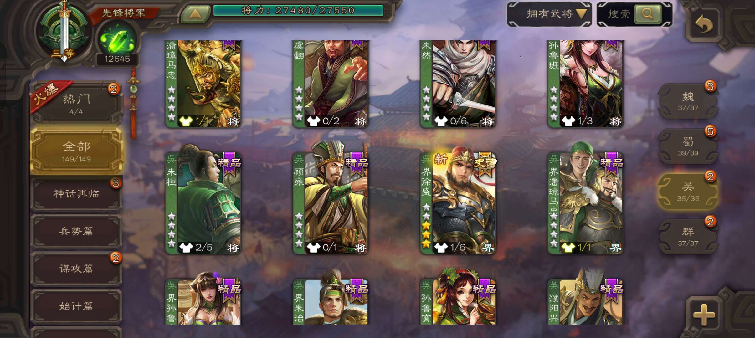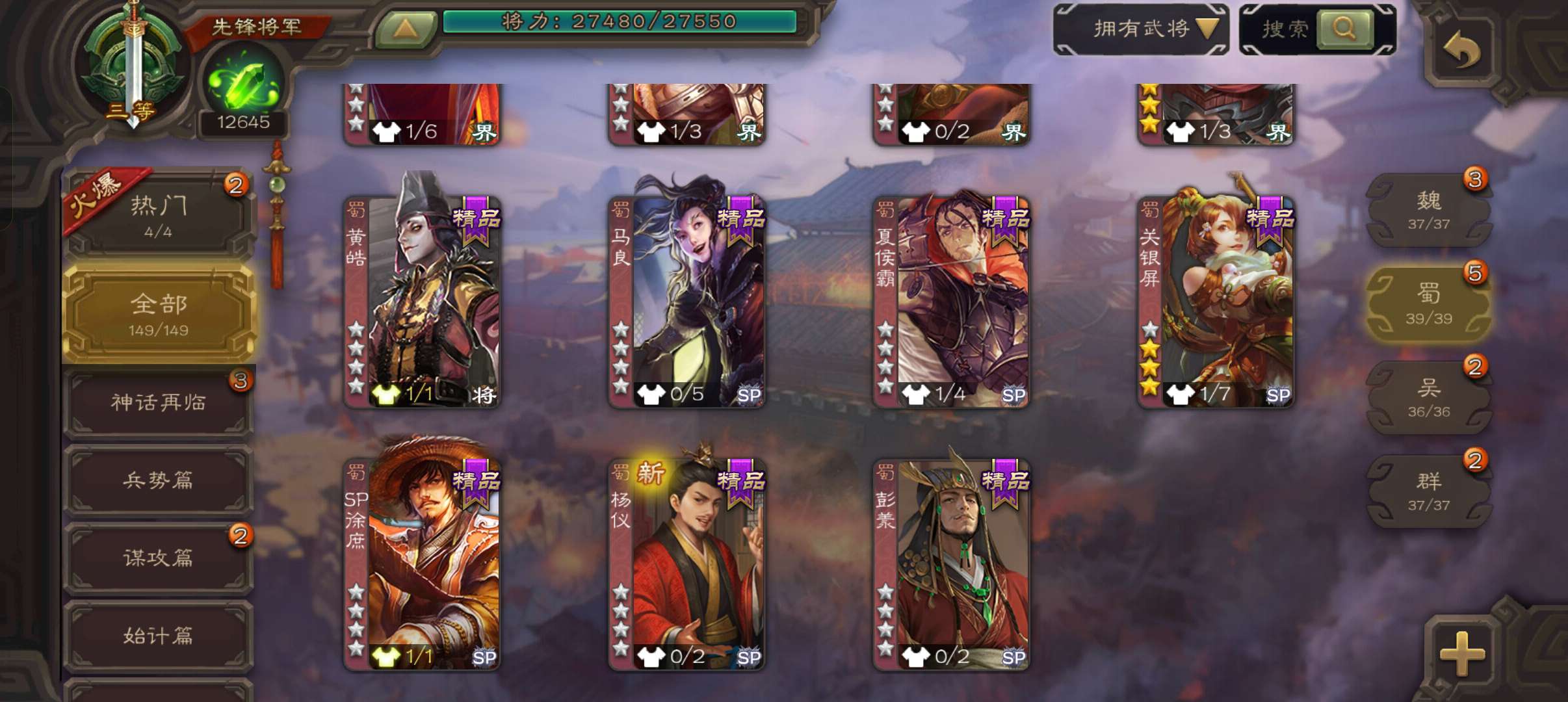 8.5万羽毛1.2万将魂7万豆,大宝界徐盛沮授双史诗先锋,谋韩当谋卢植谋小乔界满宠关银屏149将