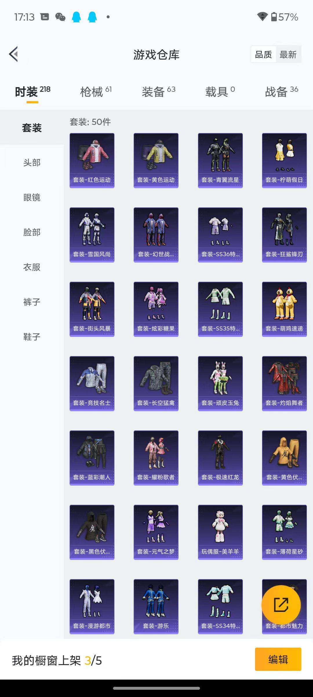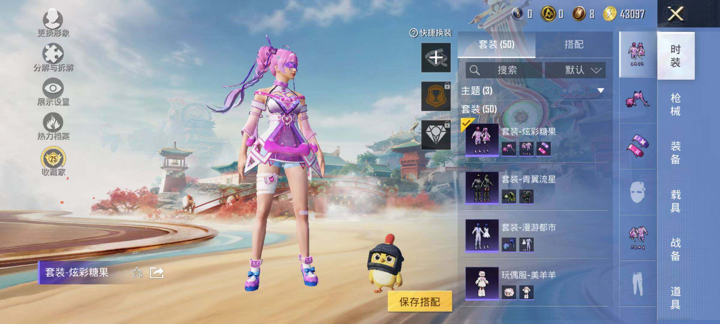 50套装/枪械2/装备63/战备36/热力值14793/五级Kar98K-巳巳如意/五级DP-28-豹影疾电/Kar98K-巳巳如意/DP-28-豹影疾电/绯穹魔姬降落伞/异瞳寒姬降落伞/炫彩糖果降落伞/巳巳如意/套装-雪国风尚/套装-炫彩糖果/玩偶服-美羊羊/AUG-冰晶雪宝/AKM-破晓战魂/SCAR-L-夜灯/SCAR-L-炫彩节奏/SCAR-L-红色方程式/M416-红色方程式/M416
