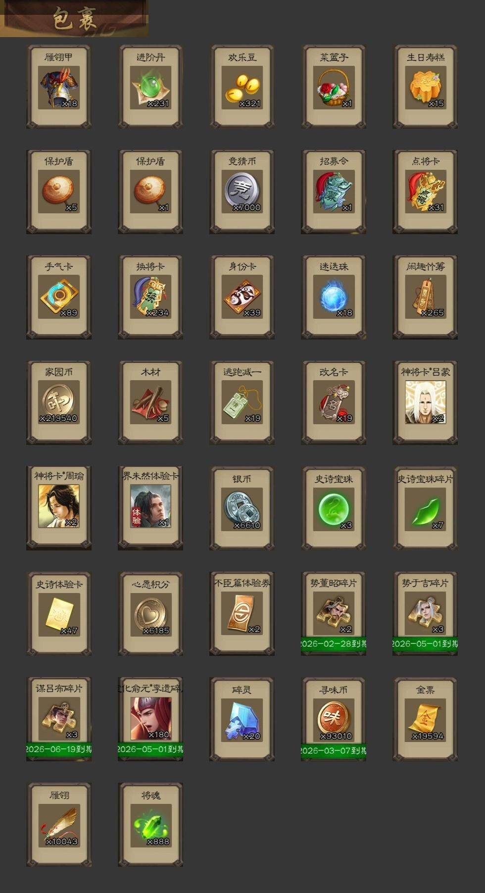 官阶:骠骑将军;VIP等级:VIP7;史诗武将数量:30;动态皮肤数量:19;武将总数:313;史诗宝珠数量:3;将魂数量:888;神将:0;魏国史诗武将:8;蜀国史诗武将:8;吴国史诗武将:3;群史诗武将:9