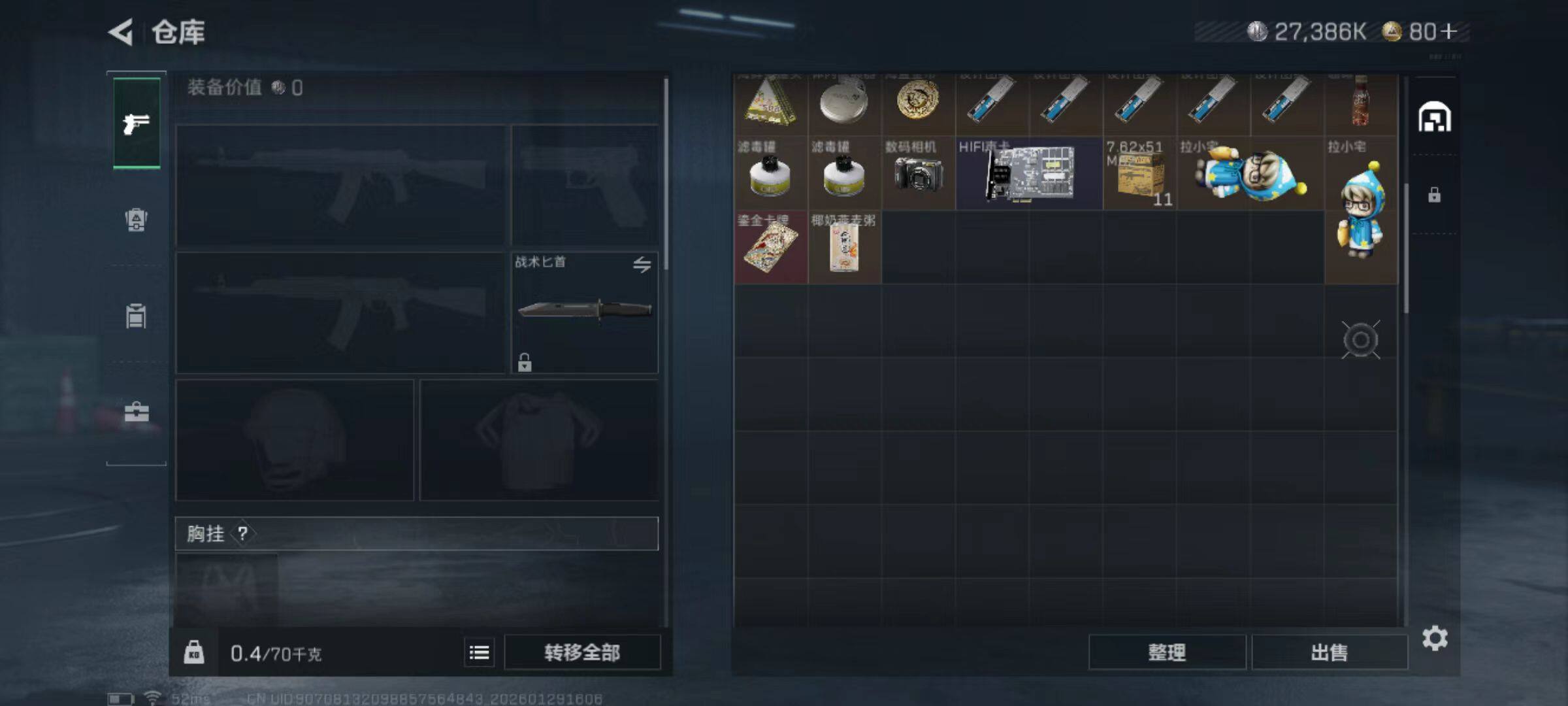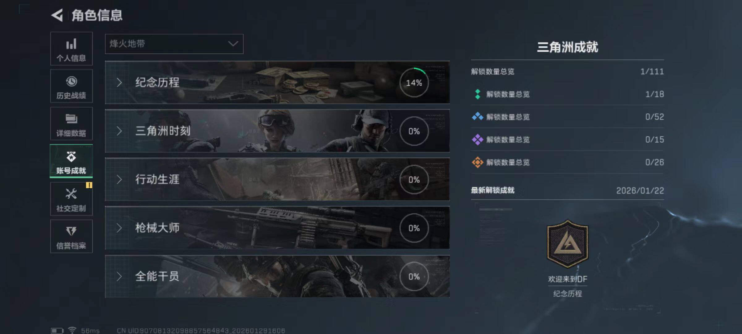 总资产(M):33M/哈夫币(K):27386K/哈夫币(K):27386K/全面战场等级:1_段位:无段位/烽火地带等级:18_段位:青铜/M250通用机枪-囚徒/M700狙击步枪-哈夫克警备/MP5冲锋枪-弄臣/SMG-45冲锋枪-幻影结构/勇士冲锋枪-冰天雪地/QJB201轻机枪-哈夫克卫队/M4A1突击步枪-粉色涂装/M4A1突击步枪-海色/QBZ95-1突击步枪-高雅黑/K416突击步
