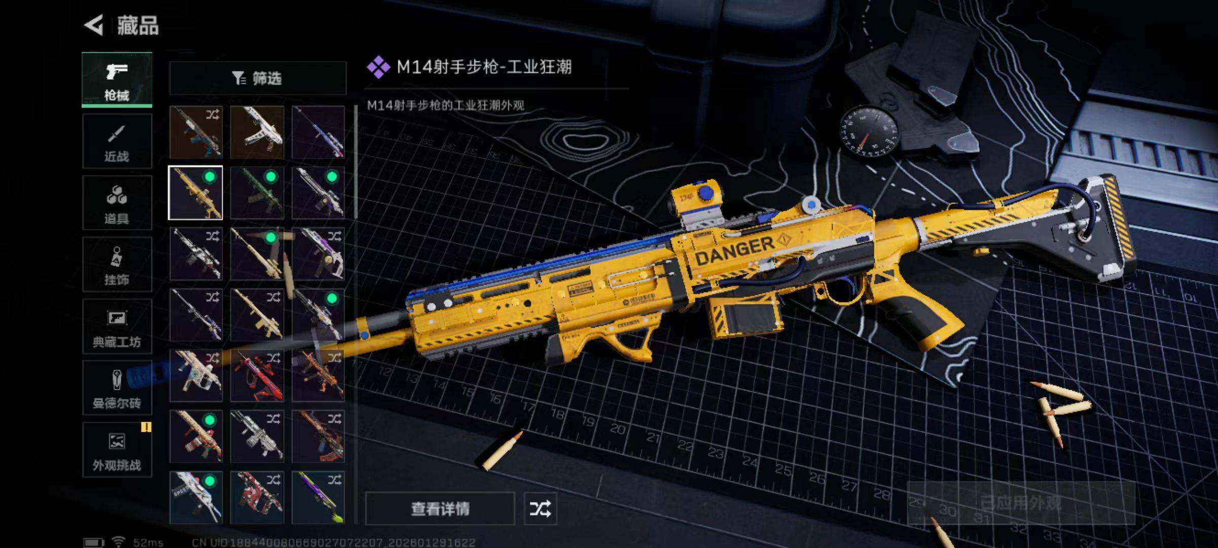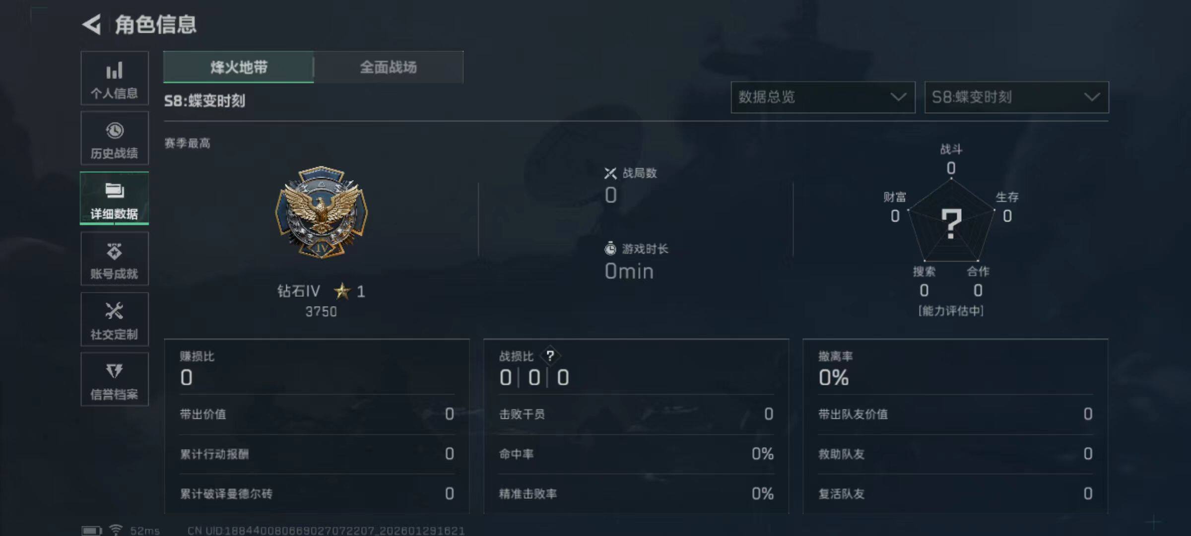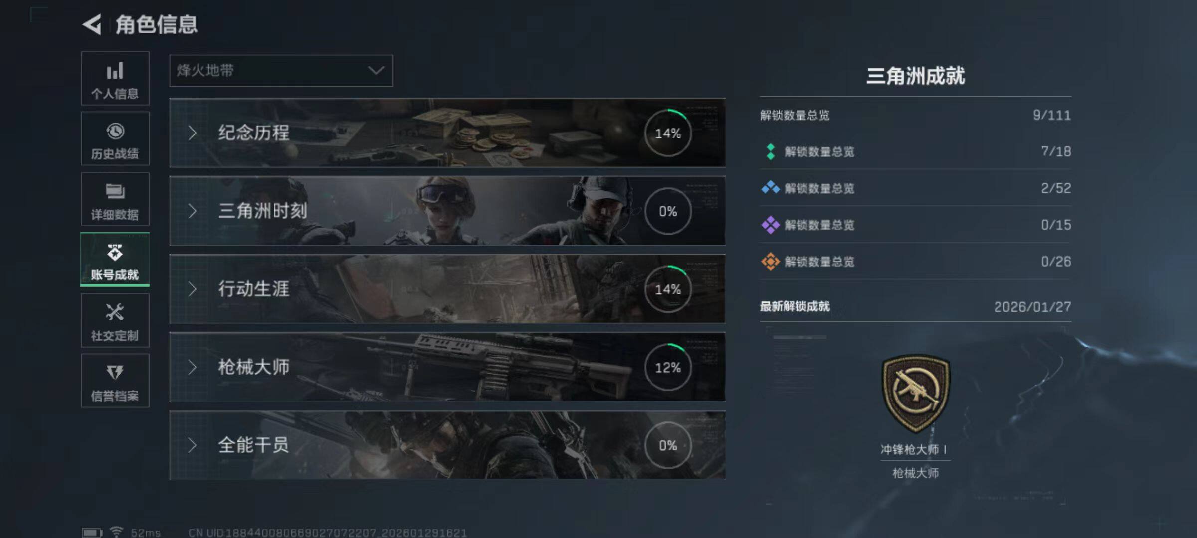 总资产(M):43M/哈夫币(K):452K/哈夫币(K):452K/传说枪皮数:1/全面战场等级:33_段位:军士长/烽火地带等级:55_段位:钻石/露娜-金牌射手/近战-黑鹰/SG552突击步枪-运动员/QBZ95-1突击步枪-曙光/K416突击步枪-冬日风情/M7战斗步枪-百步穿杨/G3战斗步枪-流沙送葬/AS Val突击步枪-百步穿杨/腾龙突击步枪-猎鳄行动/MP5冲锋枪-竞技风/Vec