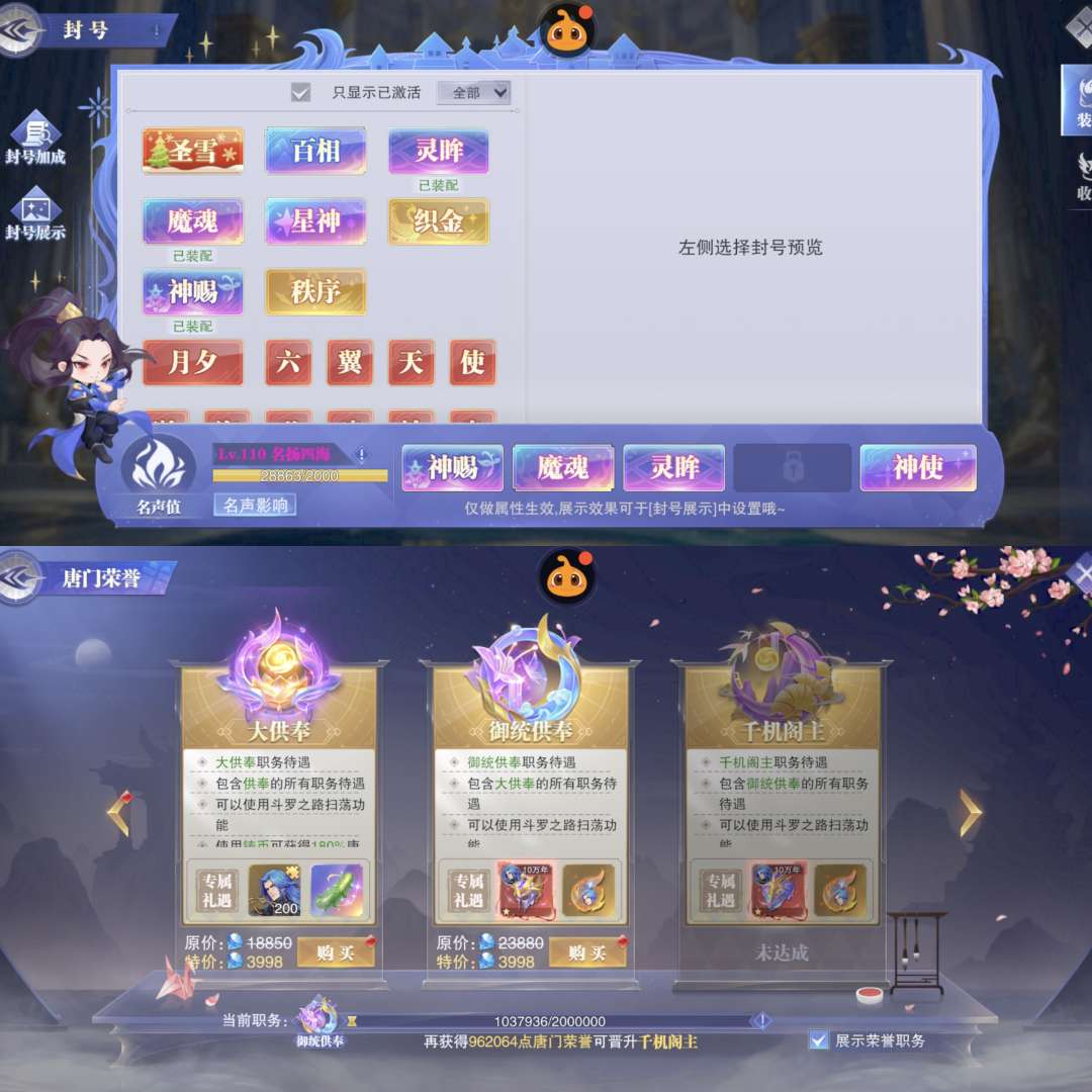 243亿战力。御统供奉。74级。灵眸 神赐 魔魂 星神 神使称号。